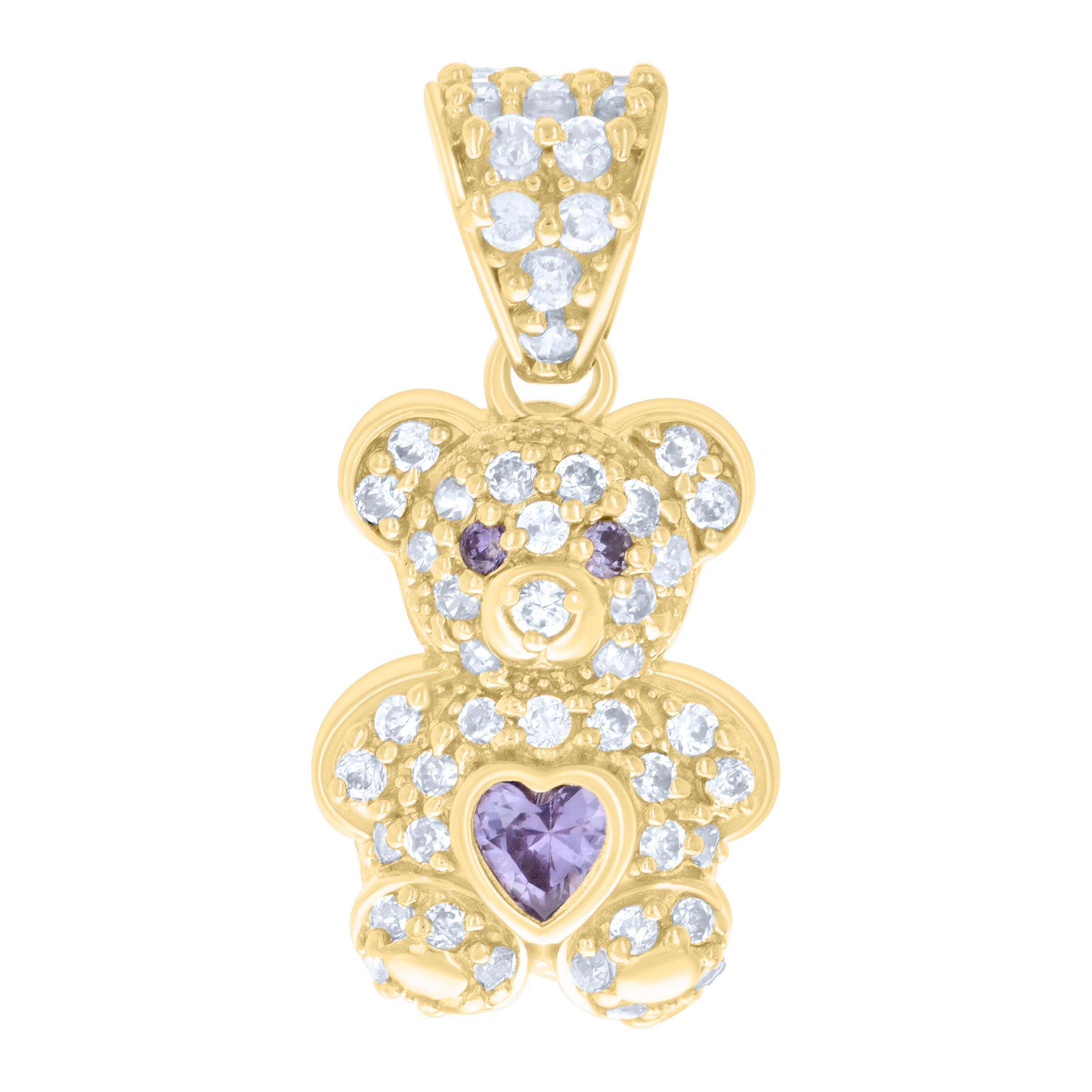 Embrace elegance with our 10Kt Gold Cz Pendant, a stunning piece crafted for the modern woman. This pendant features a delightful teddy bear charm adorned with round and heart-shaped cubic zirconia stones, embodying the playful spirit of a June birthstone. Set in polished, real yellow gold, the pendant's vibrant purple and shimmering white stones add a touch of whimsy and sophistication. Measuring a perfect 20.3mm in height and 9.7mm in width, this lightweight 1.5-gram piece is designed for comfort and style. The single bail closure ensures it rests beautifully on any chain. Elevate your jewelry collection with this charming pendant that captures the essence of youthful elegance.