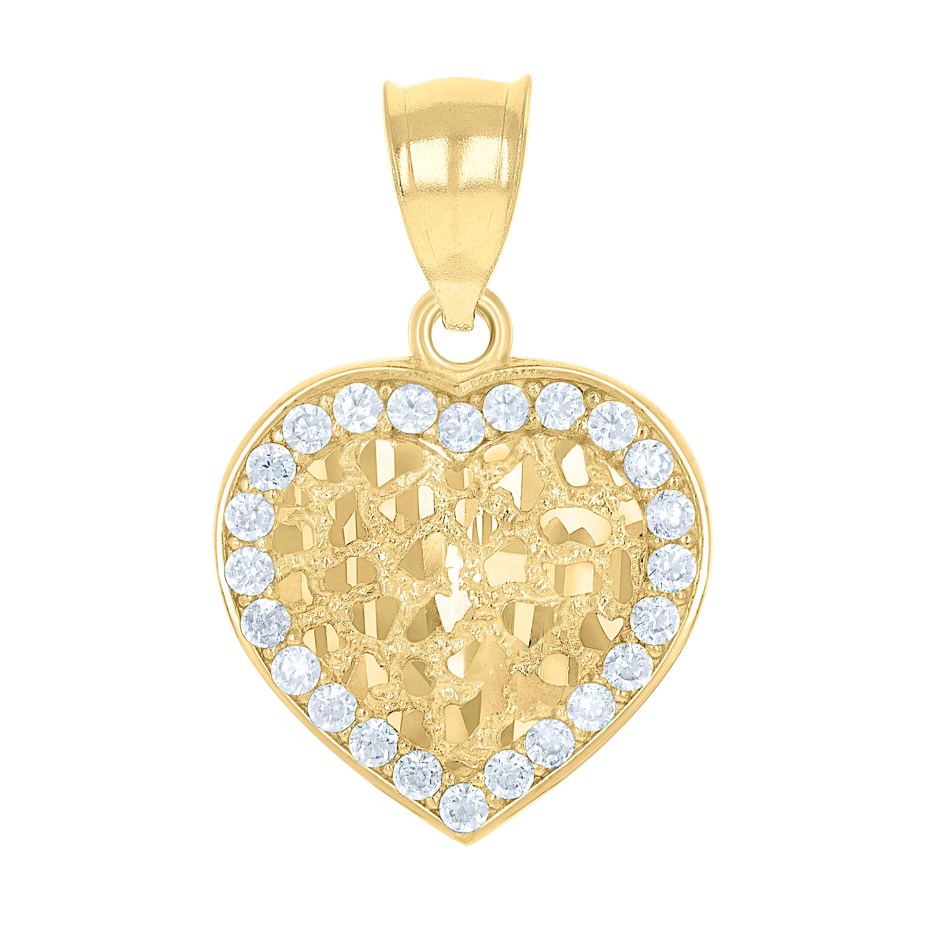 Elevate your elegance with our exquisite 10Kt Gold CZ Pendant. Crafted from genuine 10kt yellow gold, this pendant features a stunning diamond-cut finish, highlighting the intricate details of its design. Weighing a delicate 1.8 grams, it's perfect for everyday wear or special occasions. The heart charm is encrusted with brilliant, round-cut white cubic zirconia, securely set in a prong setting, ensuring maximum sparkle and charm. Measuring 24.1MM in height and 15.6MM in width, its sleek single bail closure makes it easy to pair with your favorite chain. A timeless piece for the modern woman who cherishes both luxury and subtlety. Indulge yourself or gift a loved one with this captivating pendant that promises to dazzle and delight.
