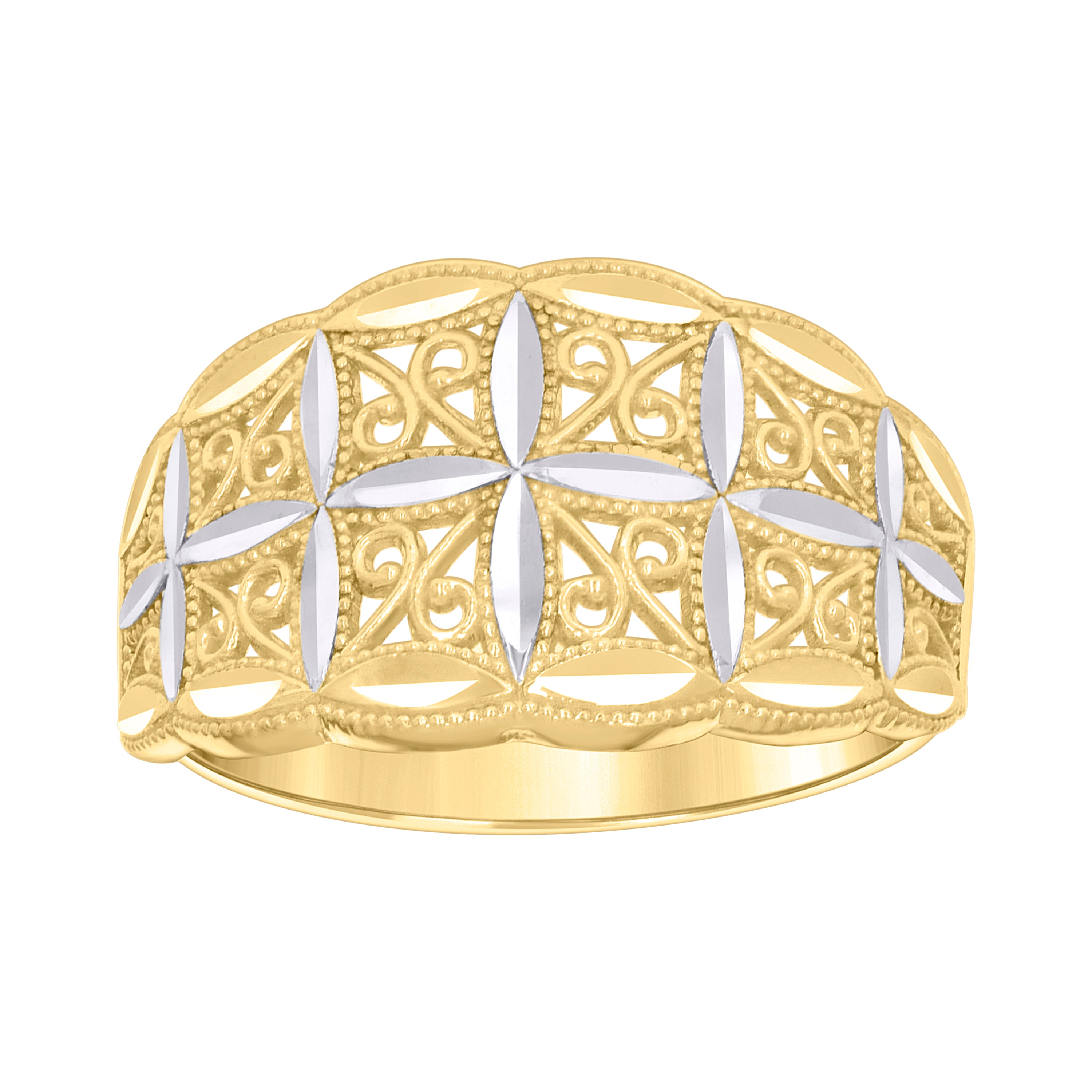 Elevate your elegance with our exquisite 10Kt Gold Cz Ring, meticulously crafted for the modern woman. This stunning piece features a captivating two-tone design, blending the warmth of yellow gold with the sophistication of white gold. The intricate filigree pattern adds a touch of vintage charm, while the diamond-cut finish ensures a brilliant sparkle from every angle.