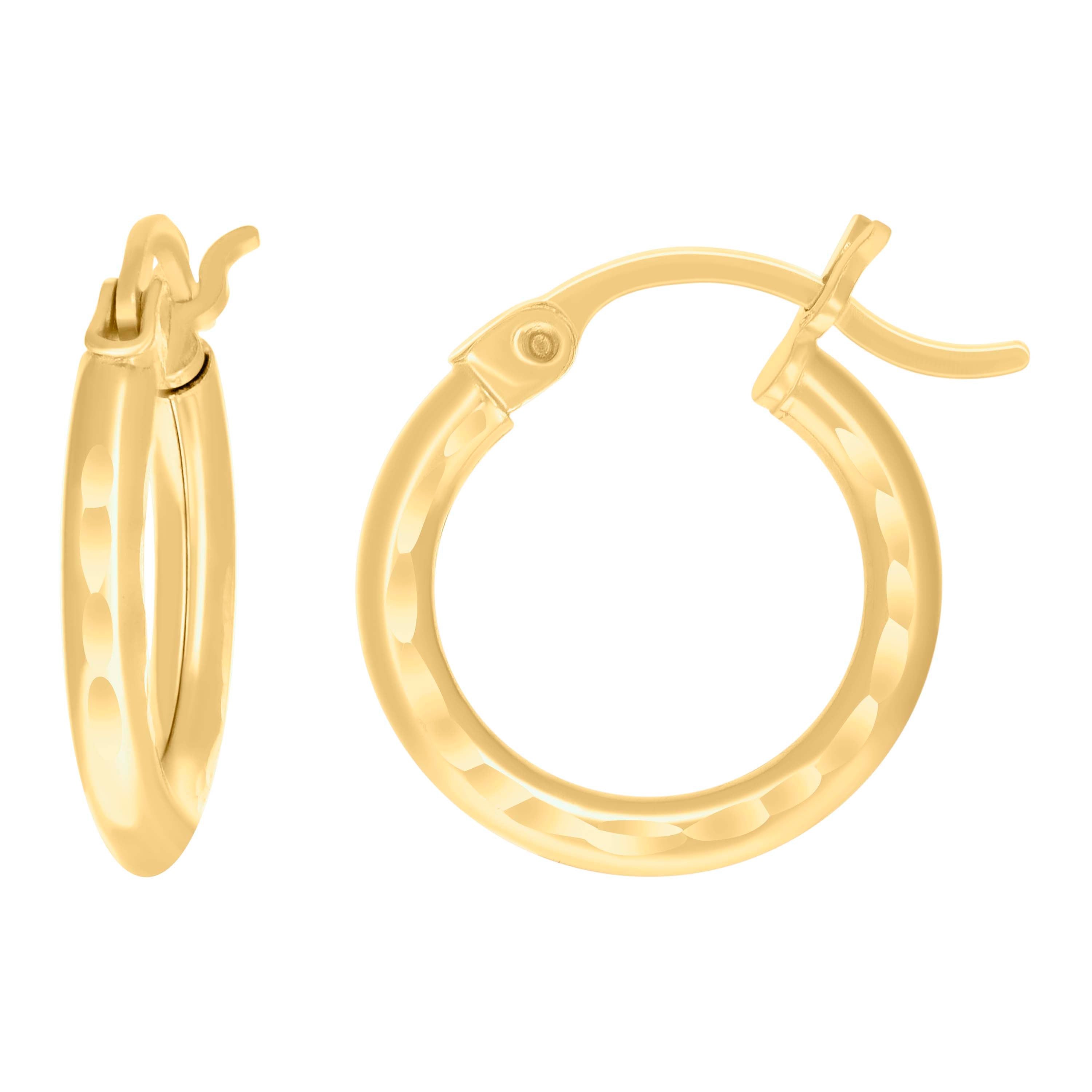 Elevate your jewelry collection with these exquisite 10kt Yellow Gold Women's Ultra Light Round Tube Hinged Hoops, artfully crafted to embody both elegance and comfort. These sophisticated huggie earrings feature a delicate diamond-cut design, adding a touch of sparkle and sophistication to any ensemble. With a lightweight construction of just 1.1 grams, these hoops offer effortless wear for all-day comfort. The round tube structure, with dimensions of 2mm by 14mm, ensures a sleek and modern profile that complements any style. The hinged back closure provides a secure fit, allowing you to wear them with confidence. Measuring 18.8 mm in height and 15.5 mm in width, these hoops are the perfect size to make a subtle yet striking statement. Ideal for both casual wear and special occasions, these timeless earrings are a must-have for any jewelry connoisseur. Embrace the understated elegance of these classic hoops and add a touch of sophistication to your look.