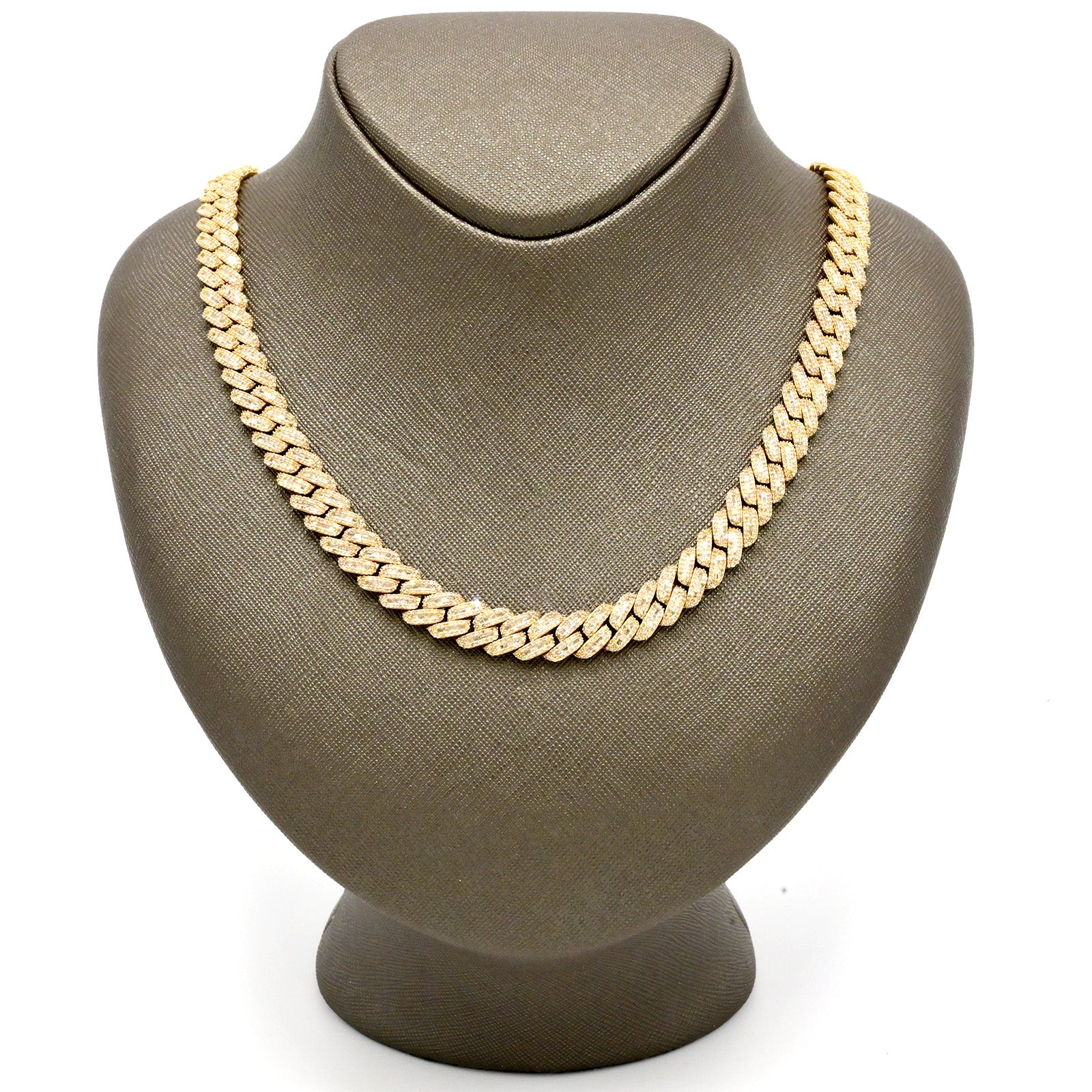 Command attention with this magnificent 10k yellow gold Cuban link chain, showcasing an impressive 19 carats of natural baguette diamonds throughout its bold 10mm links. Measuring 21 inches and weighing 53.7 grams, this necklace delivers uncompromising luxury and presence. The baguette diamonds are expertly integrated into the iconic Cuban link design, creating a continuous cascade of geometric sparkle that radiates confidence and refinement. The substantial yellow gold construction provides exceptional durability while maintaining a warm, lustrous finish. Perfect for those who embrace bold statements without sacrificing sophistication, this chain serves as a powerful centerpiece that elevates any ensemble. An investment-worthy piece that celebrates exceptional craftsmanship and enduring style.