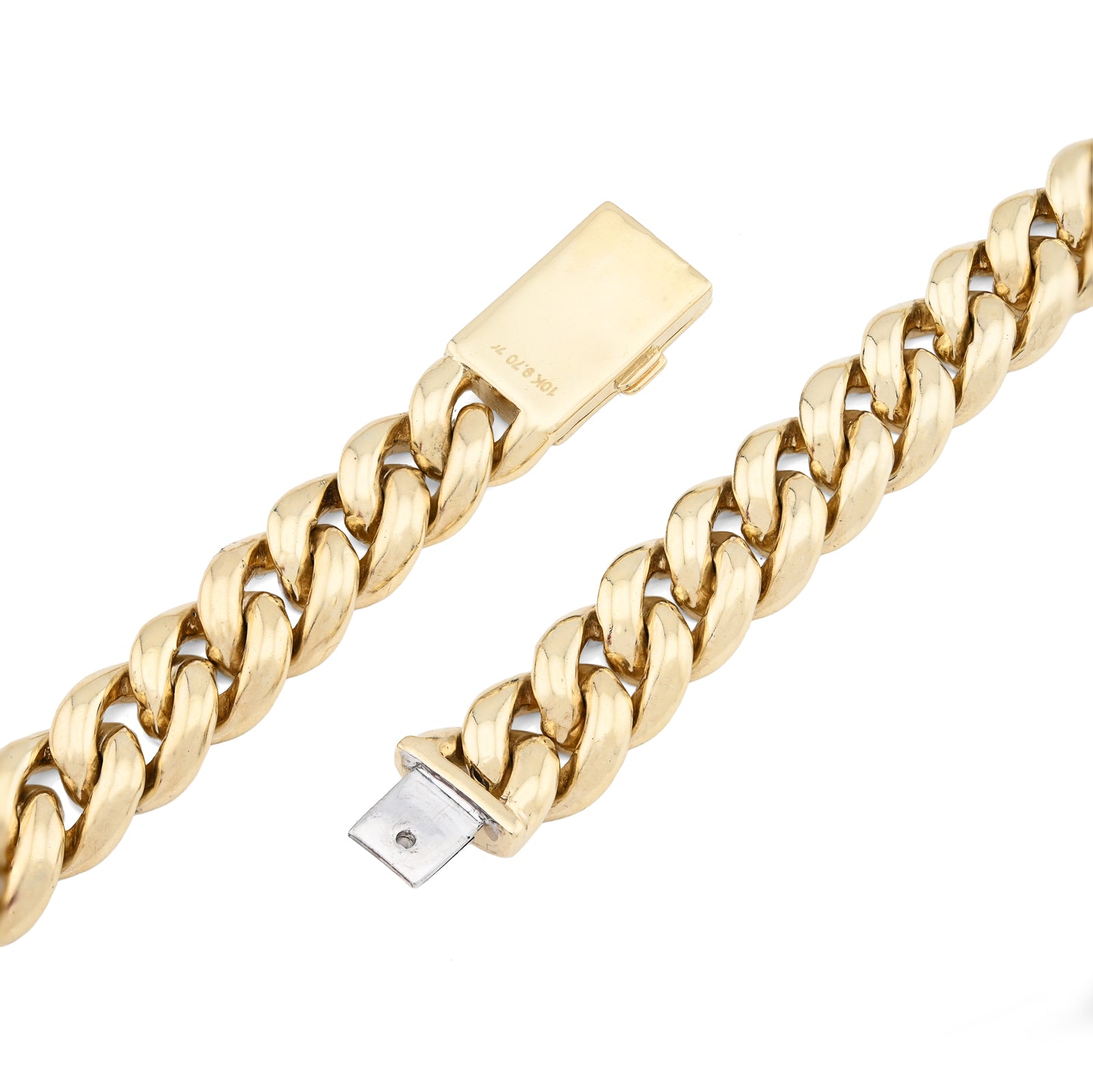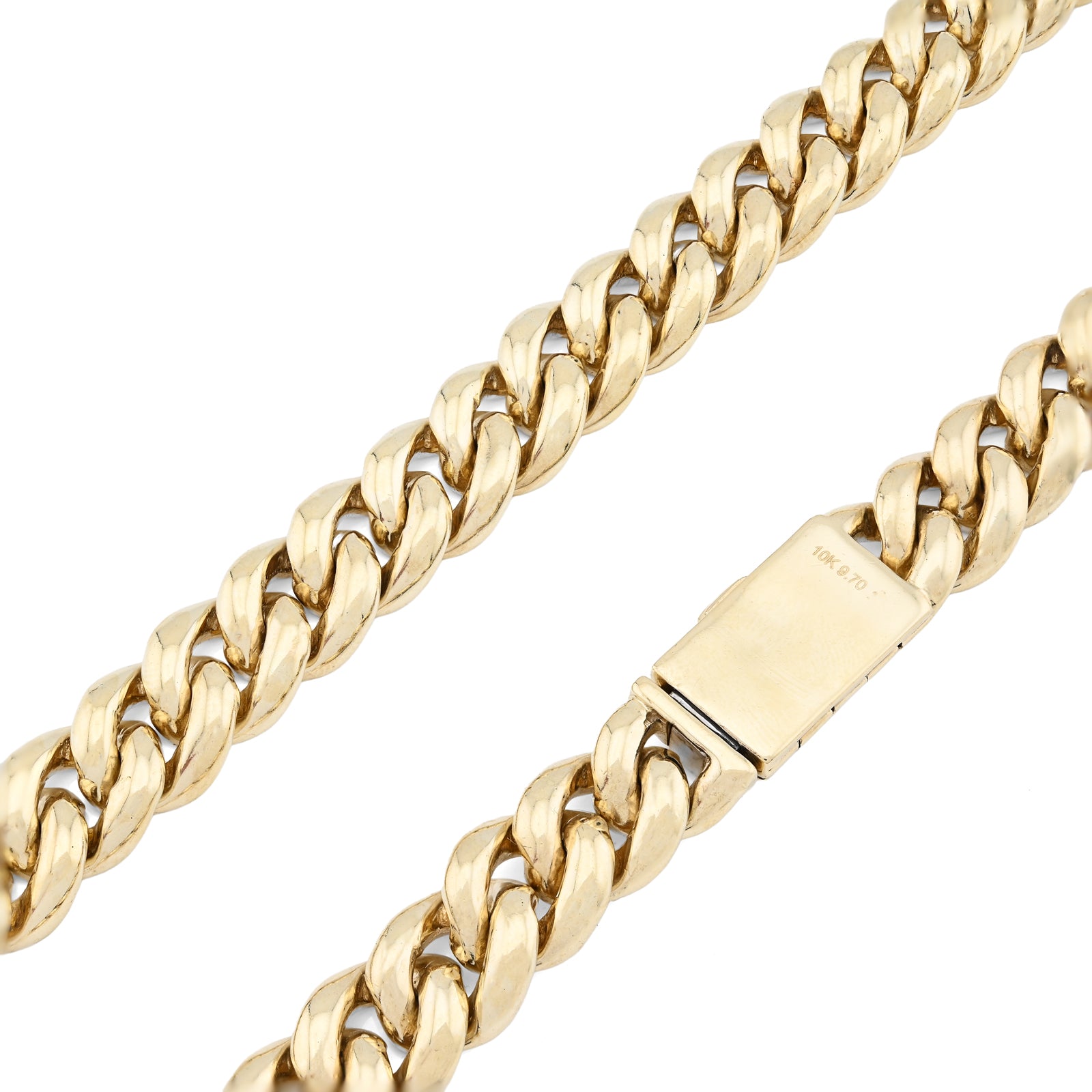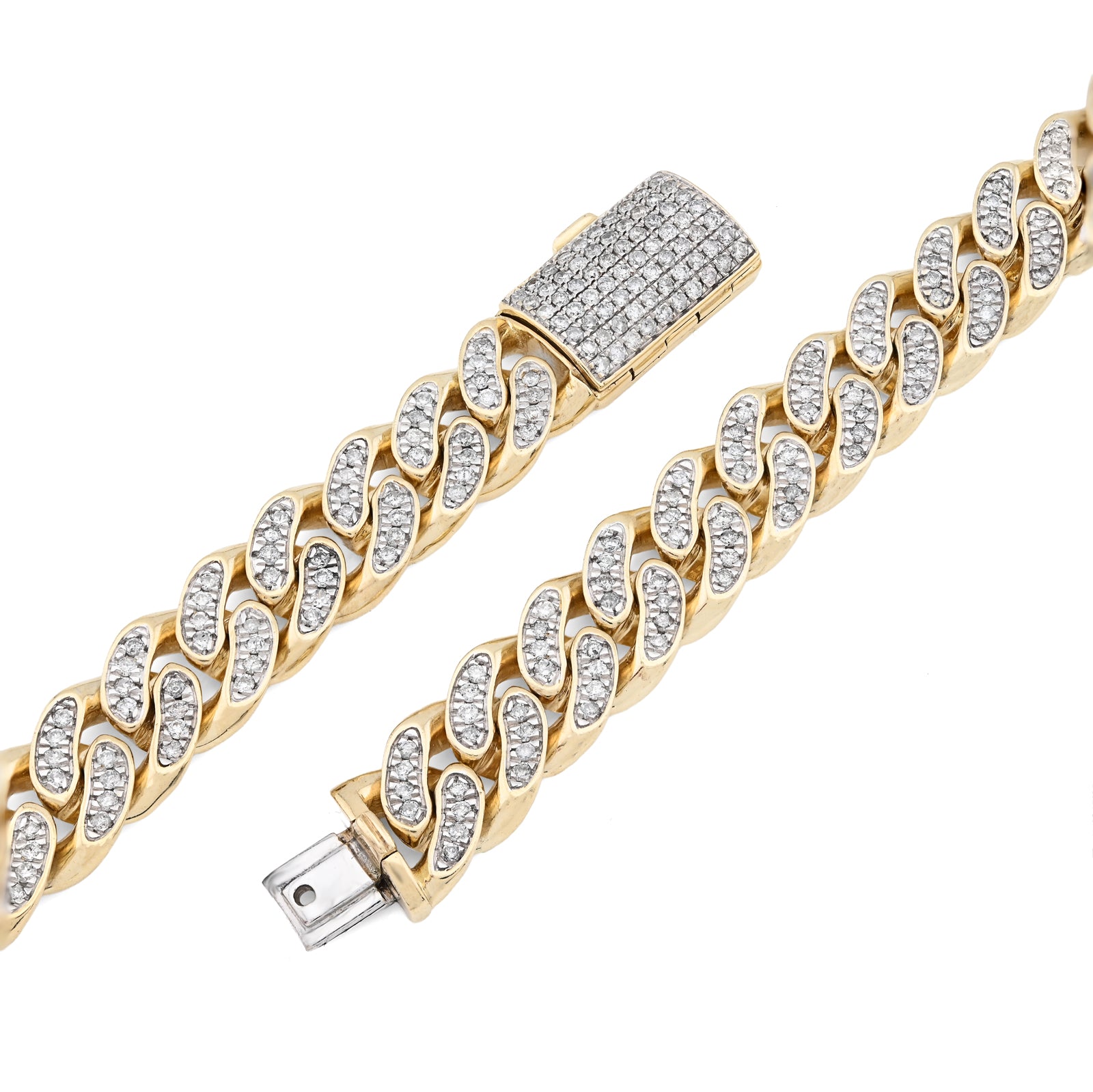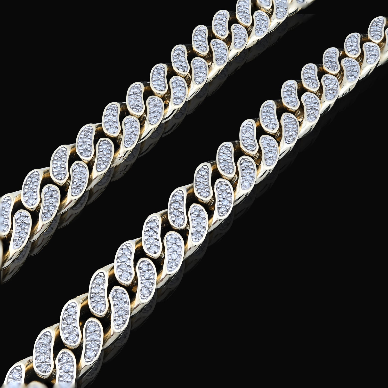 Dominate with this extraordinary 10k yellow gold Cuban link chain necklace, a pinnacle of masculine luxury and refined artistry. The commanding 11.5mm links showcase the iconic Cuban pattern with imposing presence, while 9.7 carats of natural diamonds elevate this piece beyond conventional jewelry into the realm of investment-grade craftsmanship. Each diamond is meticulously set to maximize brilliance, creating an uninterrupted cascade of radiance along the neckline. Weighing an impressive 128.6 grams, this chain delivers undeniable presence and quality construction that affirms genuine materials and exceptional attention to detail. The warm, lustrous finish of 10k yellow gold provides an elegant foundation that complements the diamond settings while developing rich character with time. The Cuban link design remains perpetually relevant, functioning seamlessly across casual and formal occasions alike. This necklace represents a definitive statement for those who embrace uncompromising luxury—a wearable declaration of success, power, and refined taste in fine jewelry.