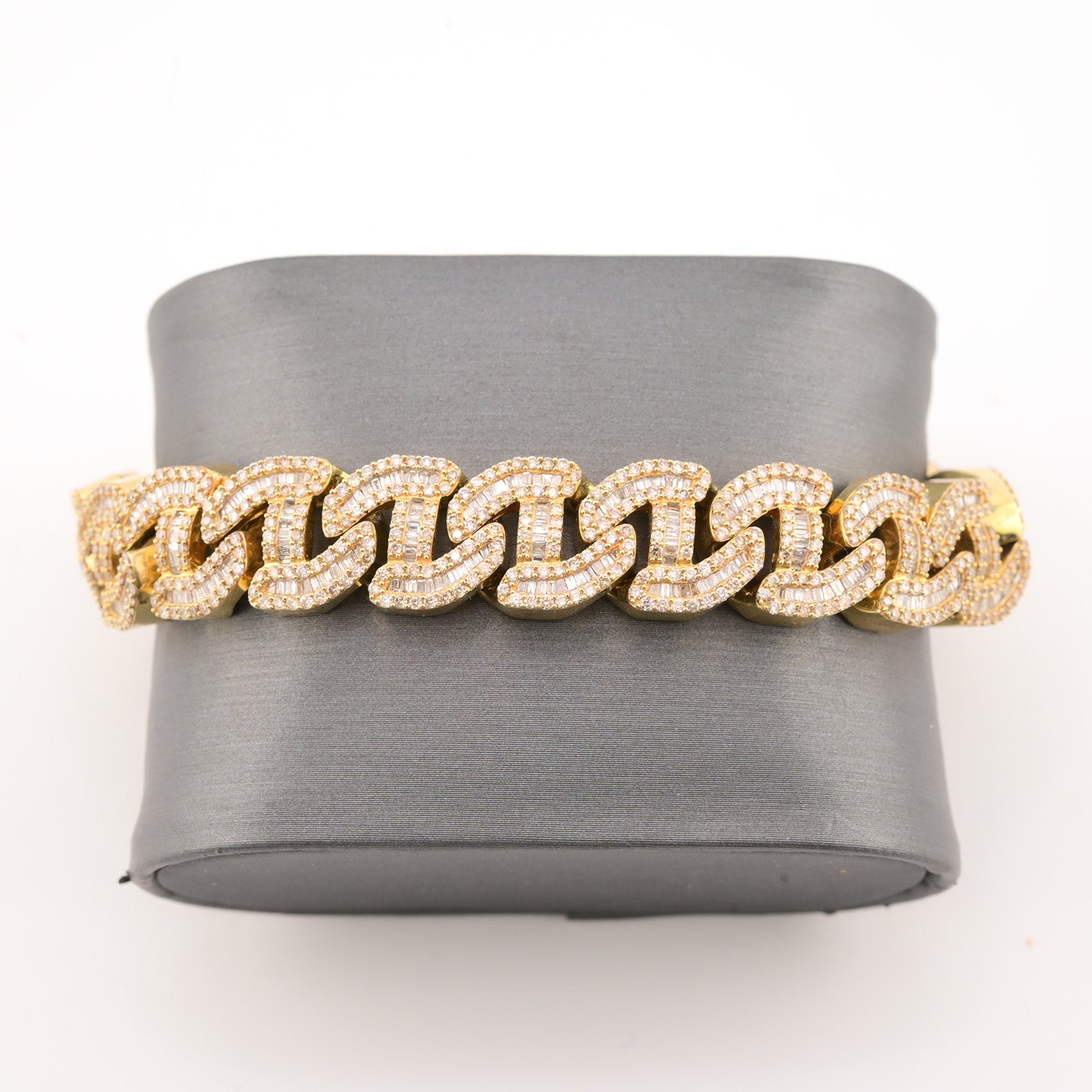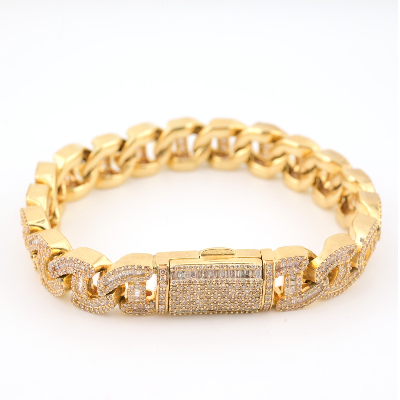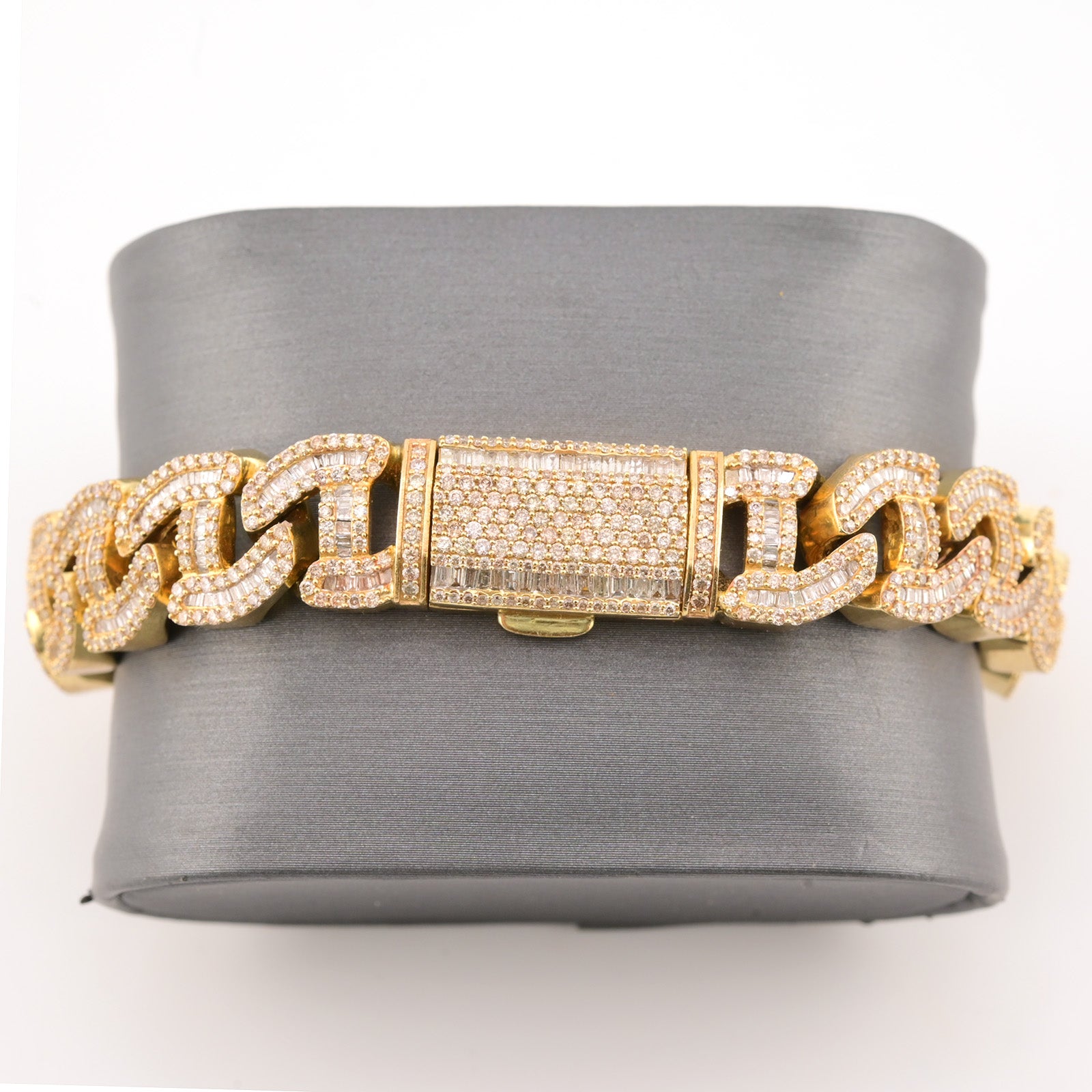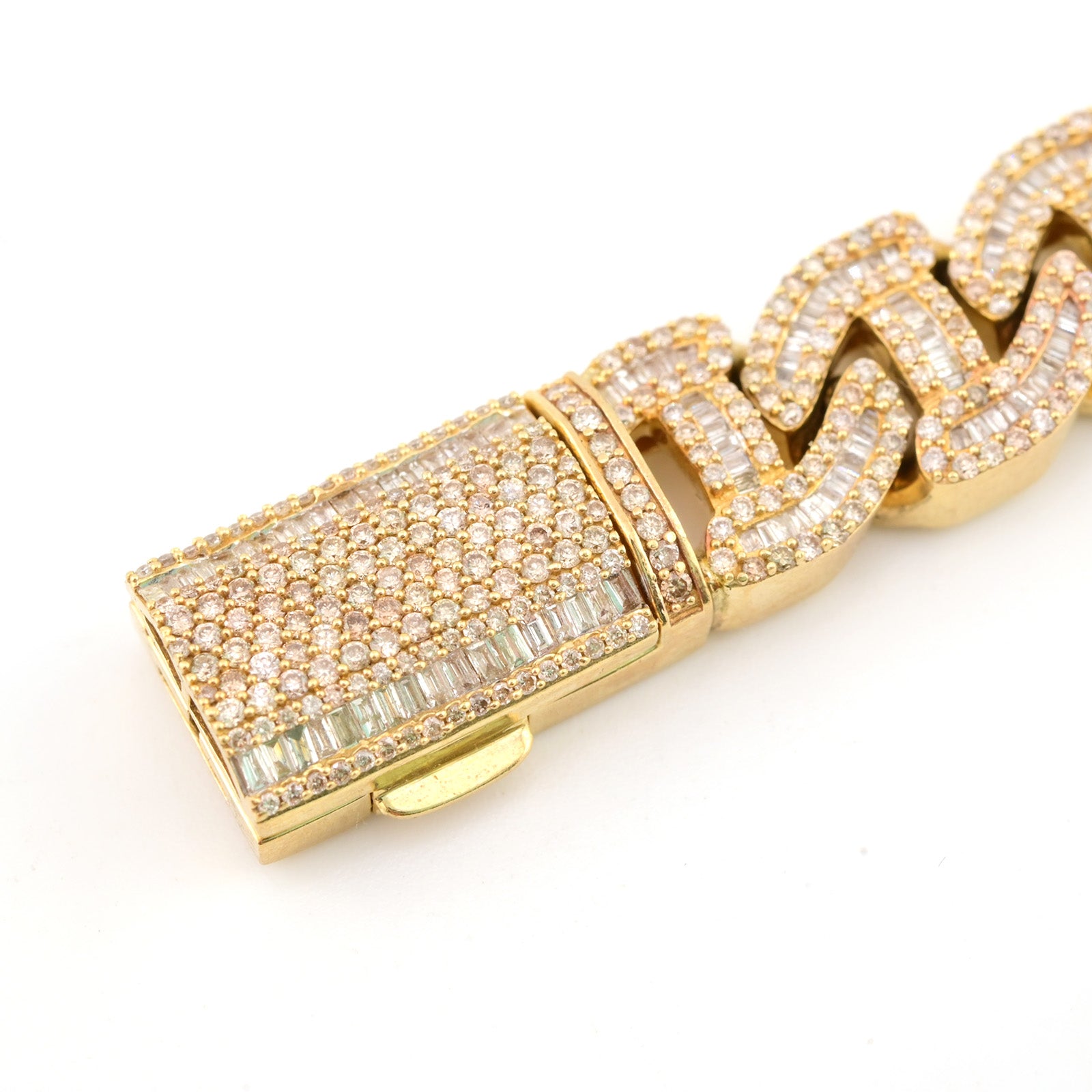 This 12mm Miami Style Cuban bracelet is crafted in solid 10k yellow gold, weighing 58.8 grams for robust durability and luxurious heft. Featuring 10.5 carats total weight of pure, expertly set diamonds, it offers exceptional brilliance and refined elegance. Measuring 8.5 inches, it provides a comfortable fit while making a bold statement with its classic yet sophisticated design, ideal for collectors and connoisseurs seeking timeless luxury.