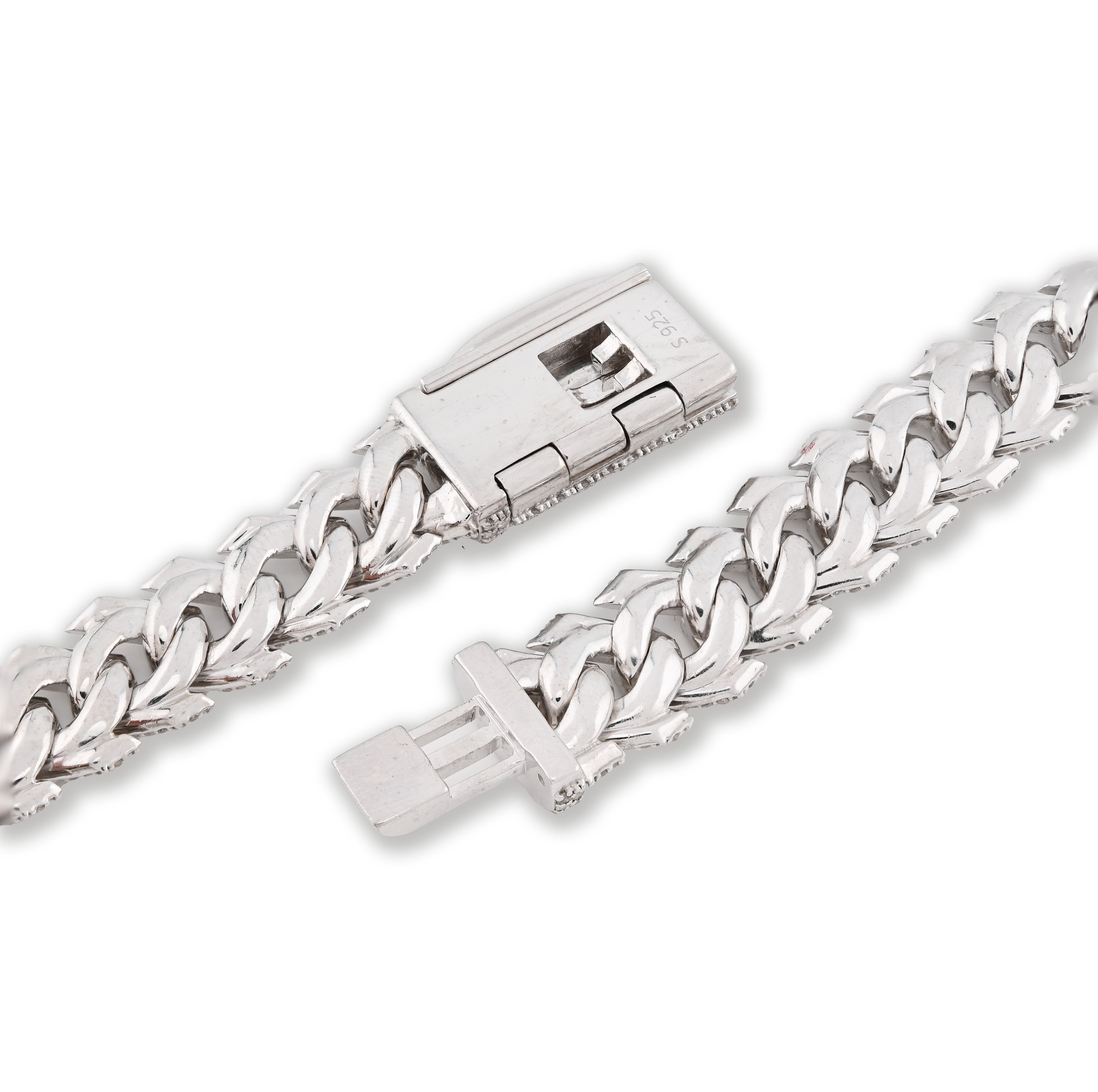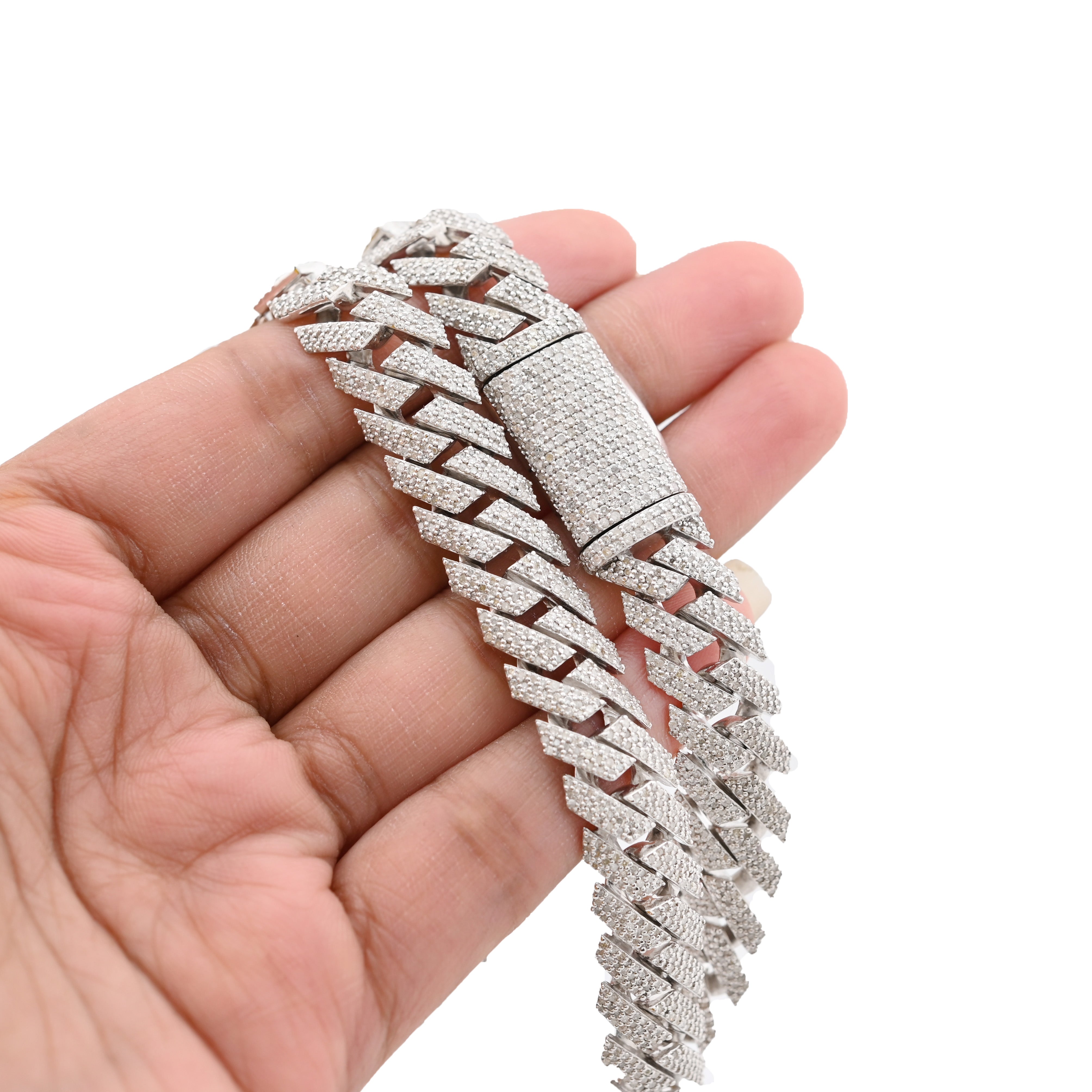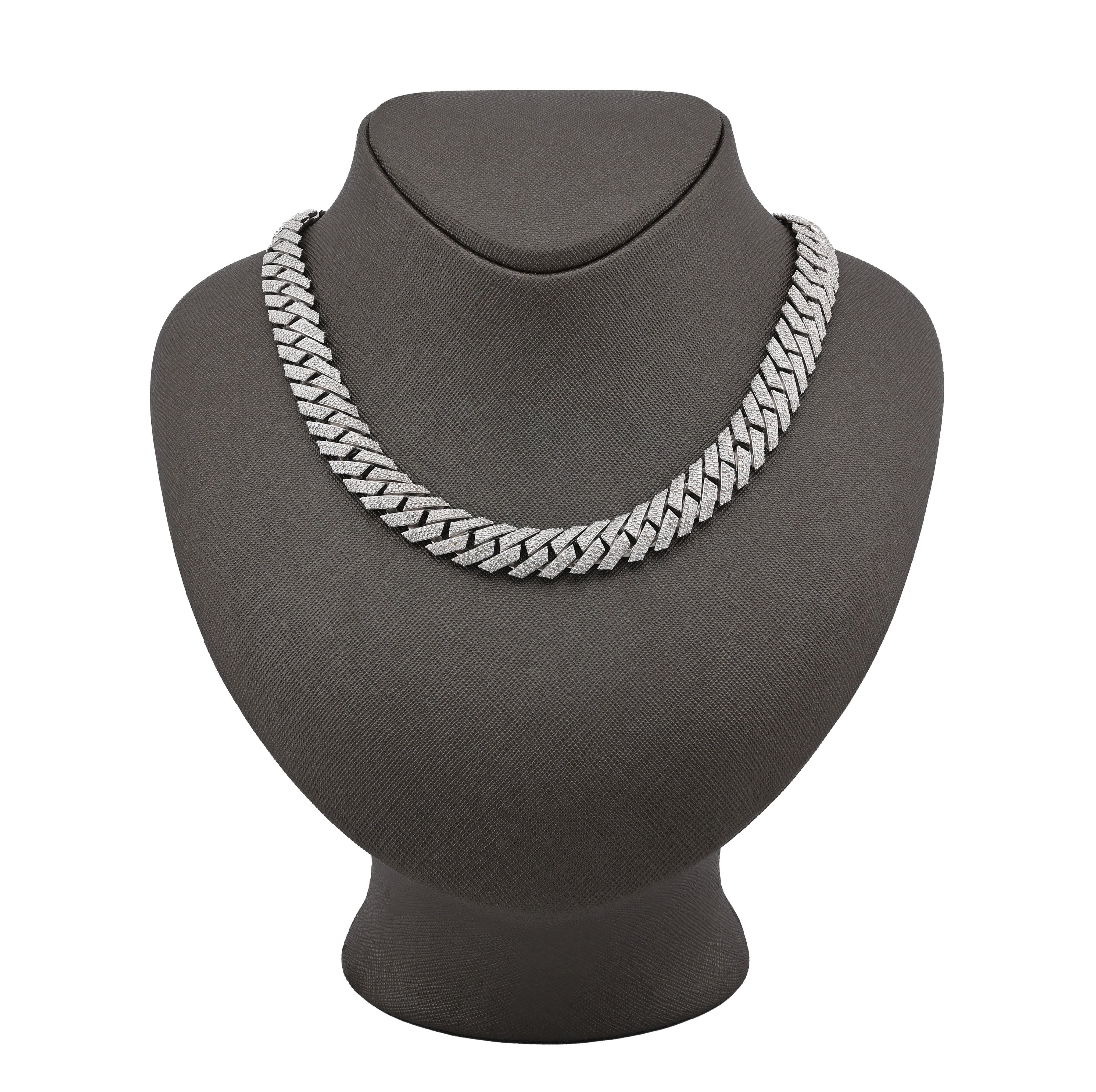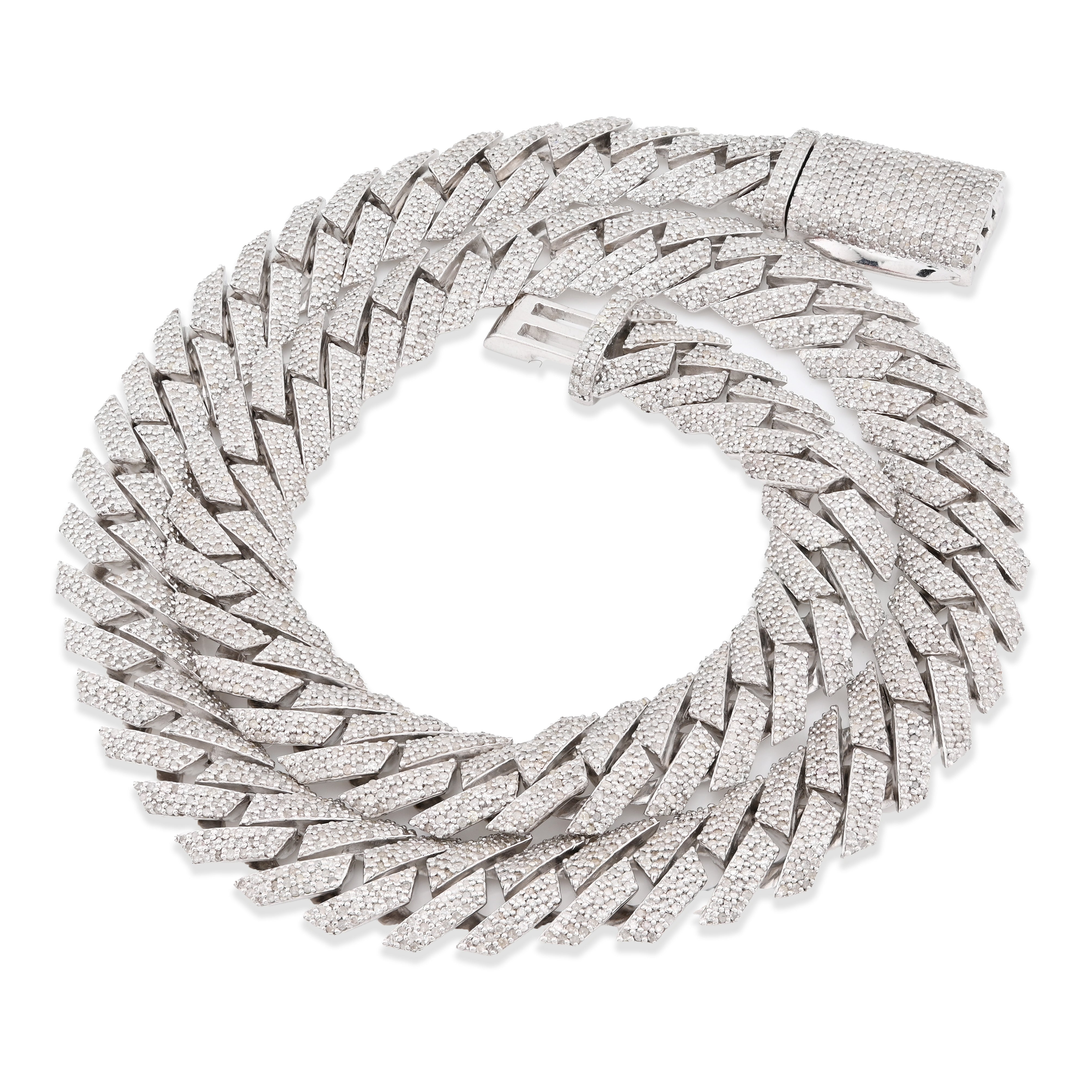 Embrace bold elegance with this striking 12mm snake Cuban chain in sterling silver, adorned with 14.83 carats of natural diamonds. The 18-inch length and substantial 96.7-gram weight create an impressive, statement-making piece that exudes confidence and refinement. Natural diamonds showcase unique character and enduring value, while the wider link profile delivers visual impact and presence. Sterling silver's lustrous finish beautifully complements the diamond sparkle, creating a harmonious interplay of light and luxury. The distinctive snake Cuban design offers contemporary flair with classic appeal. An exceptional investment for those seeking a necklace that transcends trends and celebrates timeless sophistication.