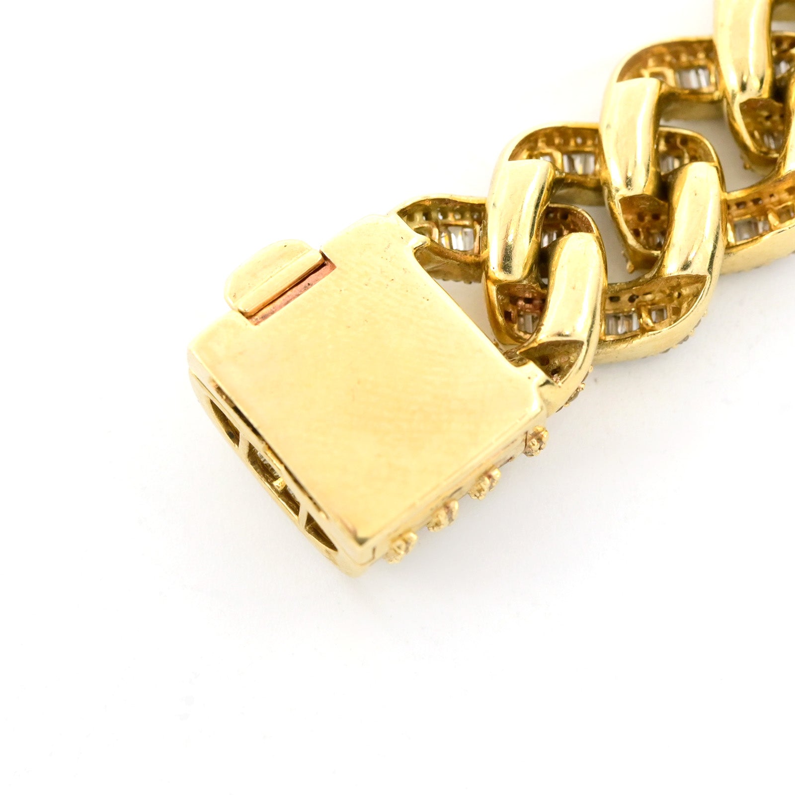 This 13mm Cuban bracelet is crafted in 10k yellow gold, weighing 48.1 grams for a substantial yet comfortable feel. It features 11 carats total weight of expertly set round and baguette diamonds, delivering a striking balance of brilliance and geometry. Measuring 8.5 inches, this piece combines classic craftsmanship with bold elegance, making it a refined statement accessory suited for discerning collectors.