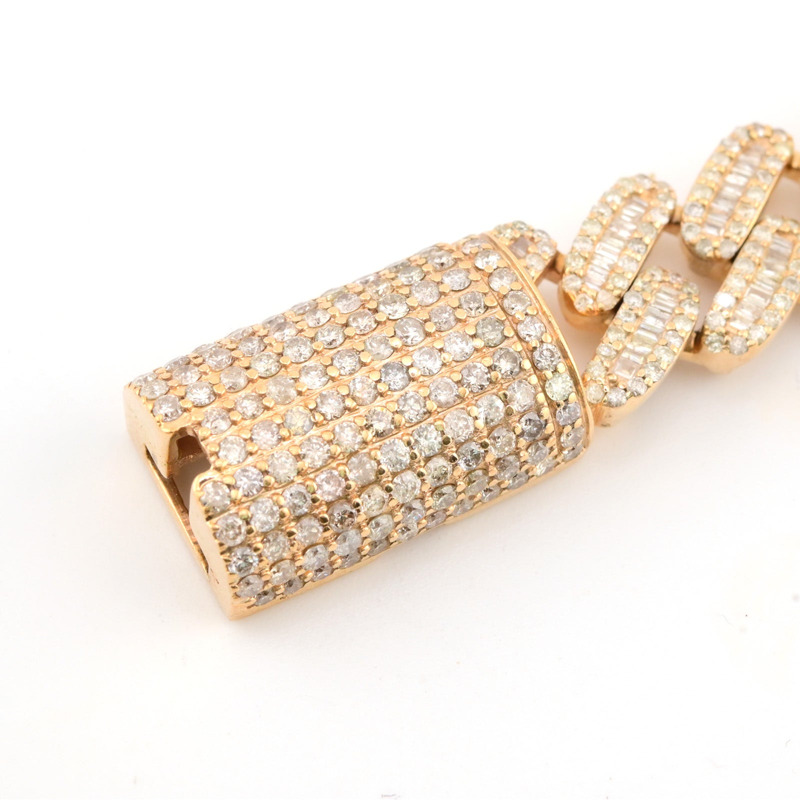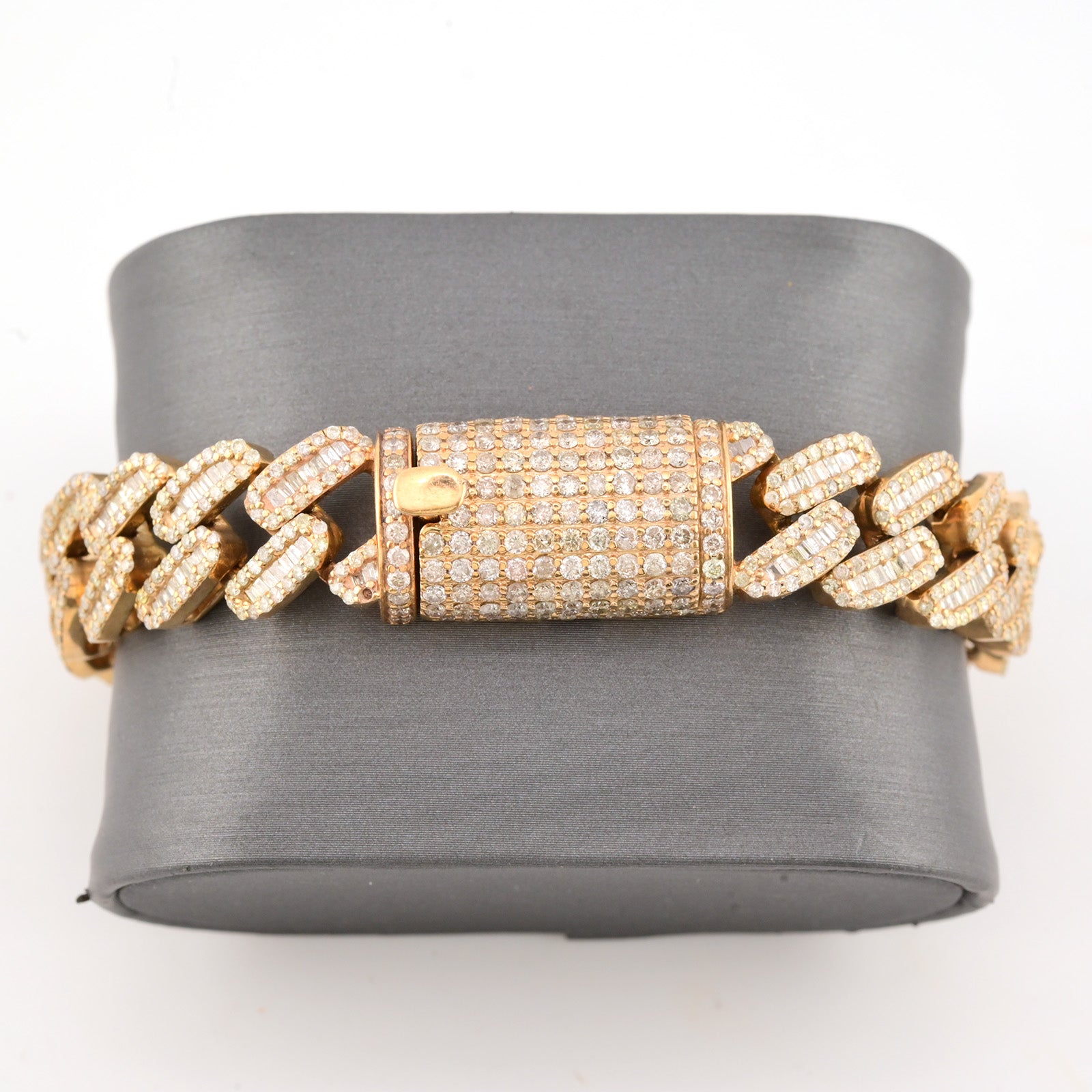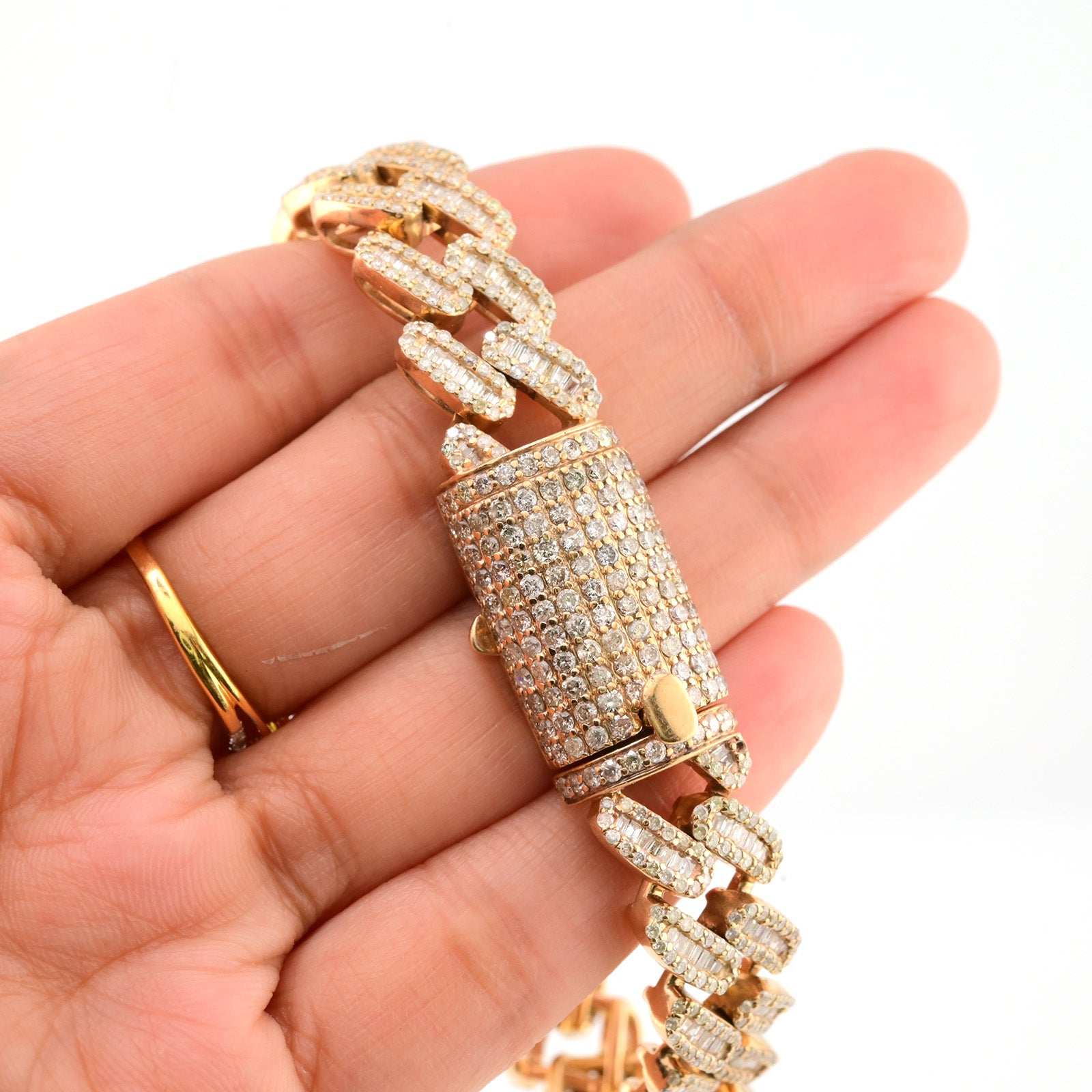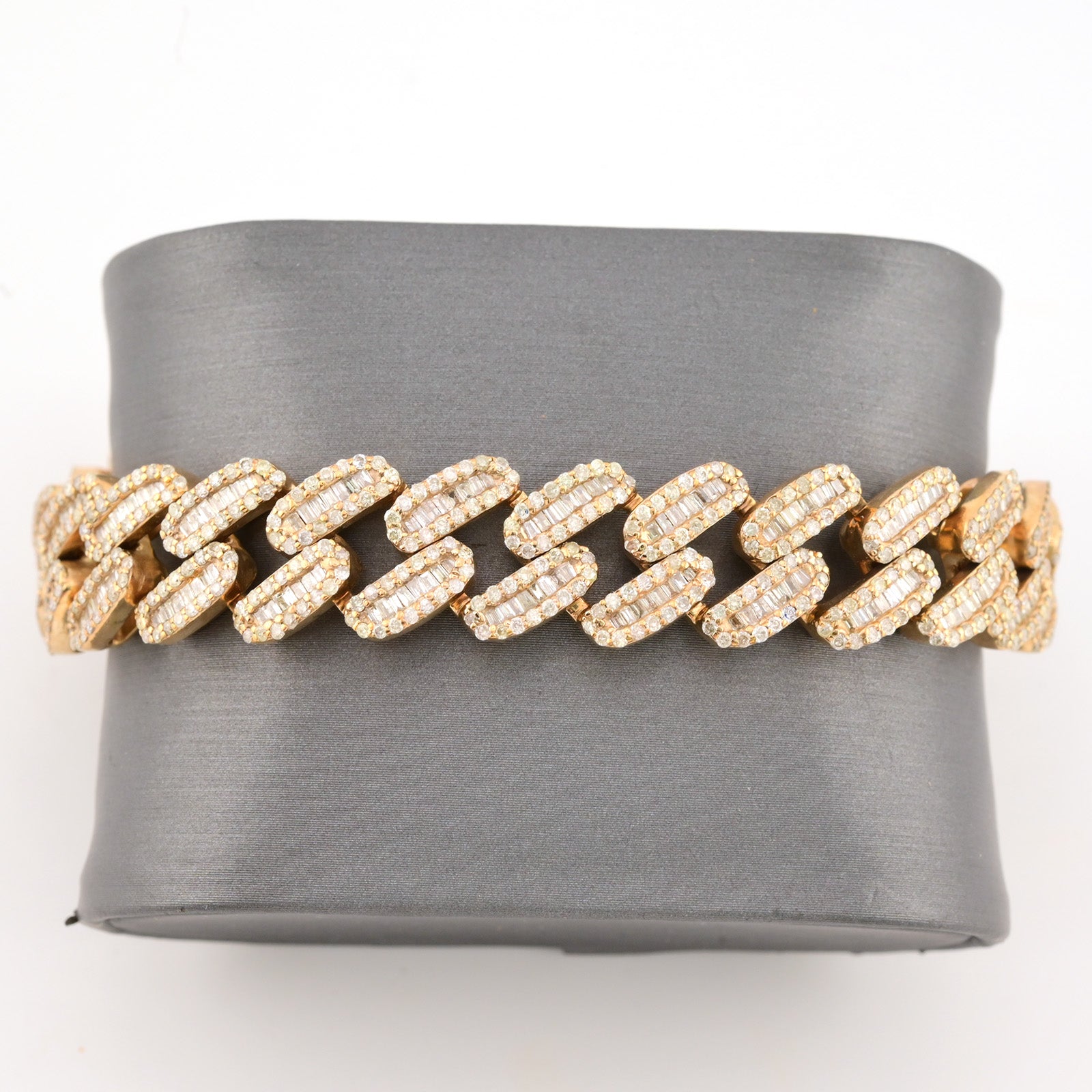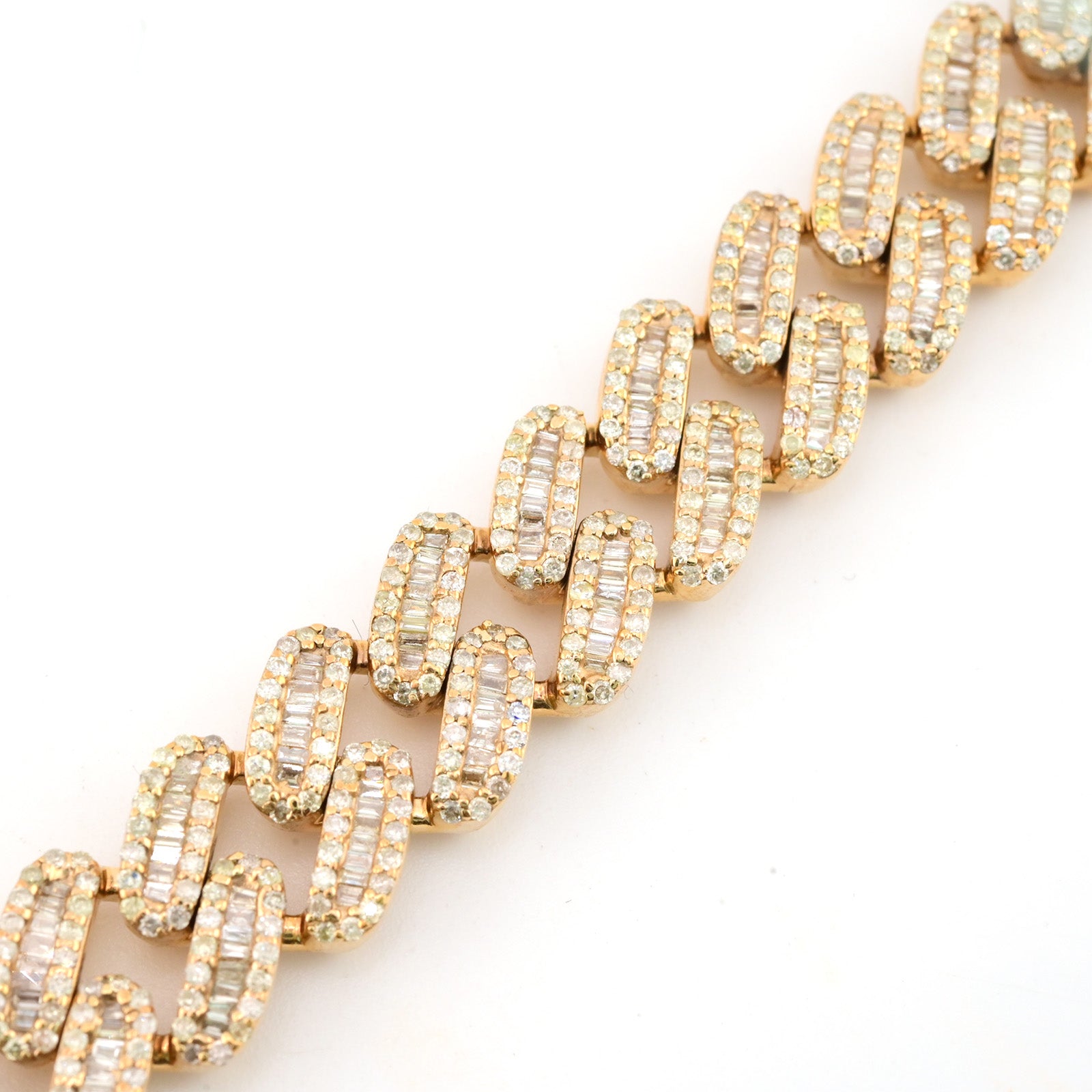 This 13mm Cuban bracelet is crafted from 10k yellow gold and weighs 55.7 grams, offering substantial presence and durability. Featuring a total of 12 carats of expertly set pure round and baguette diamonds, it combines classic brilliance with a contemporary design. Measuring 8 inches in length, this bracelet balances bold style with refined craftsmanship, making it a sophisticated statement piece for discerning collectors.