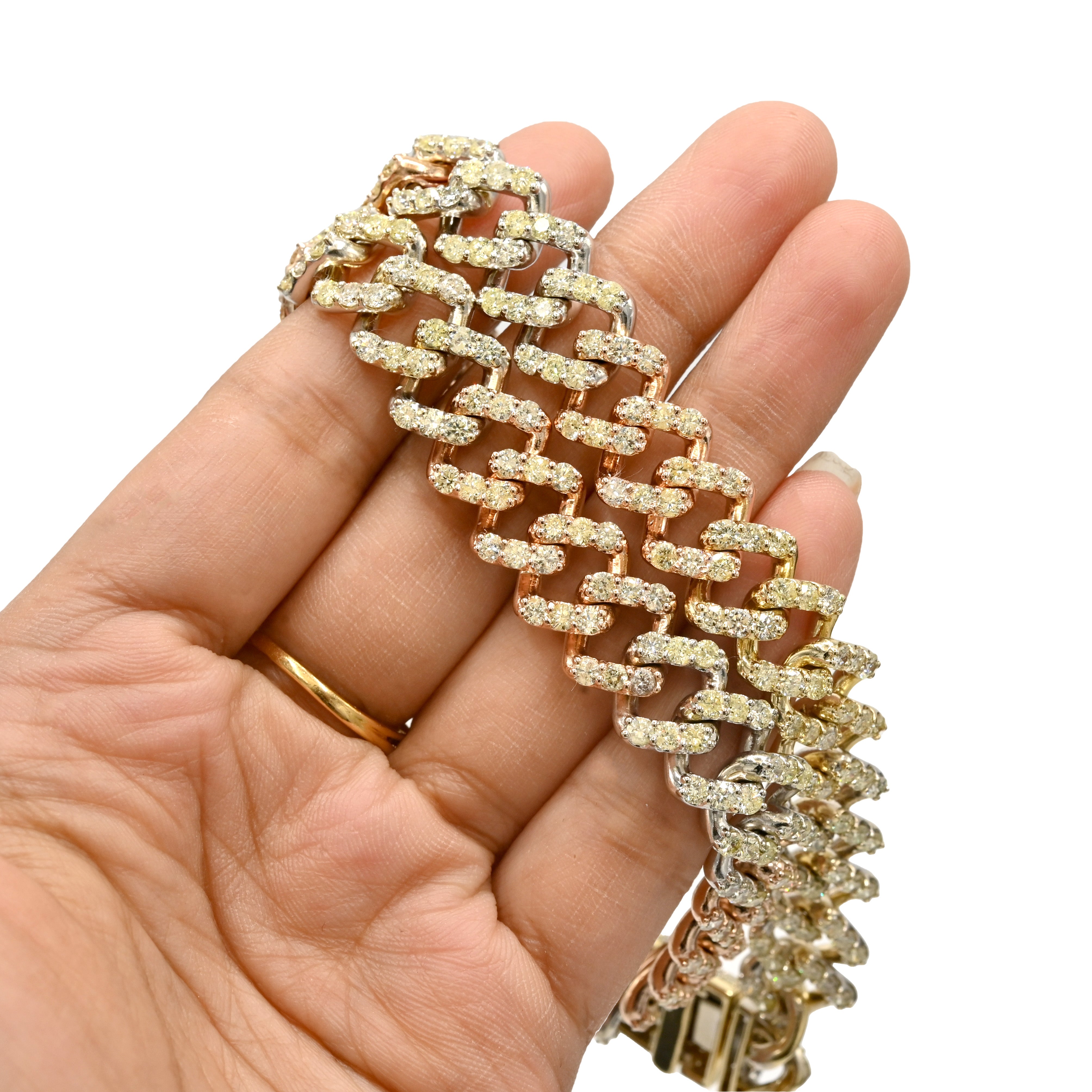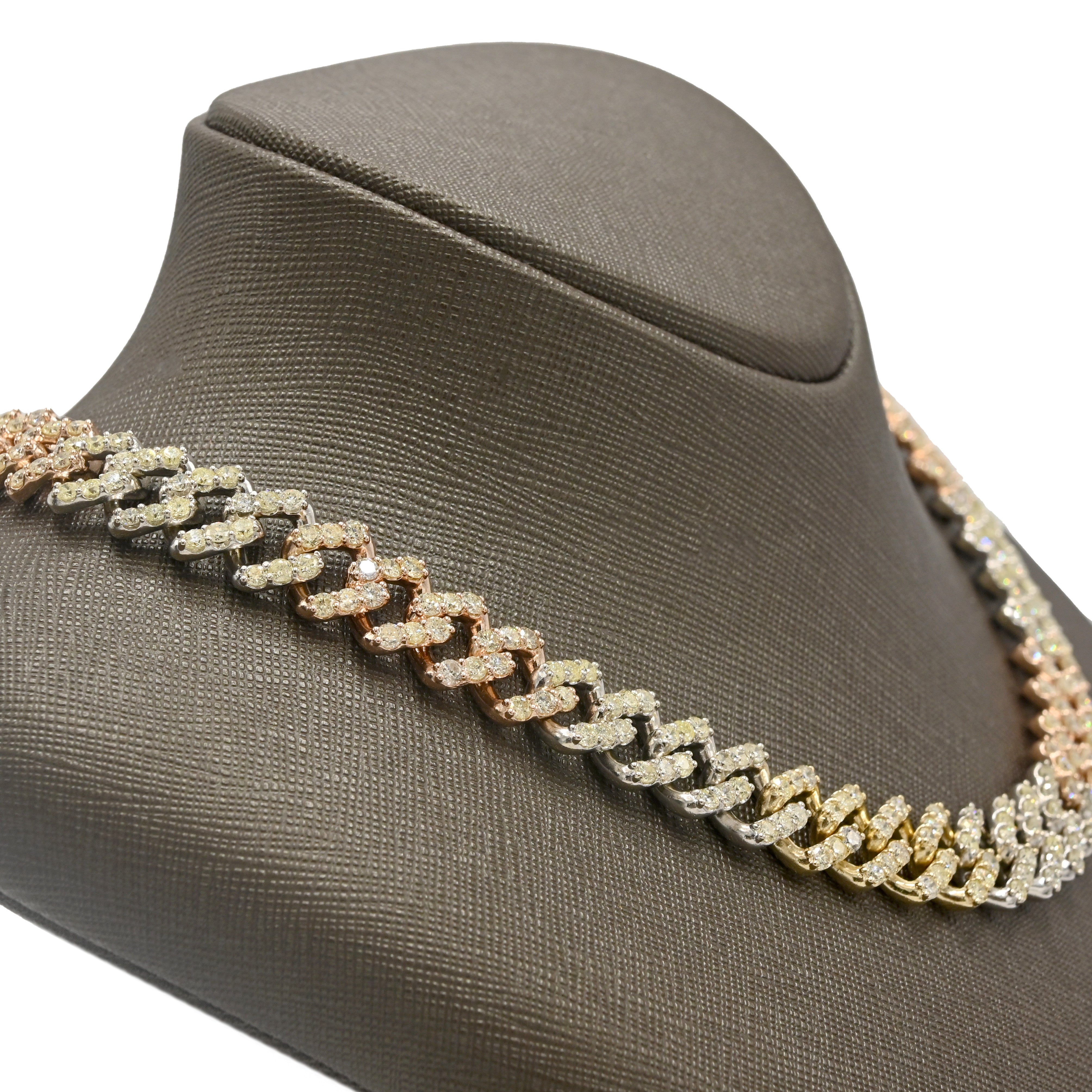 Make an unforgettable impression with this commanding 10k two-tone gold Cuban link chain, blending warm yellow and rose gold in a sophisticated 13mm design. Featuring 16 carats of natural diamonds and spanning 20 inches at an impressive 83 grams, this necklace epitomizes luxury and presence. The natural diamonds are expertly woven throughout the iconic Cuban links, creating a mesmerizing interplay of light and dimension. The dual-tone gold palette adds contemporary elegance while maintaining timeless appeal, offering remarkable versatility across any occasion. This substantial piece celebrates bold artistry and exceptional craftsmanship, making it an ideal choice for discerning collectors who appreciate statement-making jewelry. A transformative investment that commands respect and admiration.