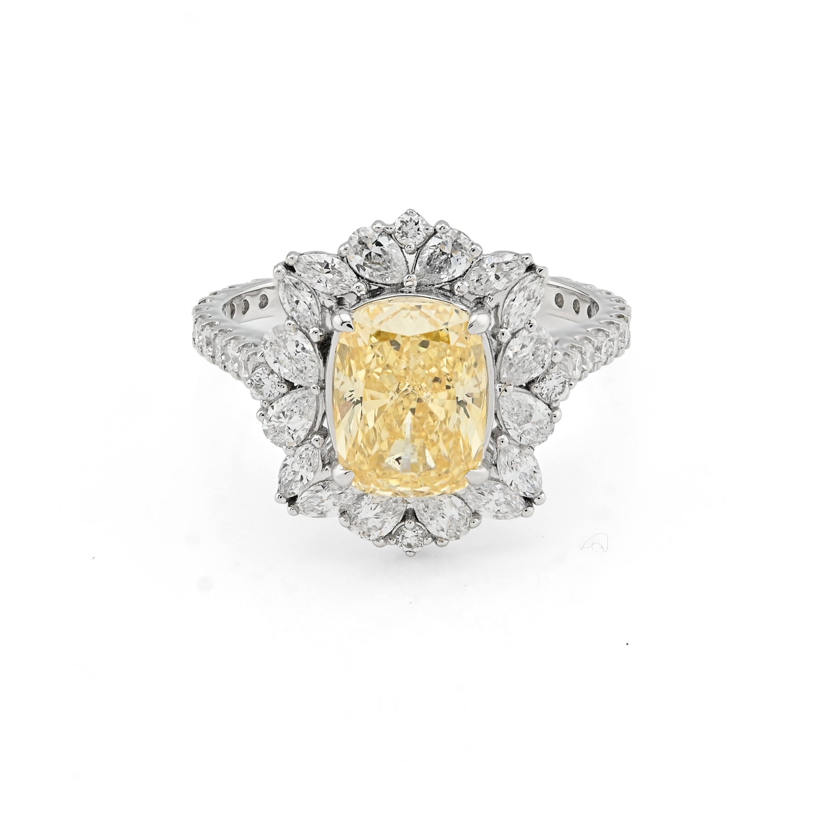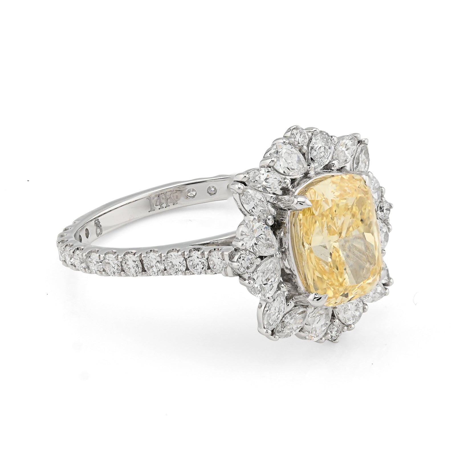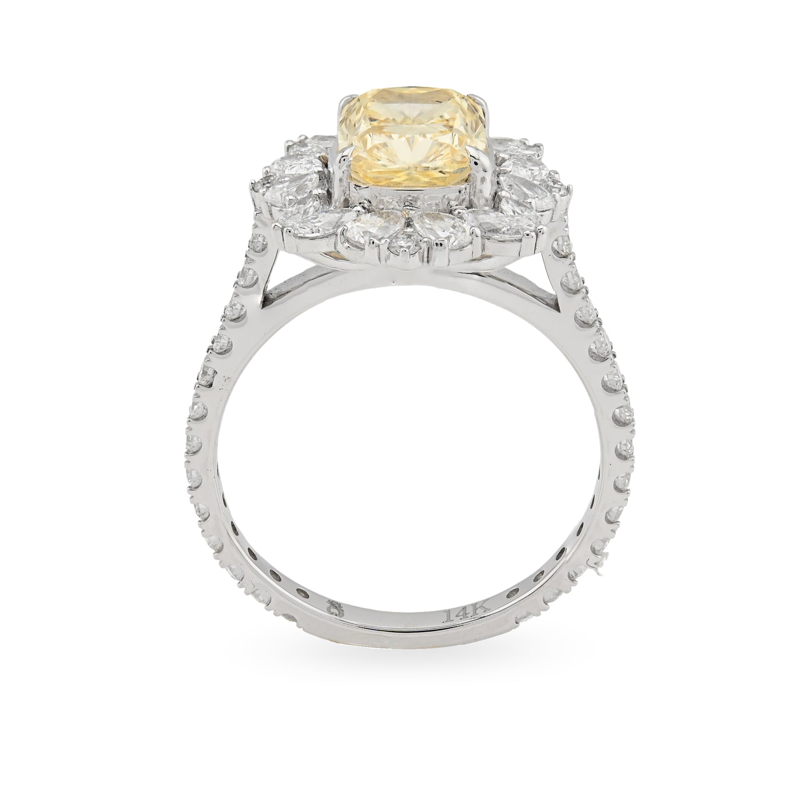 Make a luminous statement with this exquisite 14k white gold ring, featuring a radiant yellow oval lab diamond solitaire complemented by an elegant pear-shaped stone accent. Weighing 3.9 grams, this refined piece showcases 3.15 carats of lab diamond brilliance that radiates warmth and sophistication. The cool white gold provides striking contrast to the warm yellow stone, creating a captivating color interplay. An exceptional choice for those seeking an engagement or cocktail ring that celebrates individuality through distinctive gemstone selection and premium craftsmanship.