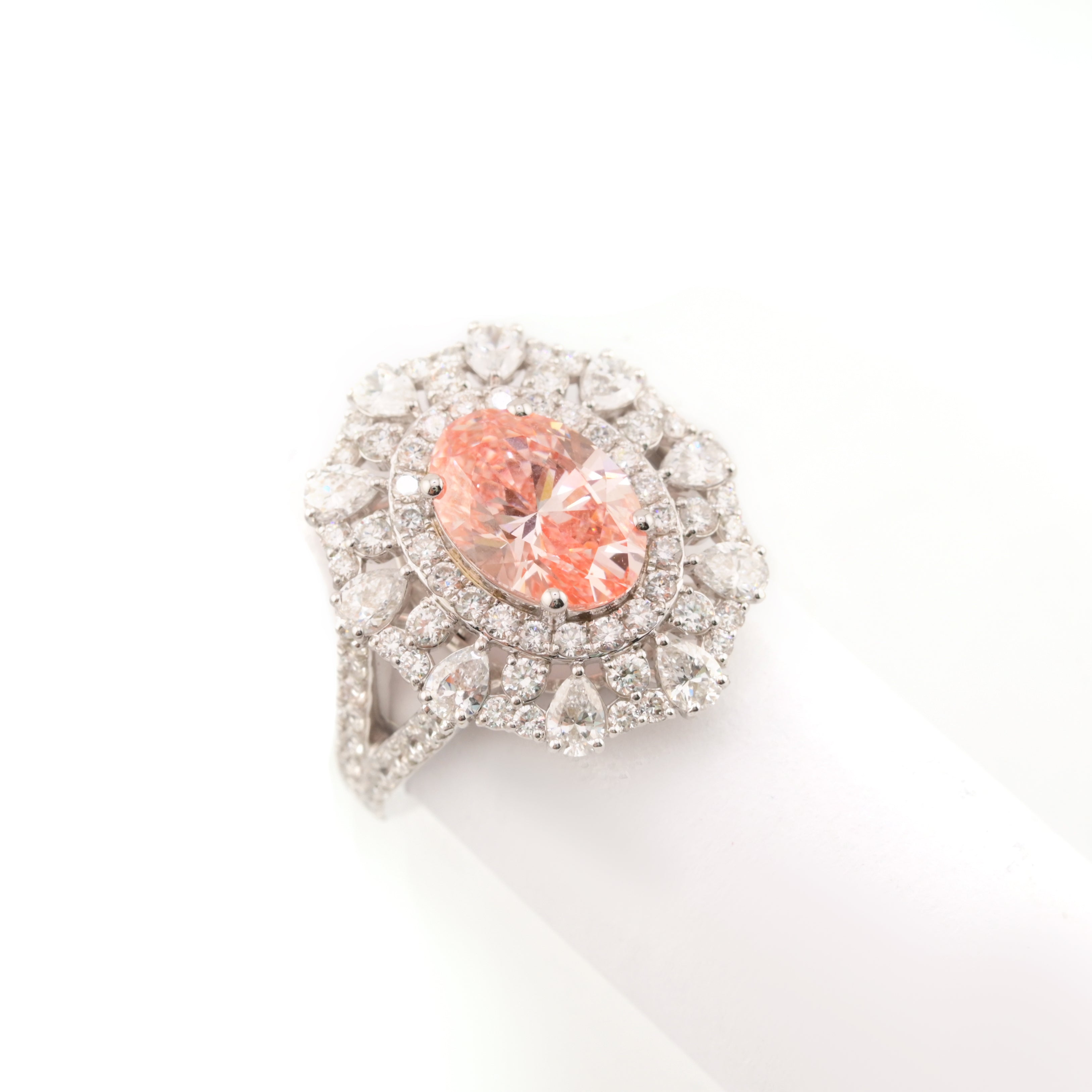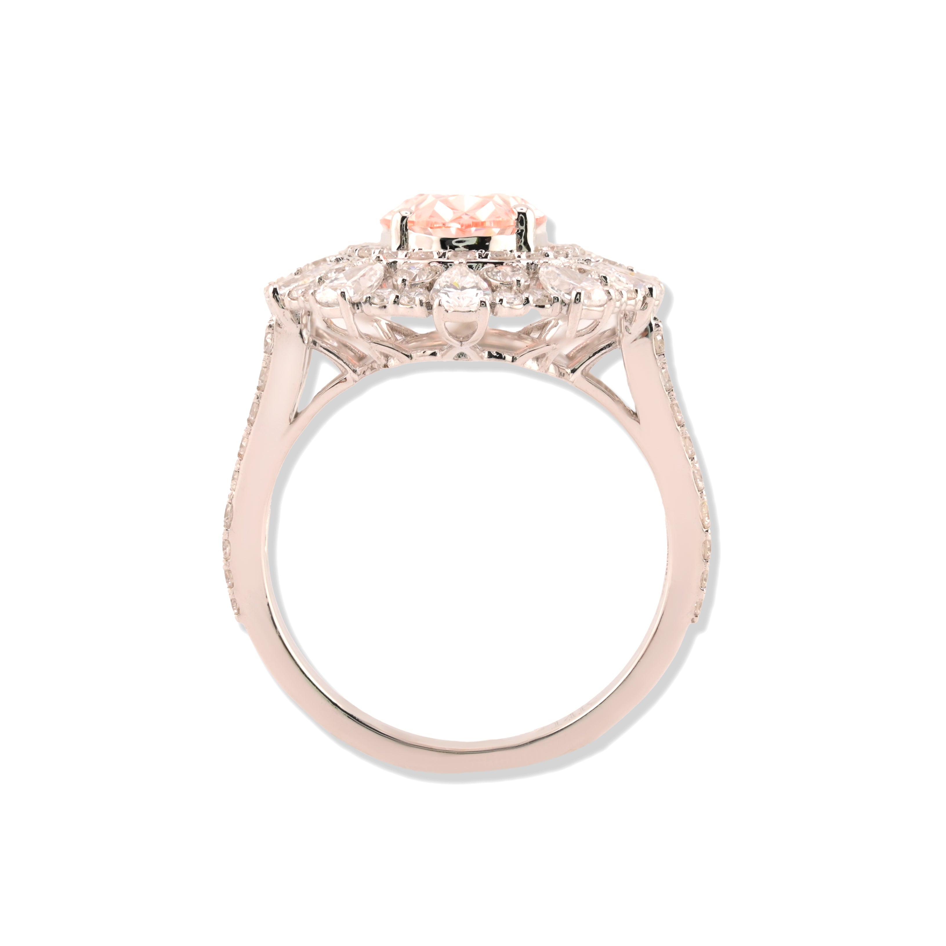 Radiate elegance with this breathtaking 14k white gold ring, showcasing a magnificent pink lab diamond solitaire surrounded by delicate tear-shaped stone accents. Weighing 5 grams, this substantial piece features an impressive 6.3 carats of lab diamond brilliance that creates a luminous, multidimensional appearance. The cool white gold provides an elegant foundation for the romantic pink stone, while the surrounding tear drops add refined detail and movement. Perfect for those seeking a distinctive engagement or statement ring that celebrates femininity through premium craftsmanship and exceptional gemstone artistry.