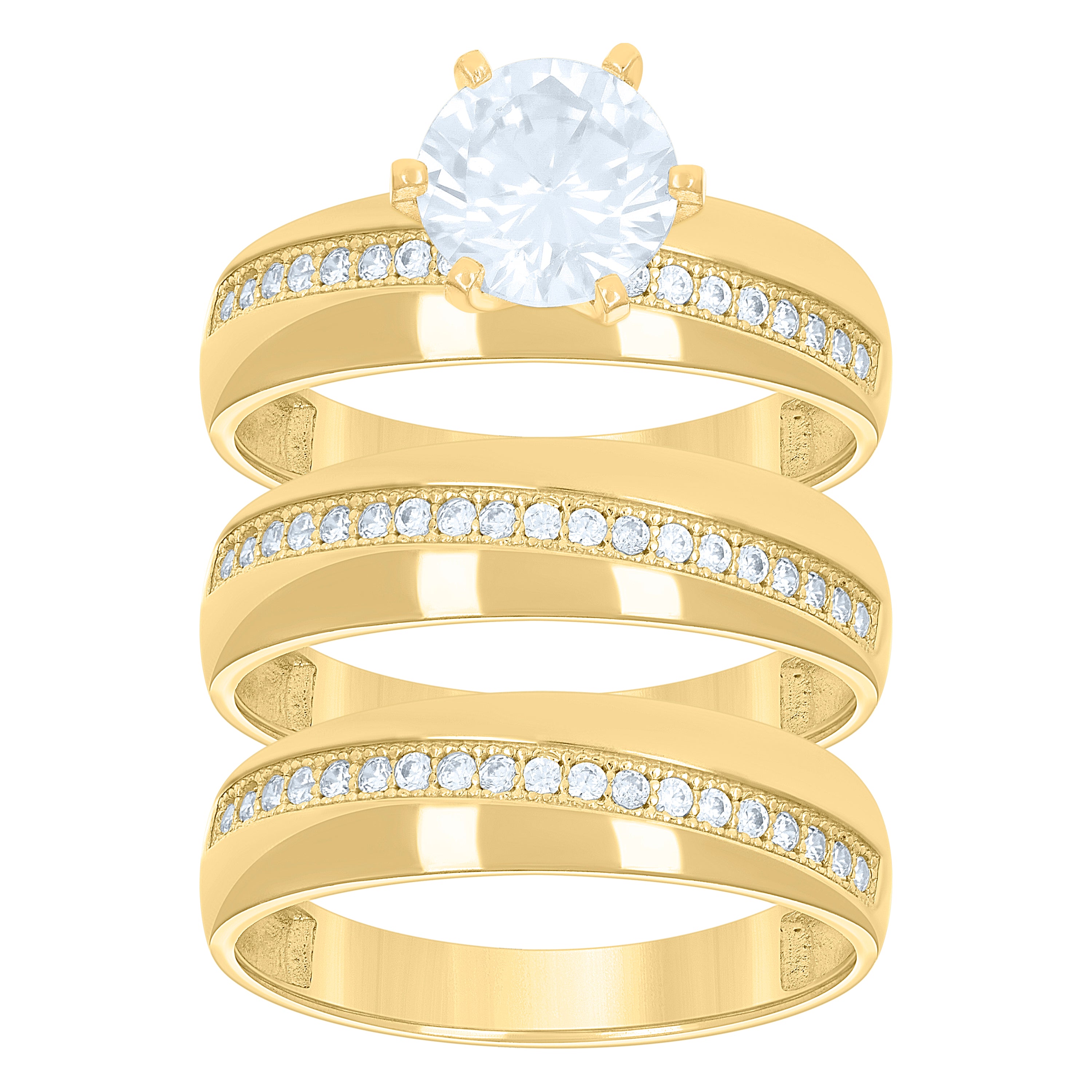 Celebrate your love story with the stunning 14Kt Gold Two-Tone Women's CZ Diagonal Line Trio His Hers Wedding Engagement Bridal Set Ring. This exquisite ring set, weighing 7.6 grams, perfectly combines elegance and modern design with its polished two-tone finish. The dome closure offers a comfortable fit, while the 8 mm height and 8.7 mm width bring a bold presence to this meaningful piece. Each ring in the set is adorned with brilliant round, white cubic zirconia stones, securely set in a prong setting that captures the light beautifully. Perfectly crafted to symbolize your union, this trio set is a timeless treasure that reflects your unique bond.
