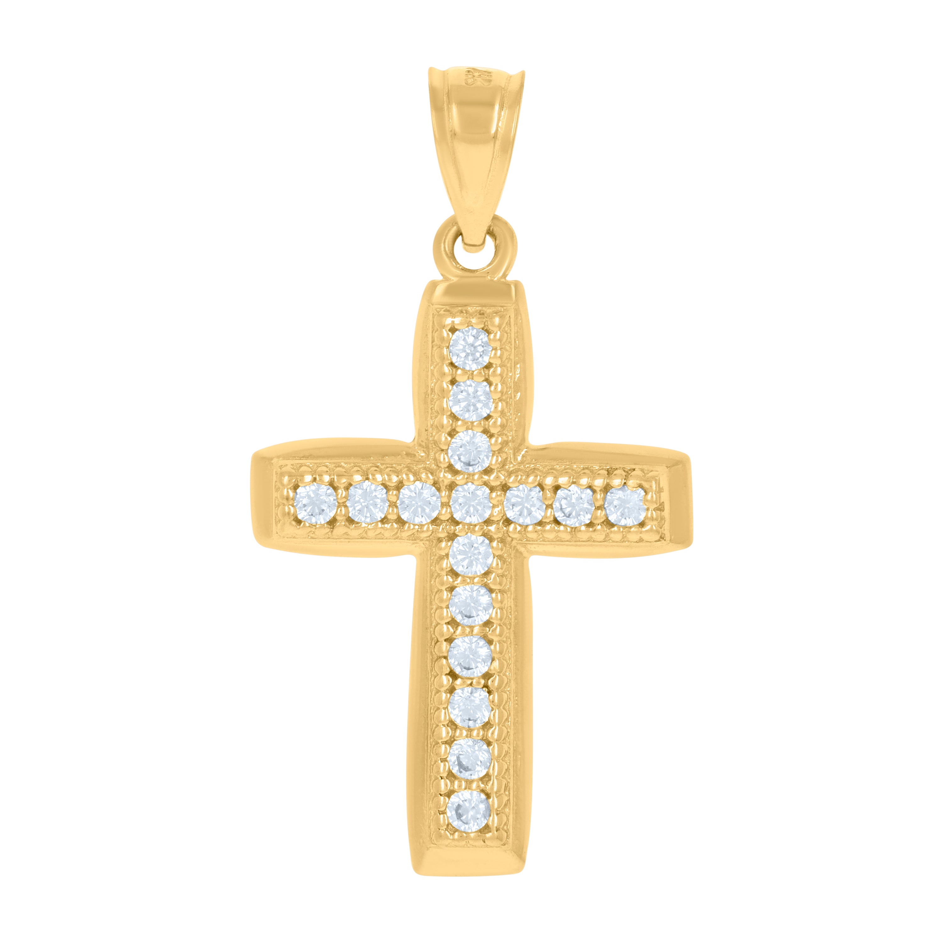Illuminate your faith with this exquisite 14Kt Gold Unisex Two-Tone Diamond-Cut Cross Pendant. Elegantly crafted with a polished finish, this pendant is a harmonious blend of sophistication and spirituality. Measuring 30.2mm in height and 15.2mm in width, it features a sparkling round cubic zirconia in a prong setting, radiating a pure white brilliance. Its versatile single bail ensures easy wearability, making it a perfect accessory for any occasion. Weighing a delicate 2.2 grams, this charm is a timeless piece that transcends fashion, embodying grace and devotion.