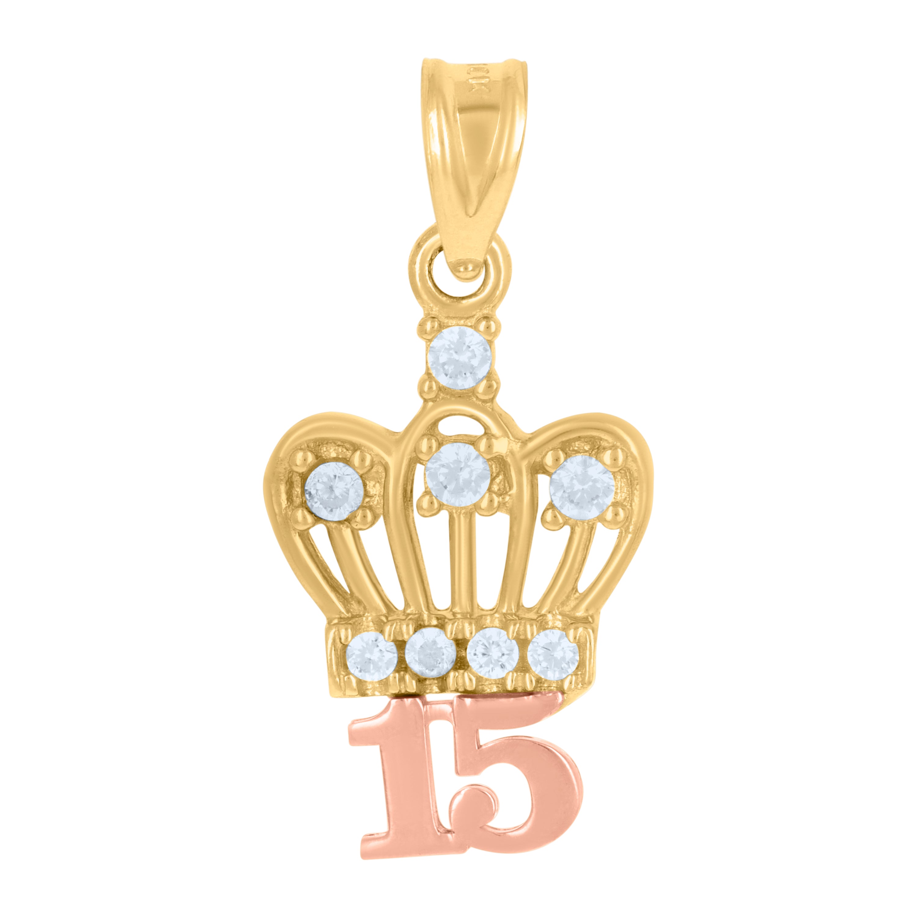 14Kt Gold Womens Tri-Color Diamond-Cut 15 Anos Crown Ht:21.5Mm Quinceanera Pendant Charm
