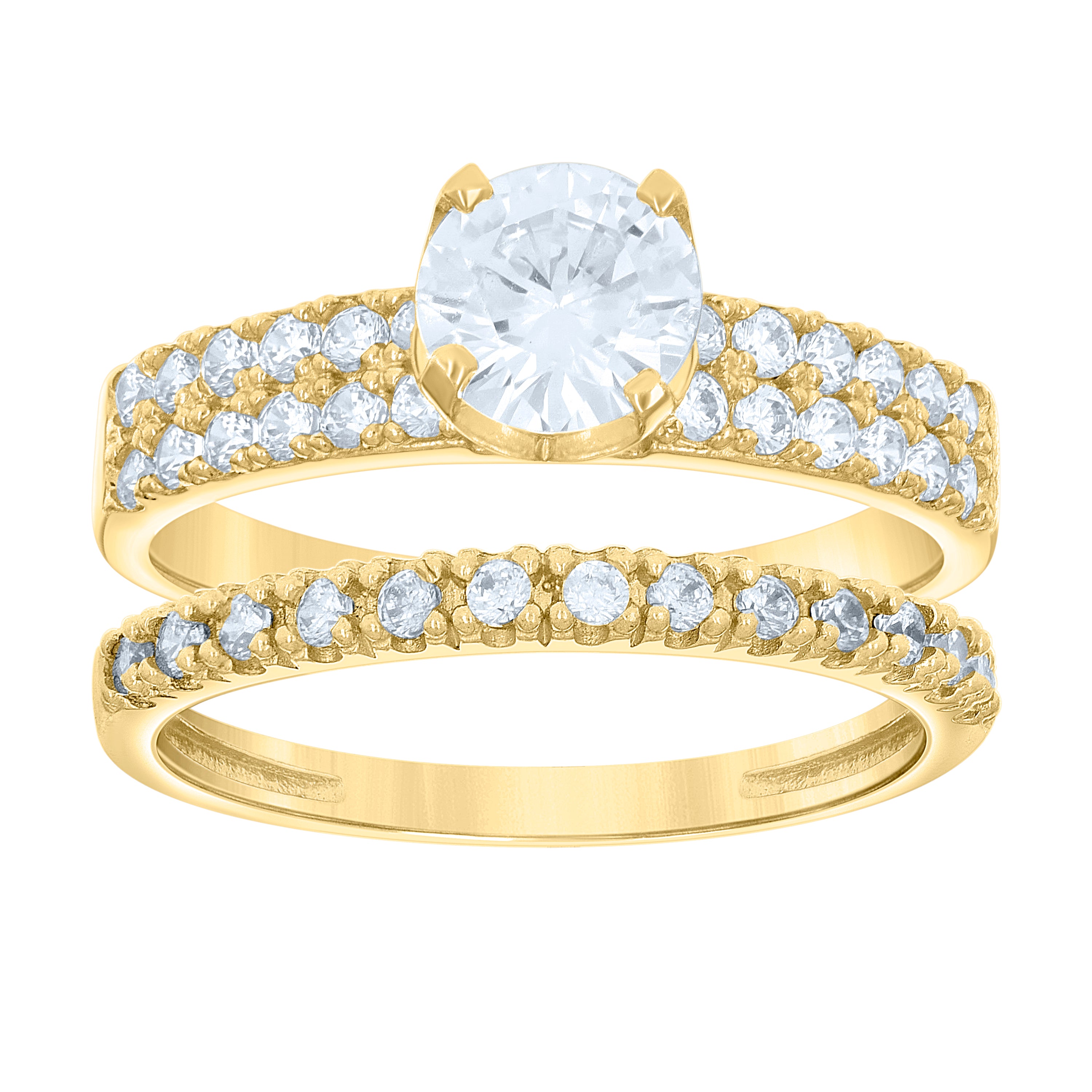 Elevate your love story with this exquisite 14Kt Gold Women's Two-Tone Bridal Set. Featuring a stunning trio of prong-set round white cubic zirconia stones, this polished masterpiece sparkles with elegance. The perfect union of sophistication and style, this set boasts a graceful height of 6.4MM and a width of 6.1MM, ensuring a comfortable and dazzling fit for size 7. Celebrate your forever with a timeless symbol of love.
