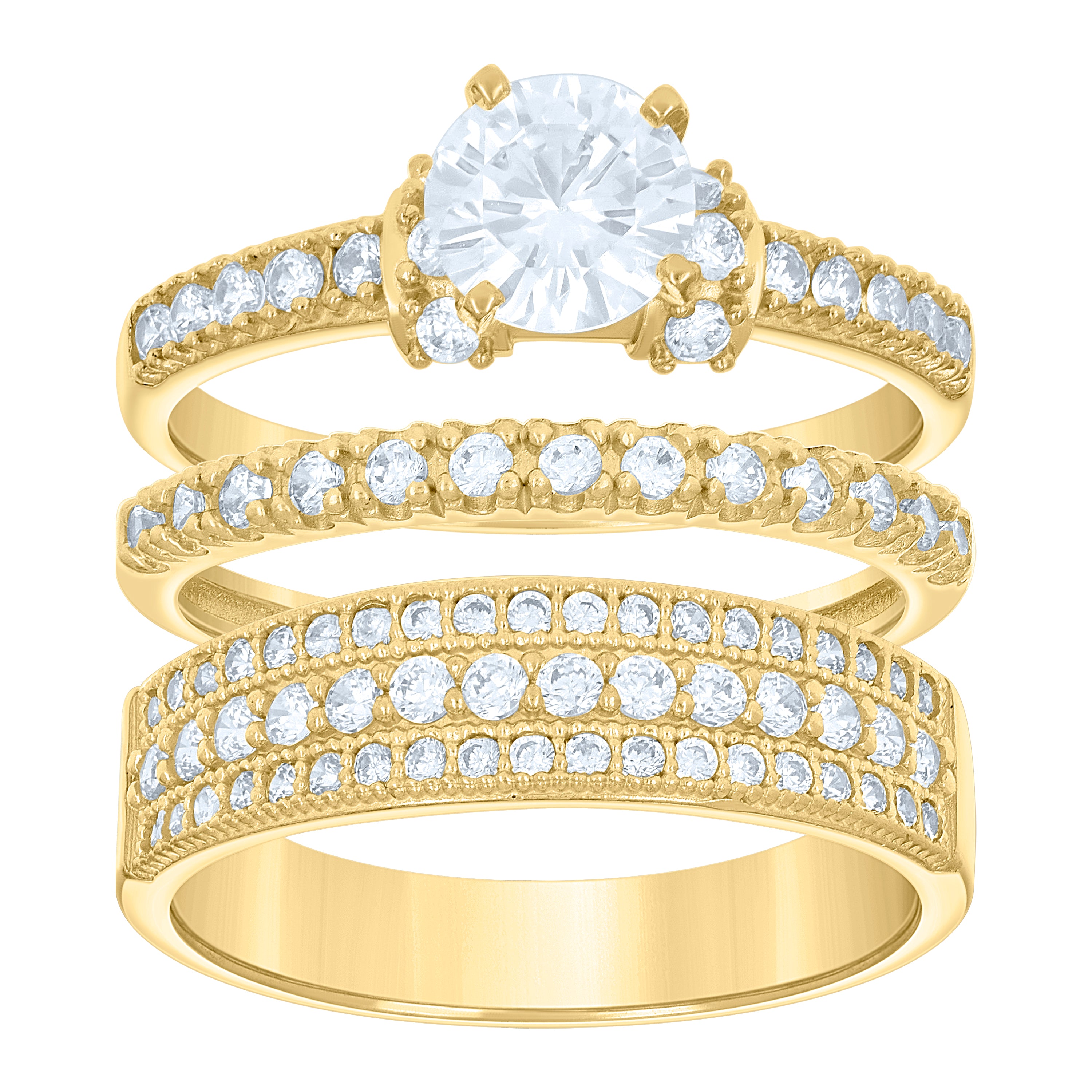Embrace elegance with our 14Kt Gold Women's Two-Tone CZ Trio Bridal Set, designed to shine on your special day. This exquisite set features a dazzling round white cubic zirconia centerpiece in a prong setting, perfectly complementing the polished finish. With its graceful 7MM height and 10MM width, this ring set is a timeless symbol of love, blending classic design with modern sophistication. Ideal for engagements and weddings, this set is the perfect expression of commitment and style.