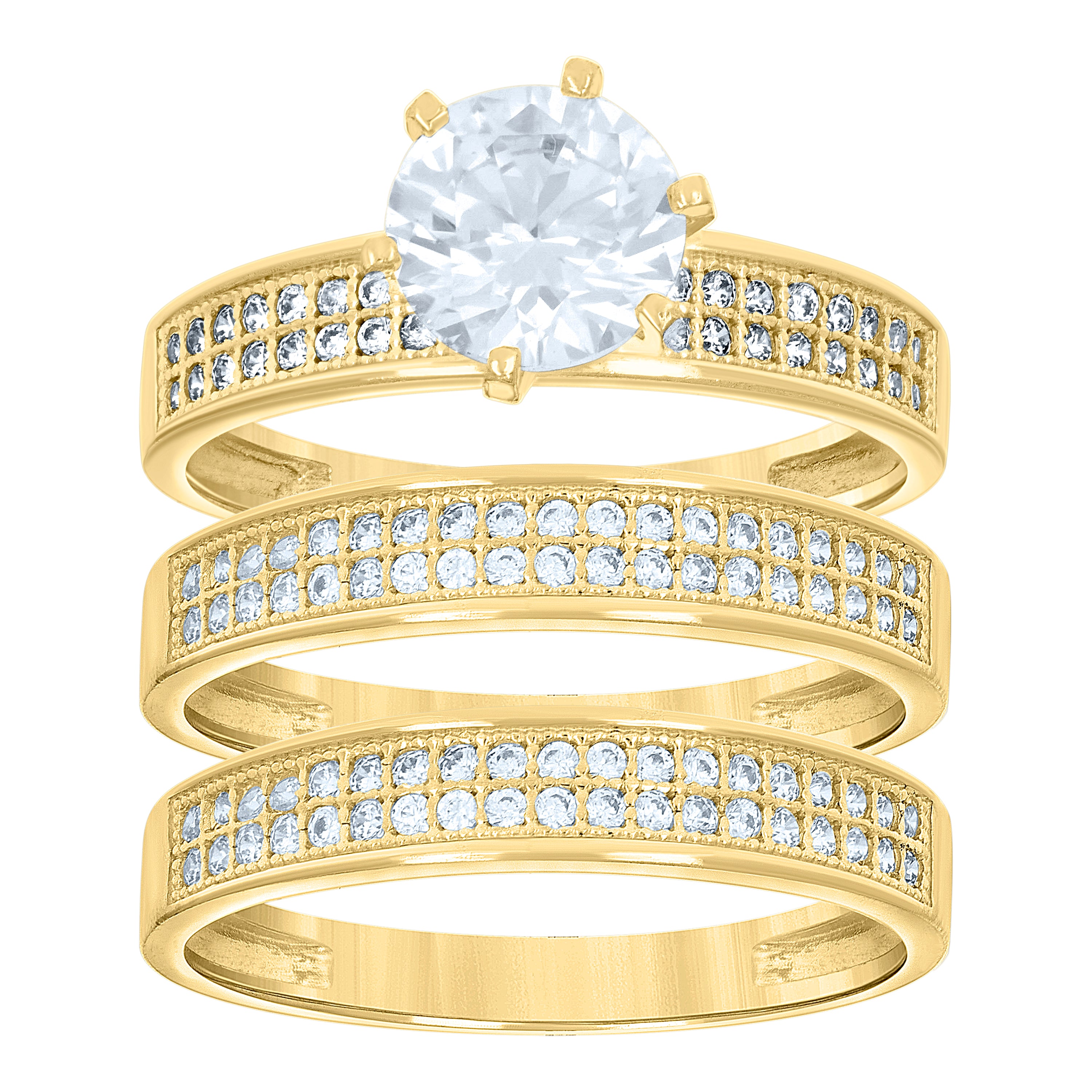Elevate your love story with this exquisite 14Kt Gold Women's Two-Tone Bridal Set. Featuring a dazzling trio of prong-set round white cubic zirconia stones, this polished masterpiece radiates elegance. Weighing 6.4 grams, its sleek design boasts a flat closure, with a height of 7.7MM and a width of 6.8MM, perfectly blending timeless style with modern sophistication. Ideal for engagements and weddings, this set beautifully symbolizes your forever commitment.