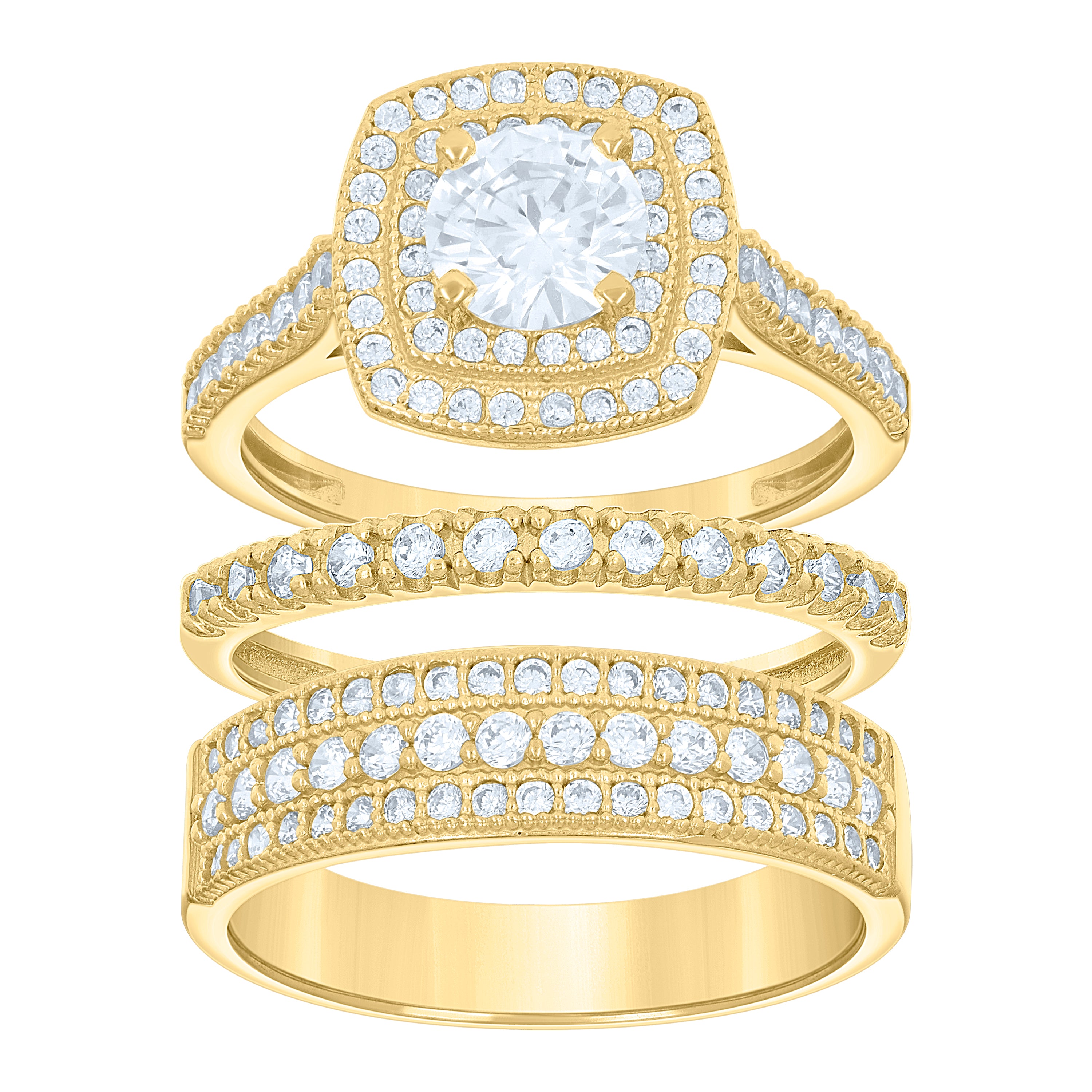 Crafted in radiant 14Kt gold, this exquisite women's two-tone bridal set is the epitome of elegance. Featuring a stunning square halo design, the set comes with trio rings that perfectly symbolize your everlasting bond. Each ring is adorned with brilliant round white cubic zirconia, set in a secure prong setting, enhancing its timeless allure. With a polished finish, the rings showcase a sophisticated shine. Lightweight at 7.8 grams, with dimensions of 7.1MM in height and 5.6MM in width, this set blends comfort with luxury. Celebrate your love story with this dazzling wedding engagement set.