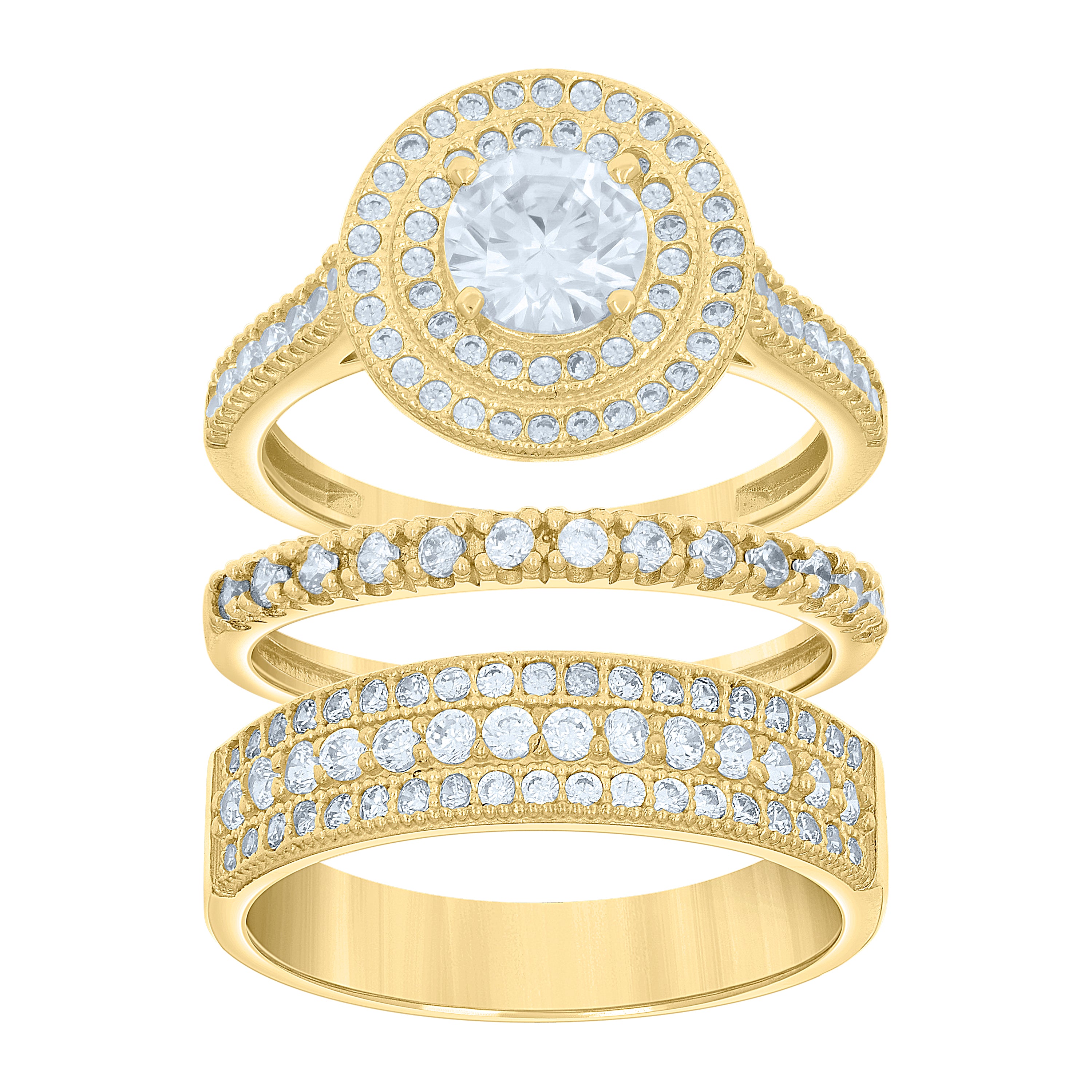 Celebrate your love with this exquisite 14Kt Gold Women's Two-Tone Trio Wedding Engagement Bridal Set. Crafted with precision, this set features a stunning round halo design that symbolizes eternity and unity. Weighing 8.2 grams, it boasts a polished finish that shines with elegance. The rings' dimensions—7.2MM in height and 9.6MM in width—ensure a bold yet sophisticated presence on the finger. Embrace timeless beauty and modern charm in one captivating set.