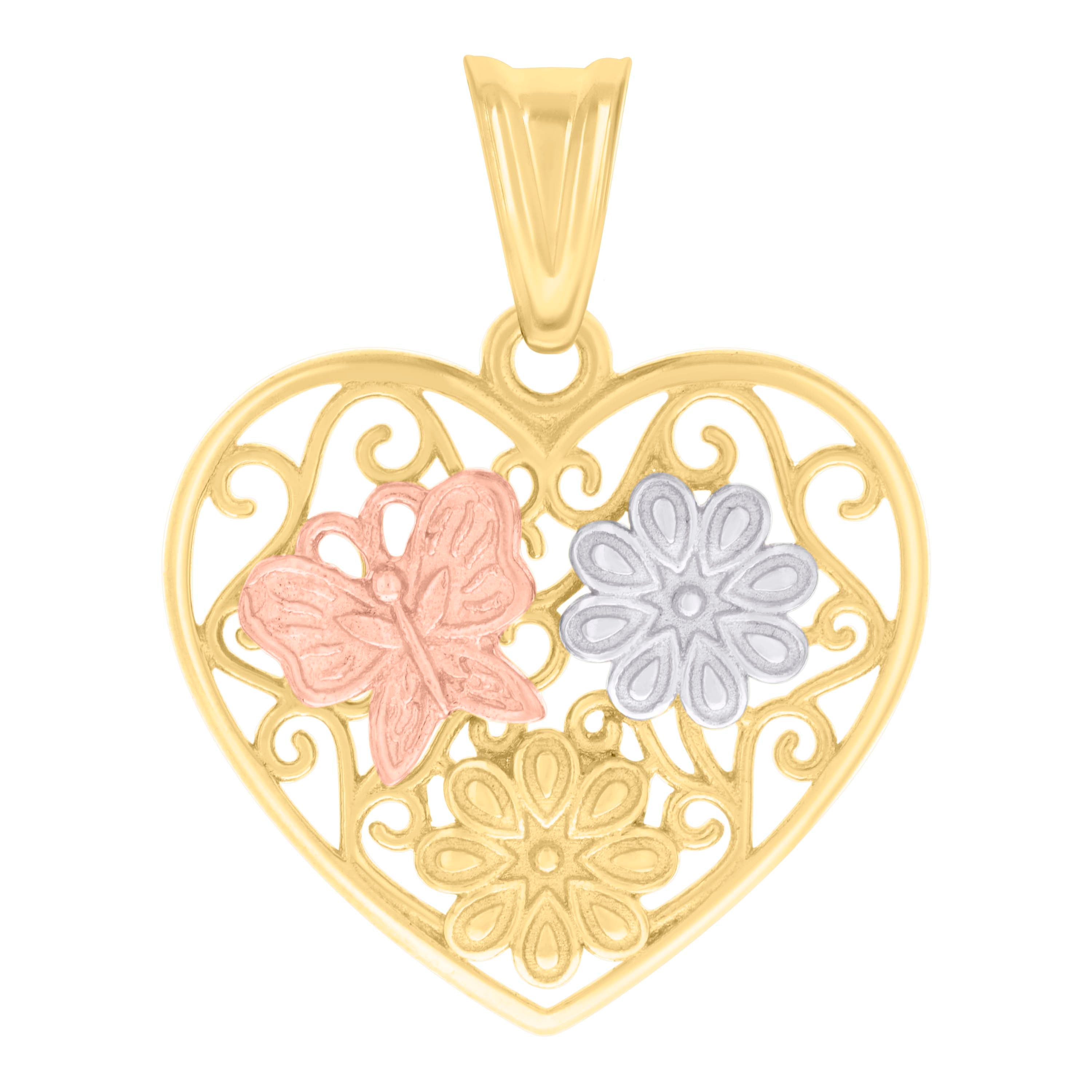 14kt Tri-Color Gold Women Floral Heart Charm Pendant