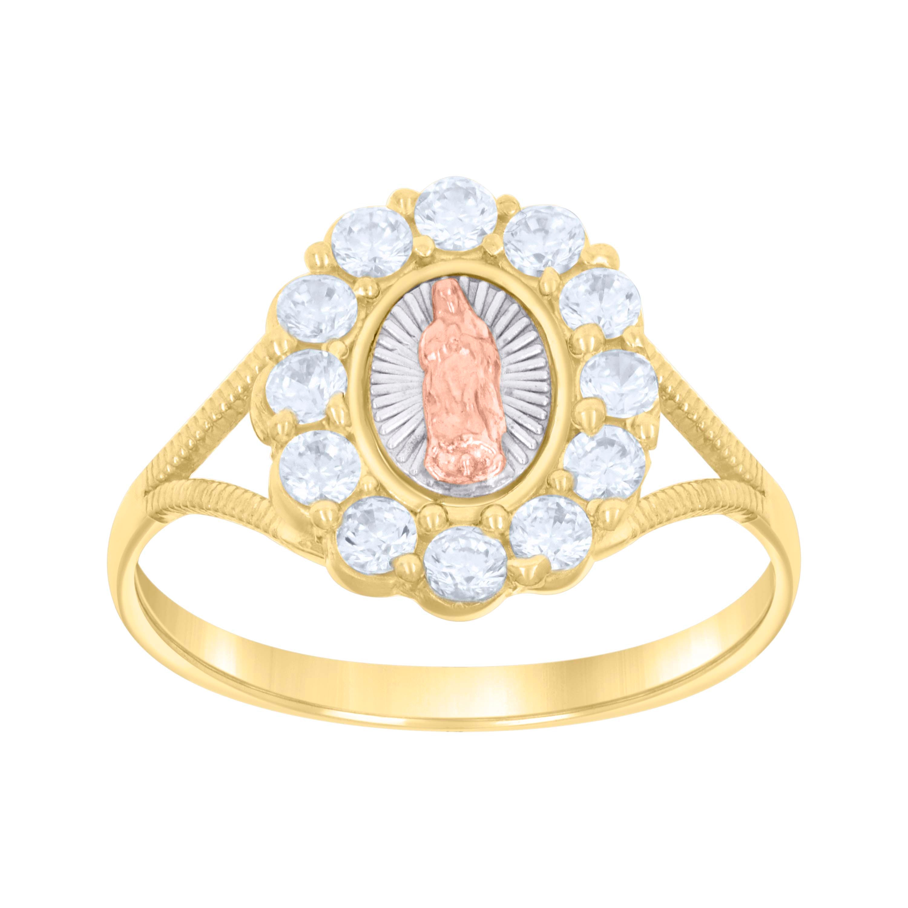 Experience the divine elegance of our 14kt Tri-Color Gold Women's Cubic-Zirconia Guadalupe Religious Ring. This exquisite piece, weighing 2.2 grams, gleams with a polished finish, capturing the essence of grace and reverence. With a balanced height and width of 12.8MM, the ring showcases a stunning white round cubic-zirconia, expertly set in prongs, ensuring a sparkling accent to the tri-color gold design. Embrace the spiritual and the stylish with this captivating symbol of faith.