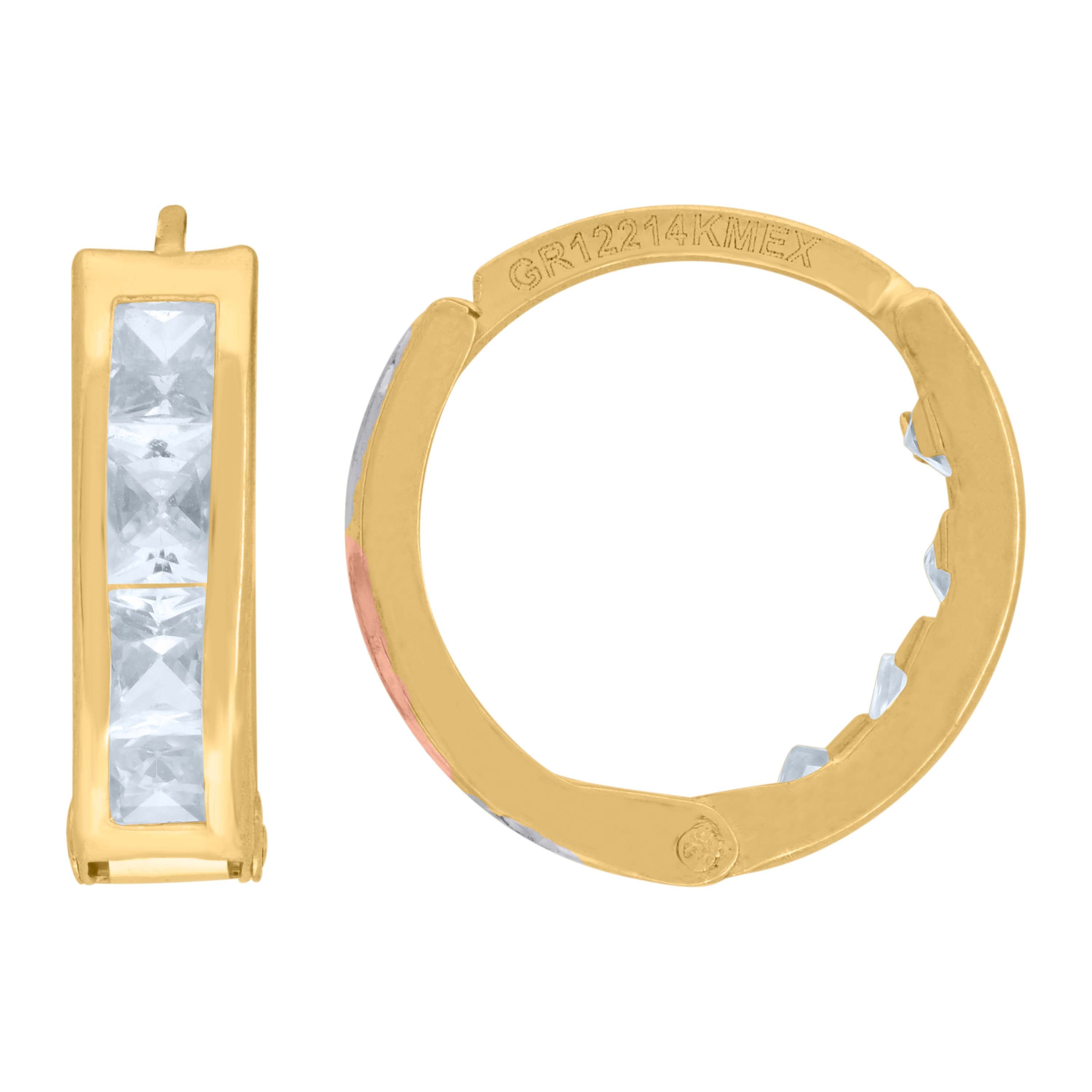 Elevate your elegance with these 14Kt Tri-Color Gold Huggie Hoop Earrings. Featuring a dazzling princess-cut white cubic zirconia set in a sleek channel design, these polished hoops weigh a delicate 1.3 grams. With a seamless endless closure, they measure 13.1MM in height and 13.2MM in width, offering a perfect blend of sophistication and comfort. Ideal for any occasion, these earrings are a timeless addition to your jewelry collection.