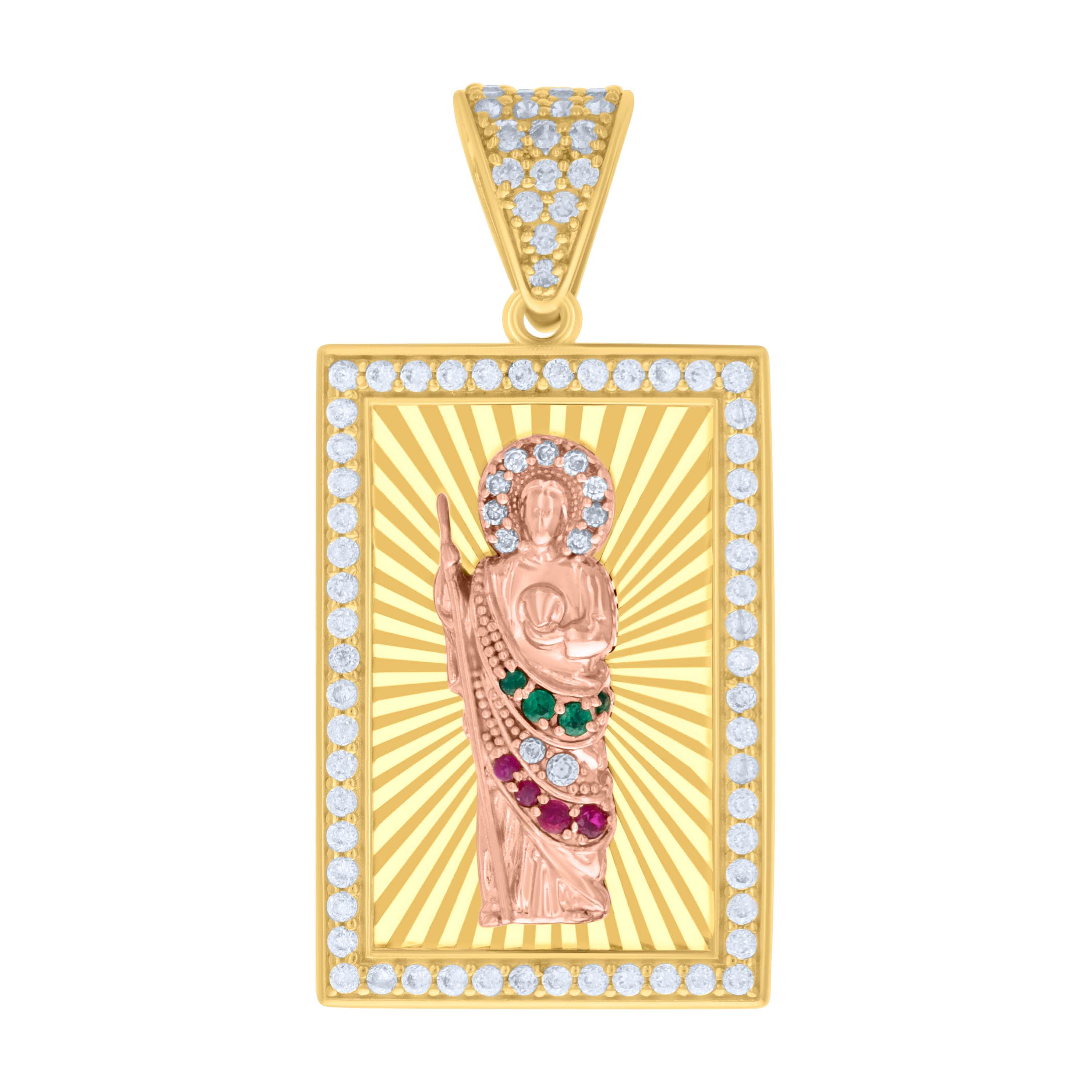 14kt Two-tone Gold Mens Green/Pink White Cubic-Zirconia St. Jude Religious Charm Pendant