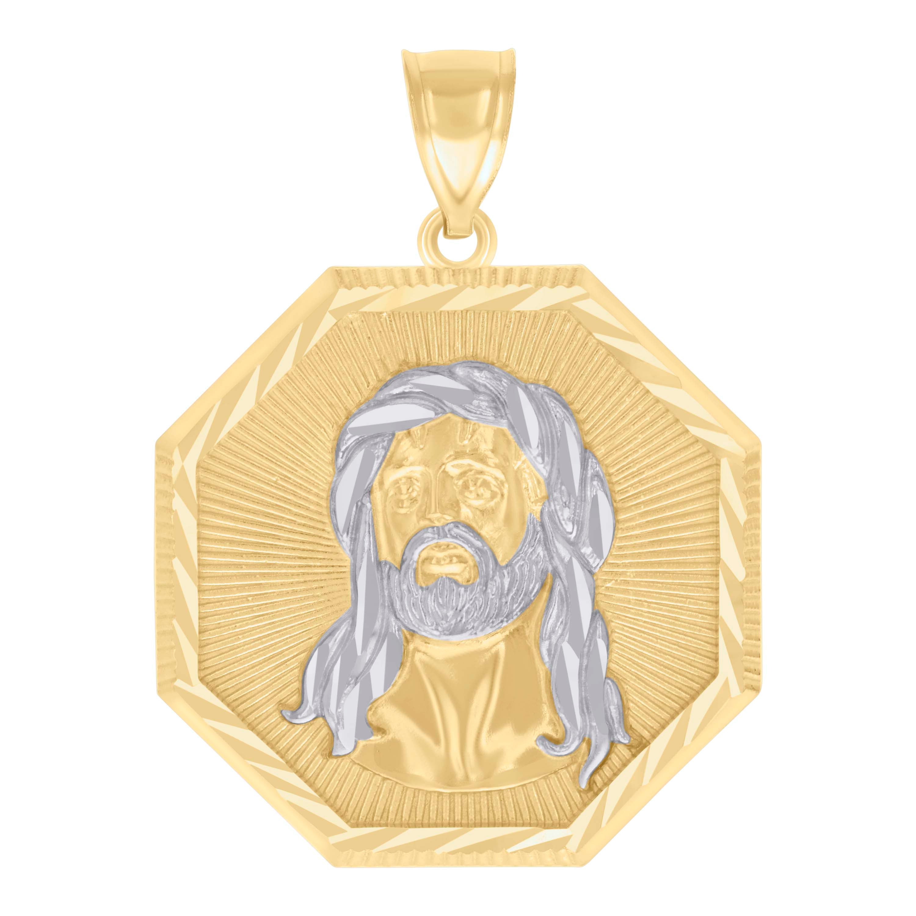 Elevate your style with this exquisite 14kt Two-tone Gold Men's Jesus Religious Charm Pendant. Weighing 4.9 grams, its stunning diamond-cut finish captivates with every glint of light. The single bail closure ensures it hangs securely, accentuating its 38.3MM height and 27.9MM width. Crafted without CZ, this pendant offers a pure, unembellished elegance perfect for the devout and fashion-forward alike.