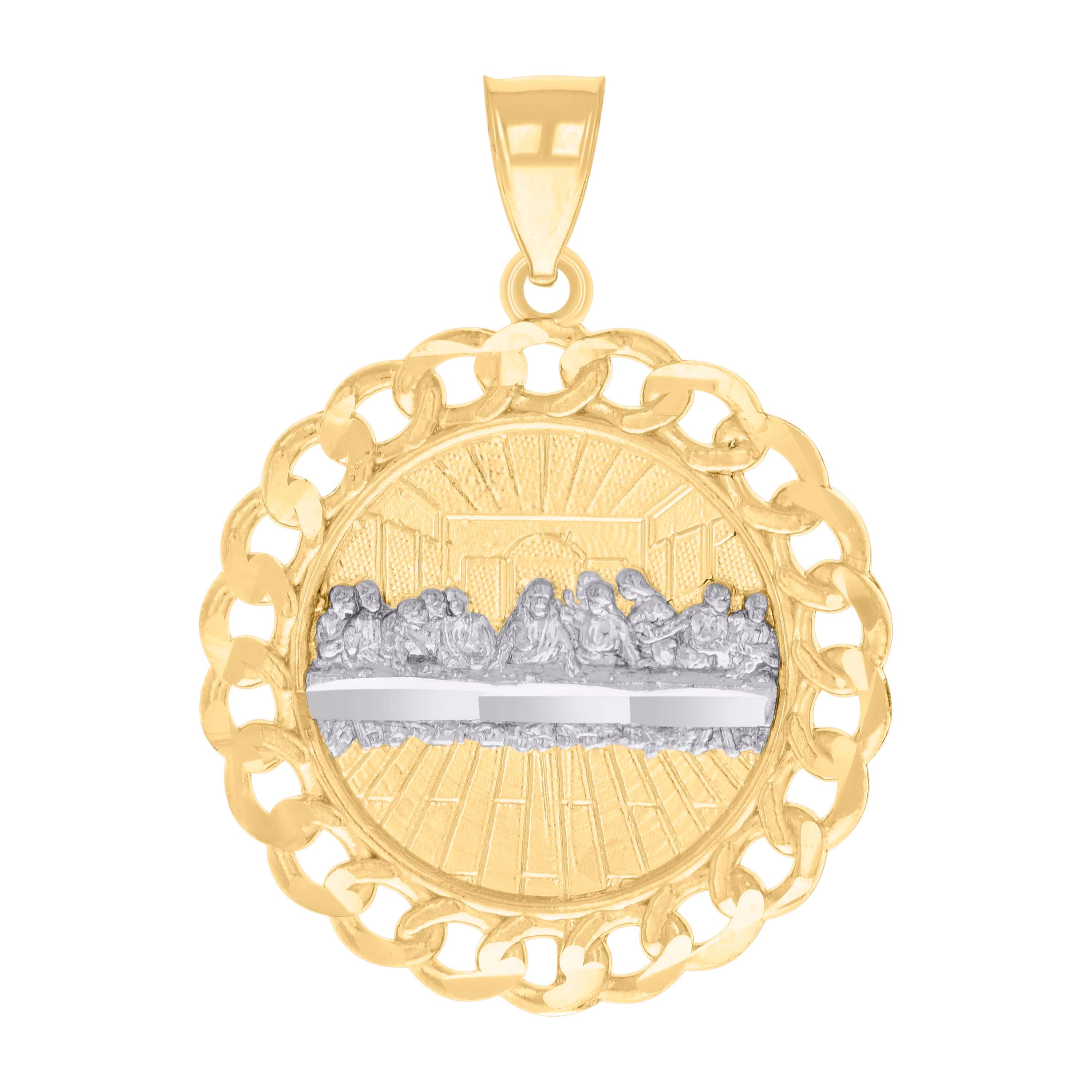 Elevate your spiritual journey with the exquisite 14kt Two-tone Gold Men's Last Supper Religious Charm Pendant. This stunning piece has been crafted with intricate diamond-cut detailing, capturing the essence of the iconic Last Supper. Made from premium 14kt two-tone gold, this pendant radiates a unique blend of elegance and faith. With dimensions of 29.8 mm in height and 22.3 mm in width, it sits perfectly on your chest, making a bold yet sophisticated statement. The single bail clasp provides a secure hold, ensuring that this meaningful piece remains close to your heart. Ideal for those who cherish religious symbolism in their jewelry collection, this pendant is a testament to both style and devotion.
