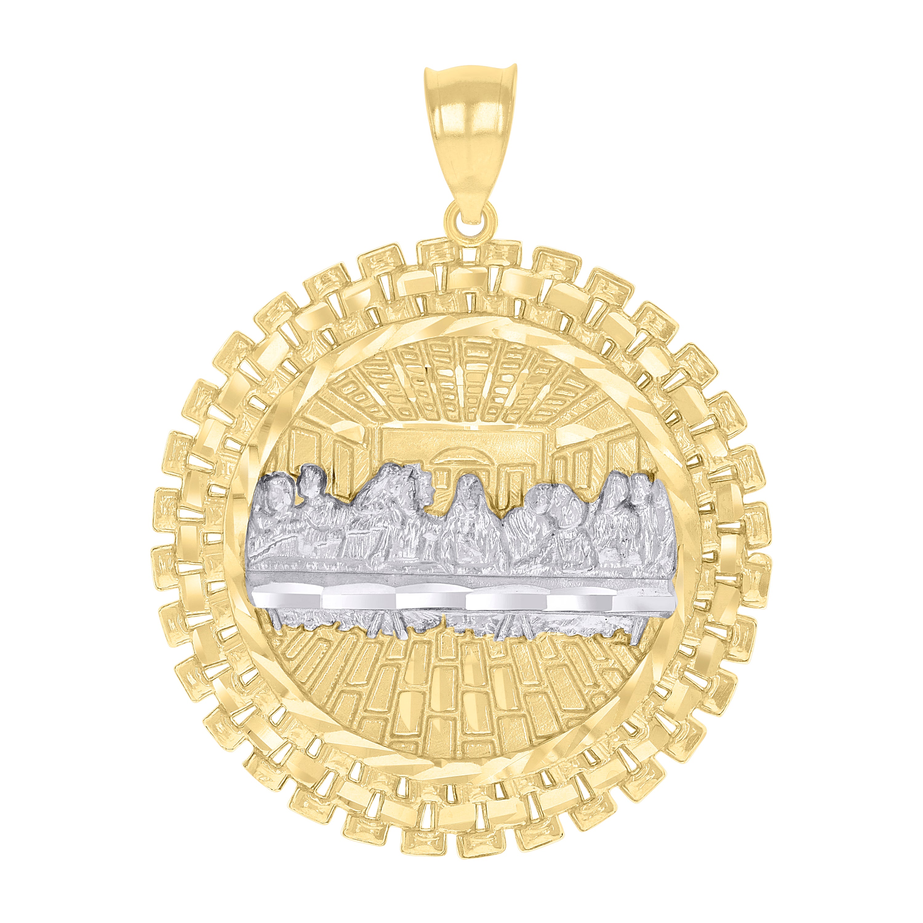 Elevate your style with this exquisite 14kt two-tone gold men's pendant, showcasing the revered Last Supper. Meticulously crafted with a diamond-cut finish, this masterpiece weighs 12.3 grams and promises a striking brilliance. Designed with a single bail closure, it measures a commanding 55.8MM in height and 43.7MM in width. A timeless symbol of faith and sophistication, perfect for any occasion.