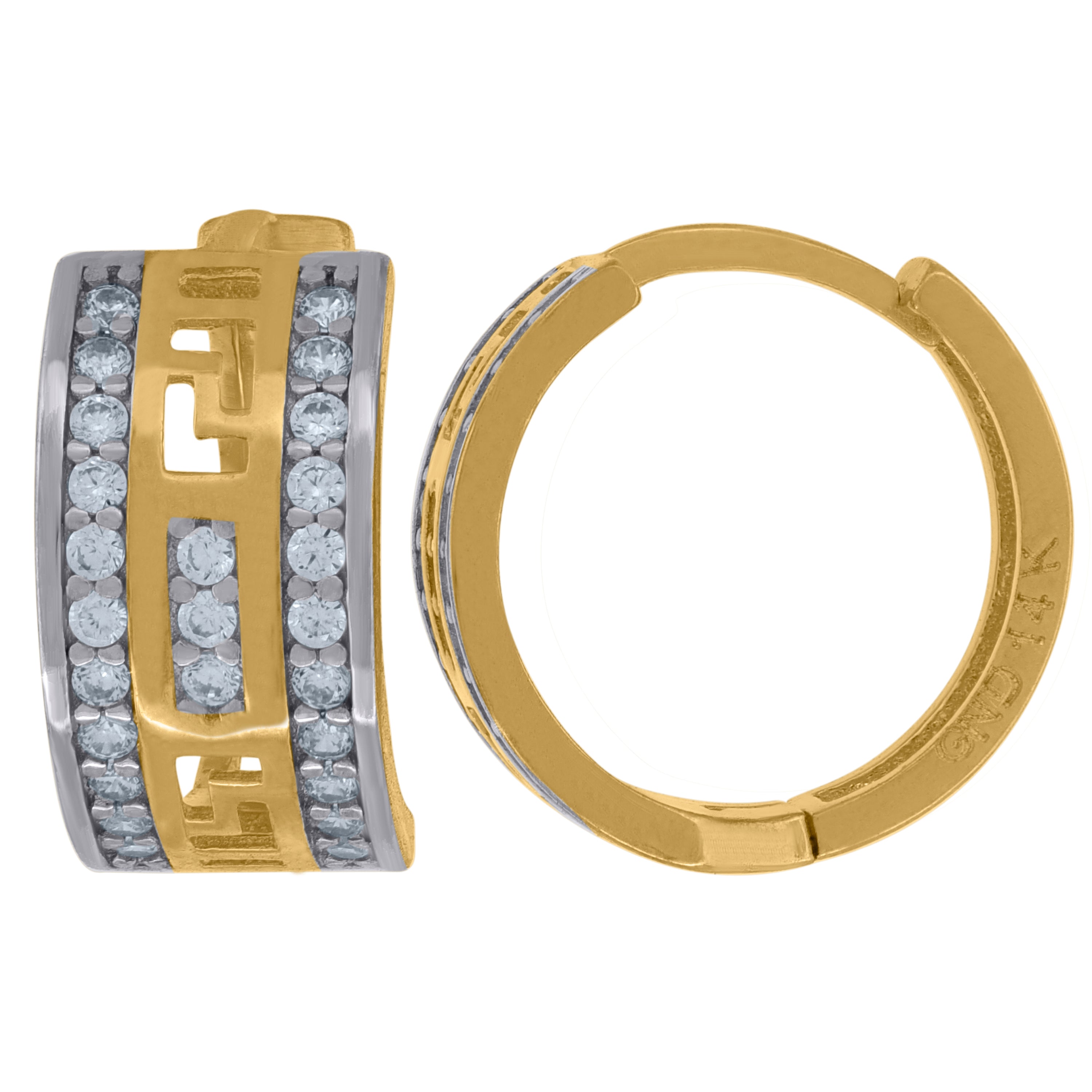 14Kt Two-Tone Gold Womens Cubic Zirconia Greek Key Huggie Hoop Earrings