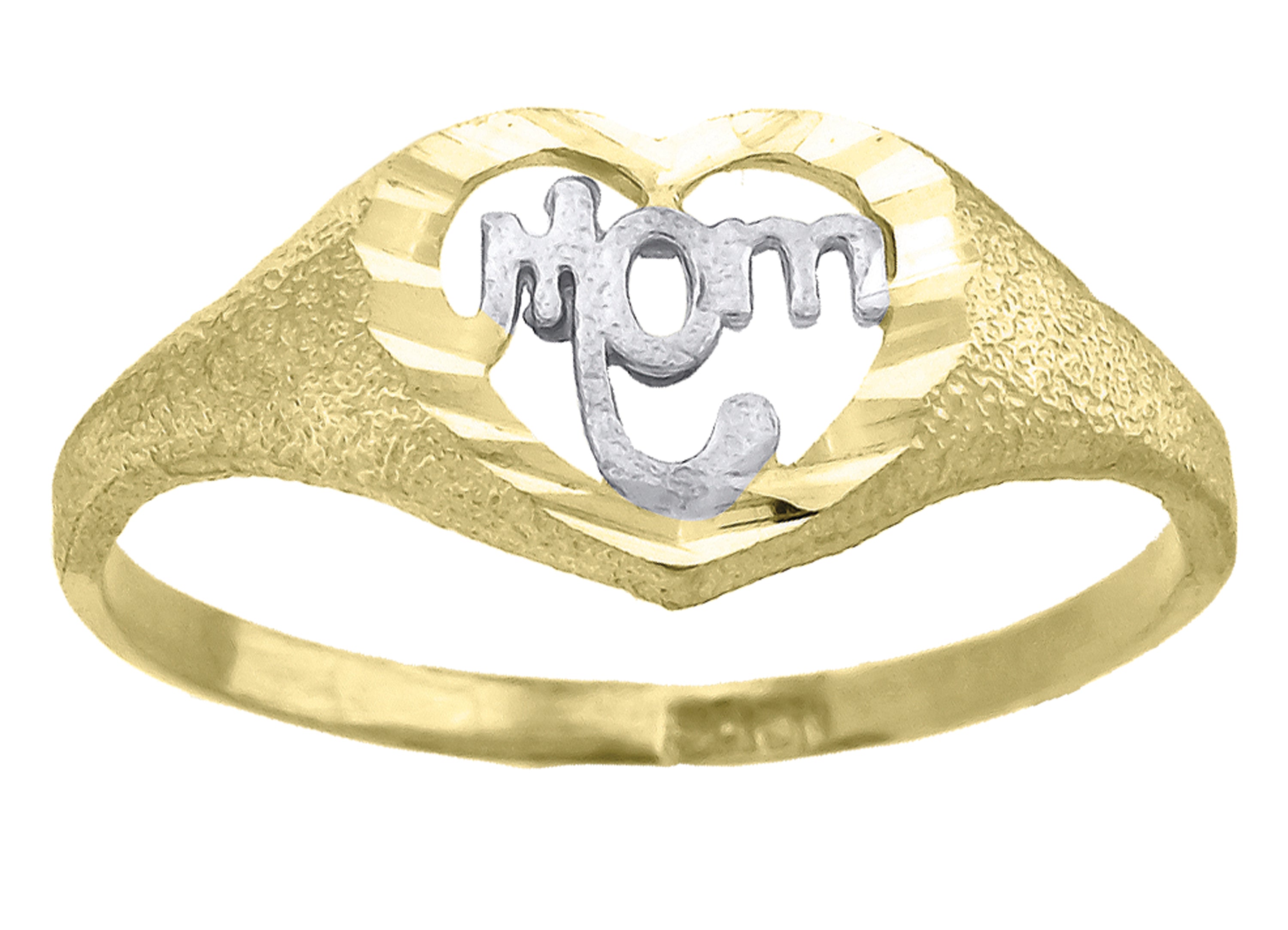 Celebrate the bond with this exquisite 14Kt Two-Tone Gold Women's Mom Ring, weighing 1.3 grams. Expertly crafted with a diamond-cut finish, it features a stunning textured design that captures the light beautifully. With a height of 8.3MM and a sleek width of 1.4MM, this elegant piece is perfect for everyday wear. The absence of CZ ensures a classic and timeless appeal, making it a cherished keepsake for any mom.