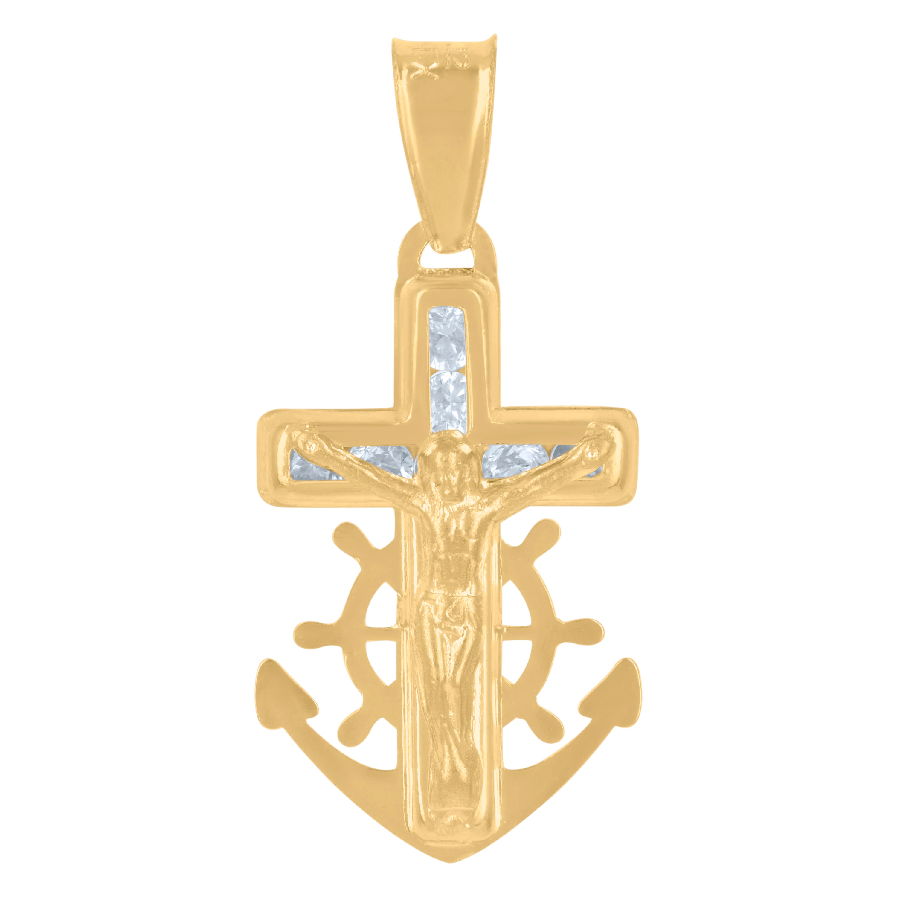 Embrace your faith with this exquisite 14Kt Yellow Gold Men's Anchor Crucifix Pendant. Weighing just 0.6 grams, its polished finish exudes sophistication. The pendant features a channel-set round white cubic zirconia, adding a touch of sparkle. Measuring 21.4MM in height and 9.7MM in width, it's designed with a single bail closure for easy wear. A timeless piece that combines style and spiritual significance.