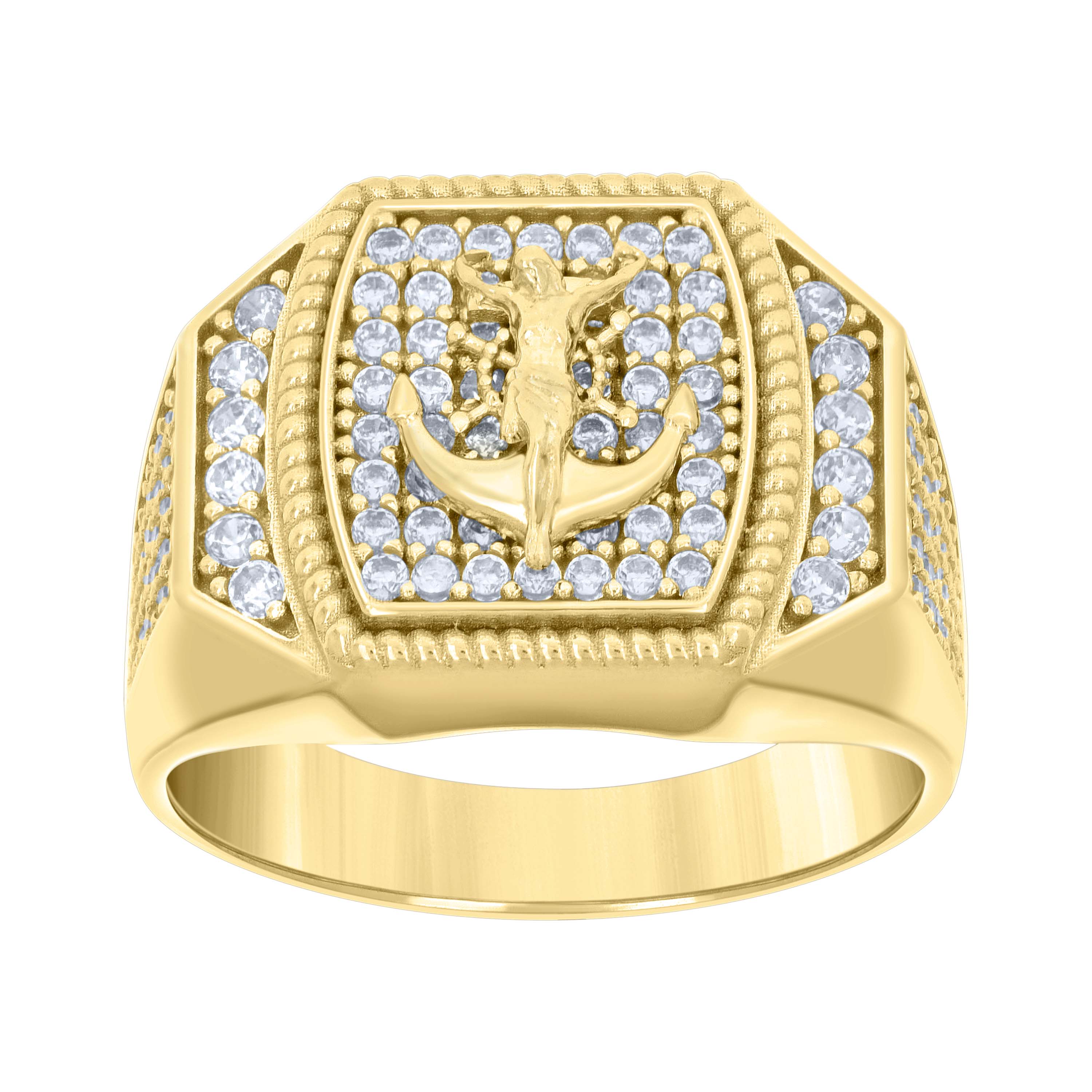 14kt Yellow Gold Mens Cubic-Zirconia Anchor Crucifix Religious Ring