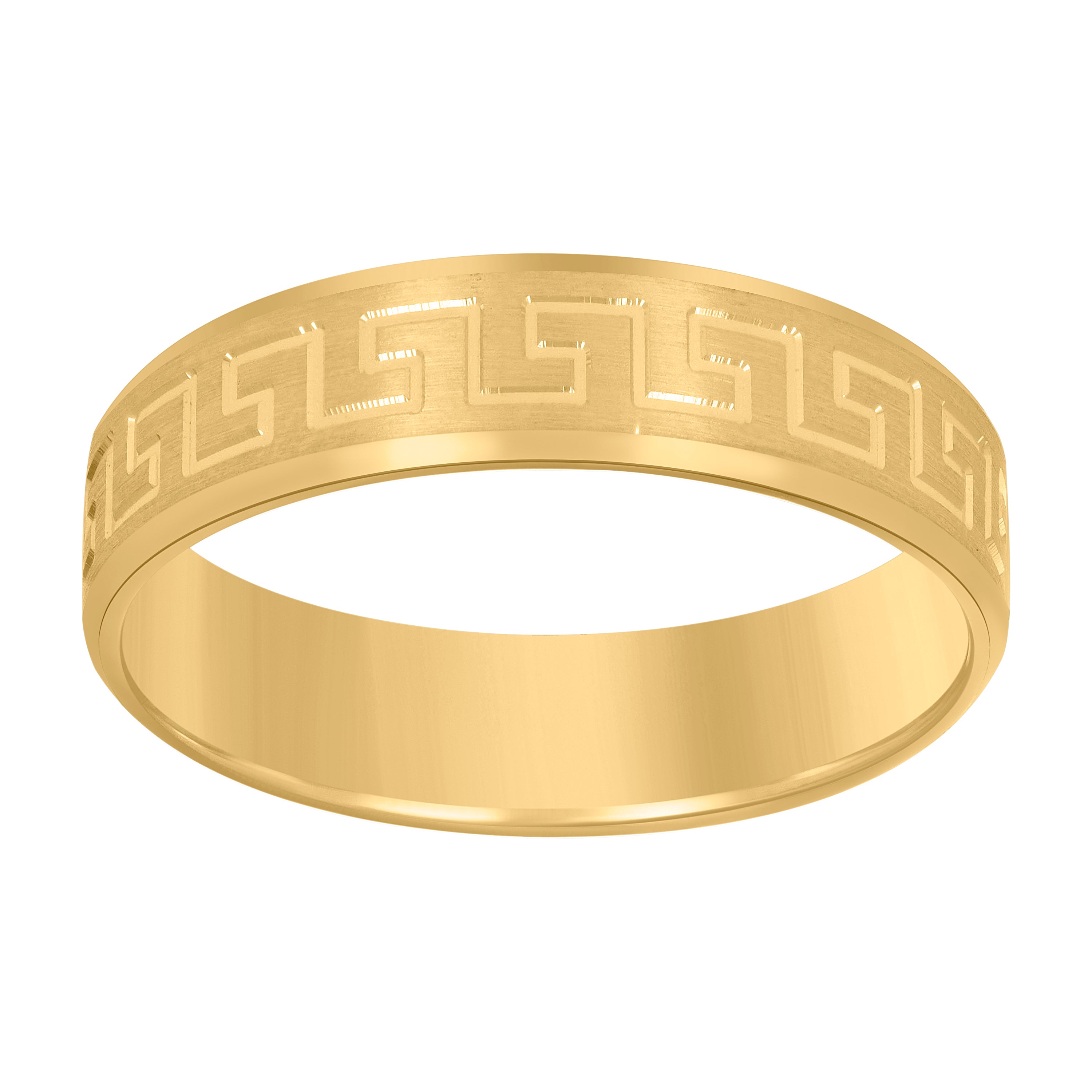 Crafted in solid 14kt yellow gold, this men’s wedding band features a timeless Greek Key motif with a sleek beveled edge for refined dimension. The diamond-cut finish adds a subtle, light-catching sparkle, while the 6mm width provides a comfortable, substantial feel without bulk. Weighing approximately 4.3 grams and offered in ring size 13, this classic band is designed without CZ for an authentically elegant, all-gold look—perfect for everyday wear and milestone moments.