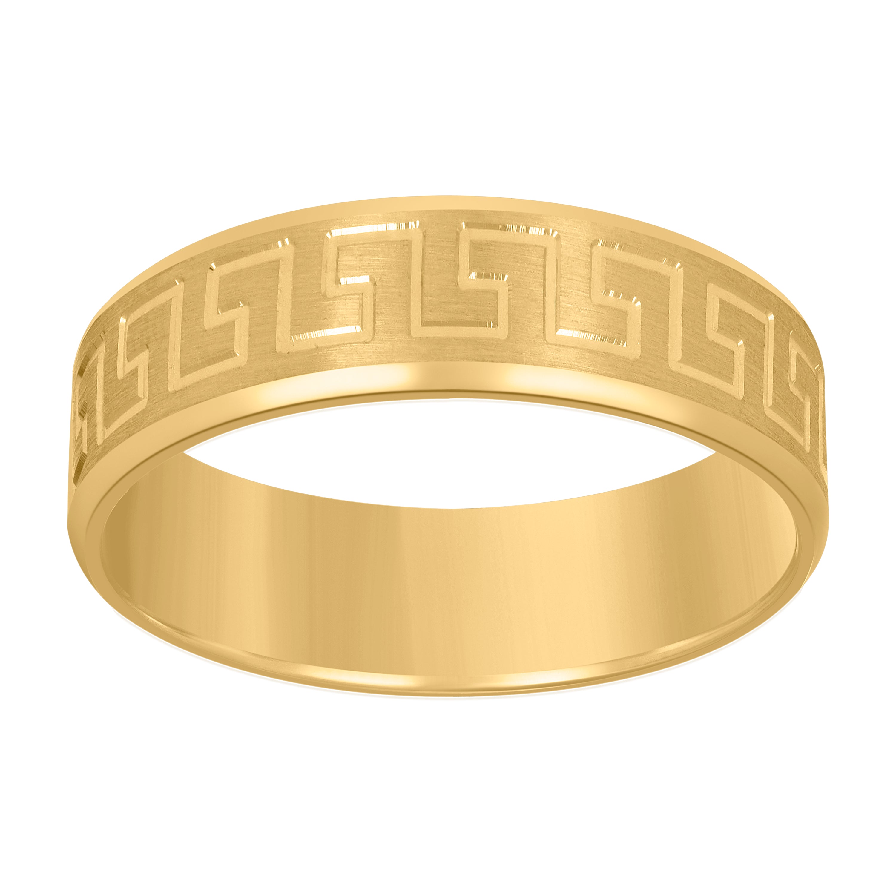 Crafted in solid 14kt yellow gold, this men’s wedding band showcases a bold Greek Key motif framed by sleek beveled edges for timeless style. The 7mm profile and diamond-cut finish catch the light with refined brilliance, while the substantial 4.1-gram weight offers a comfortable, quality feel. Designed without CZ for a pure gold look, this ring comes in size 9—an elegant, enduring symbol of commitment.
