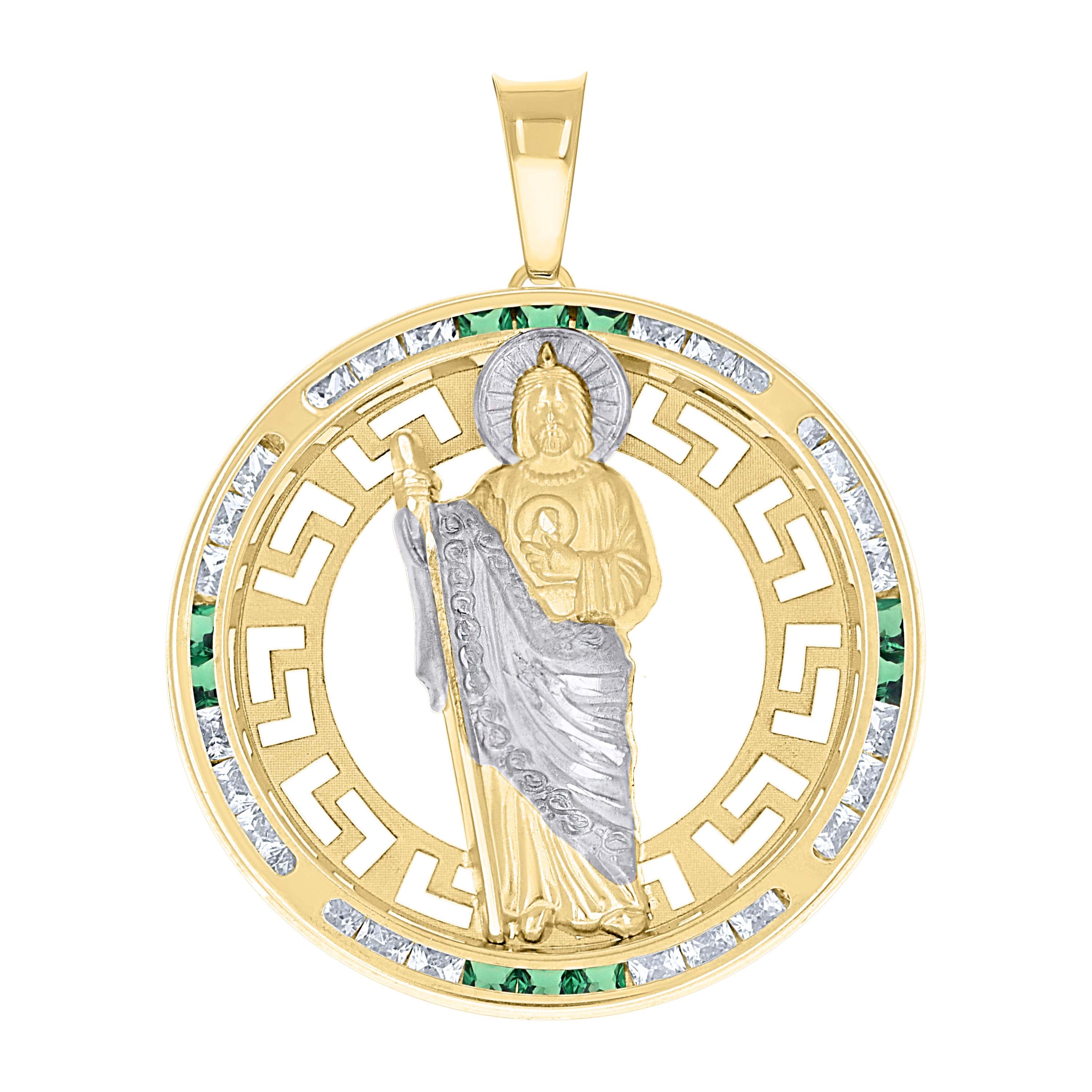 14kt Yellow Gold Mens Green White Princess-Cut Cubic-Zirconia St. Jude Religious Pendant