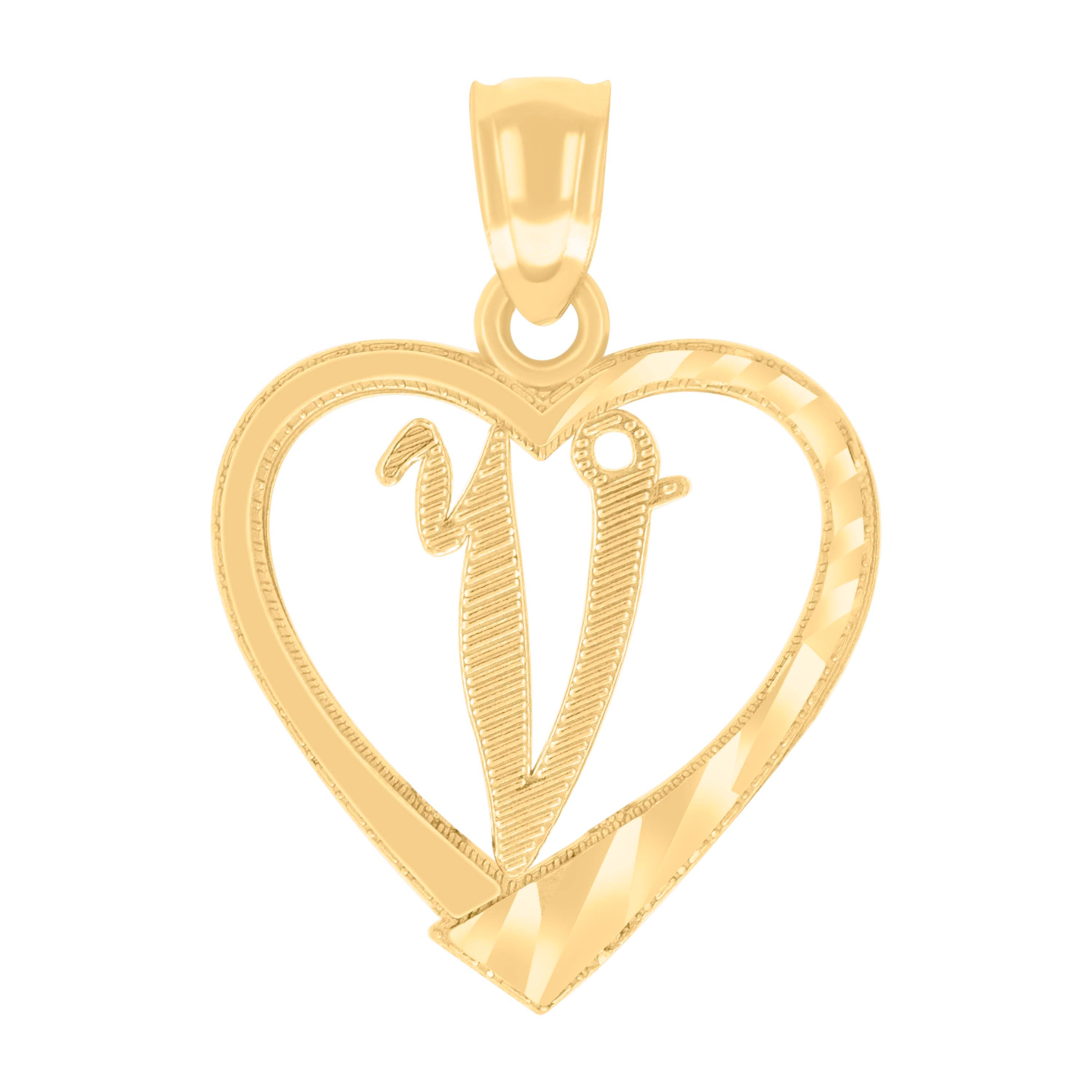 14Kt Yellow Gold Unisex Diamond-cut Unisex Initial Alphabet V Heart Charm Pendant