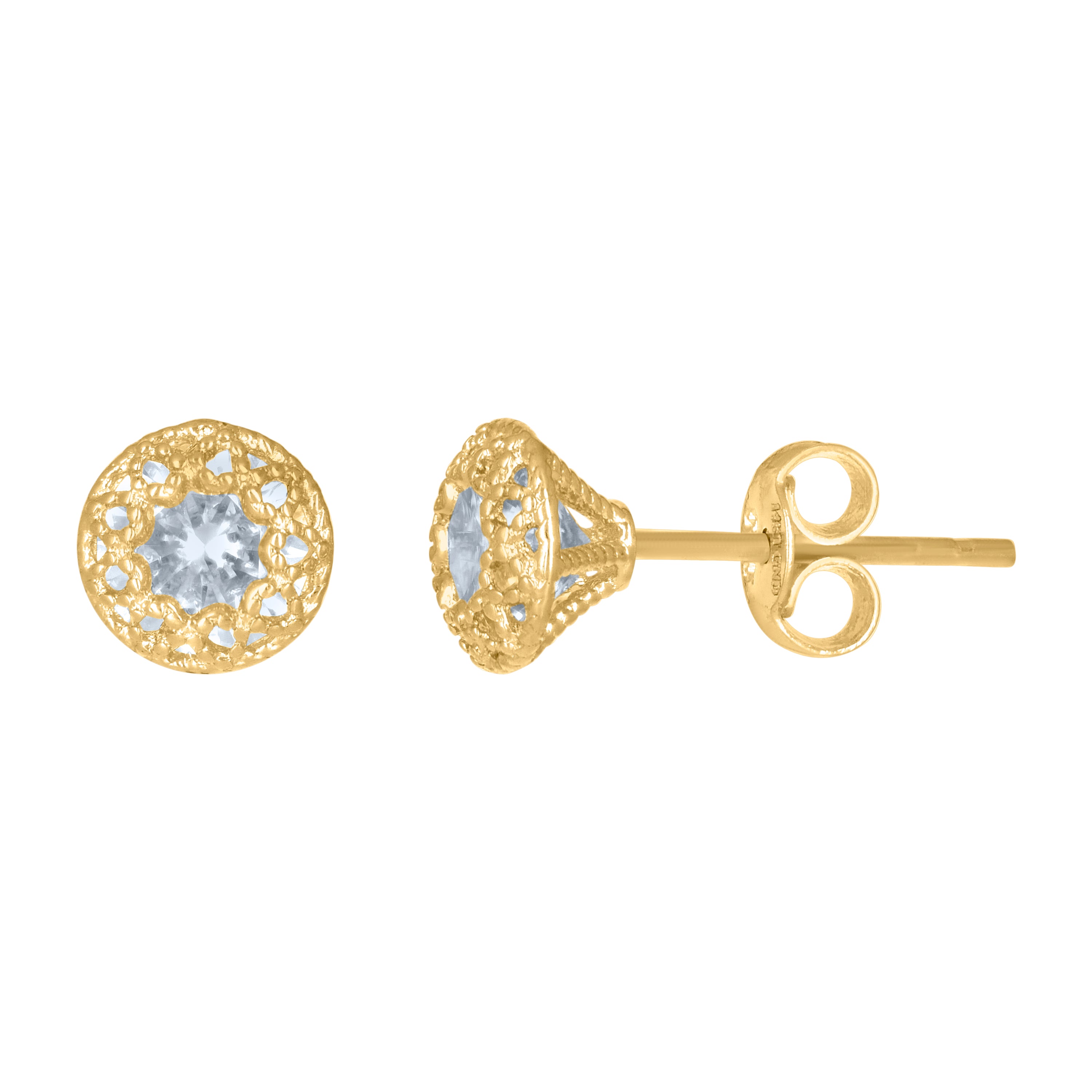 Elevate your style with these exquisite 14Kt Yellow Gold Women's Stud Earrings, featuring dazzling 6mm round white cubic-zirconia stones. Weighing a delicate 1.1 grams, their polished finish adds a luxurious shine. The secure push-back closure ensures comfort and ease of wear. Perfect for any occasion, these earrings are a timeless addition to your jewelry collection.