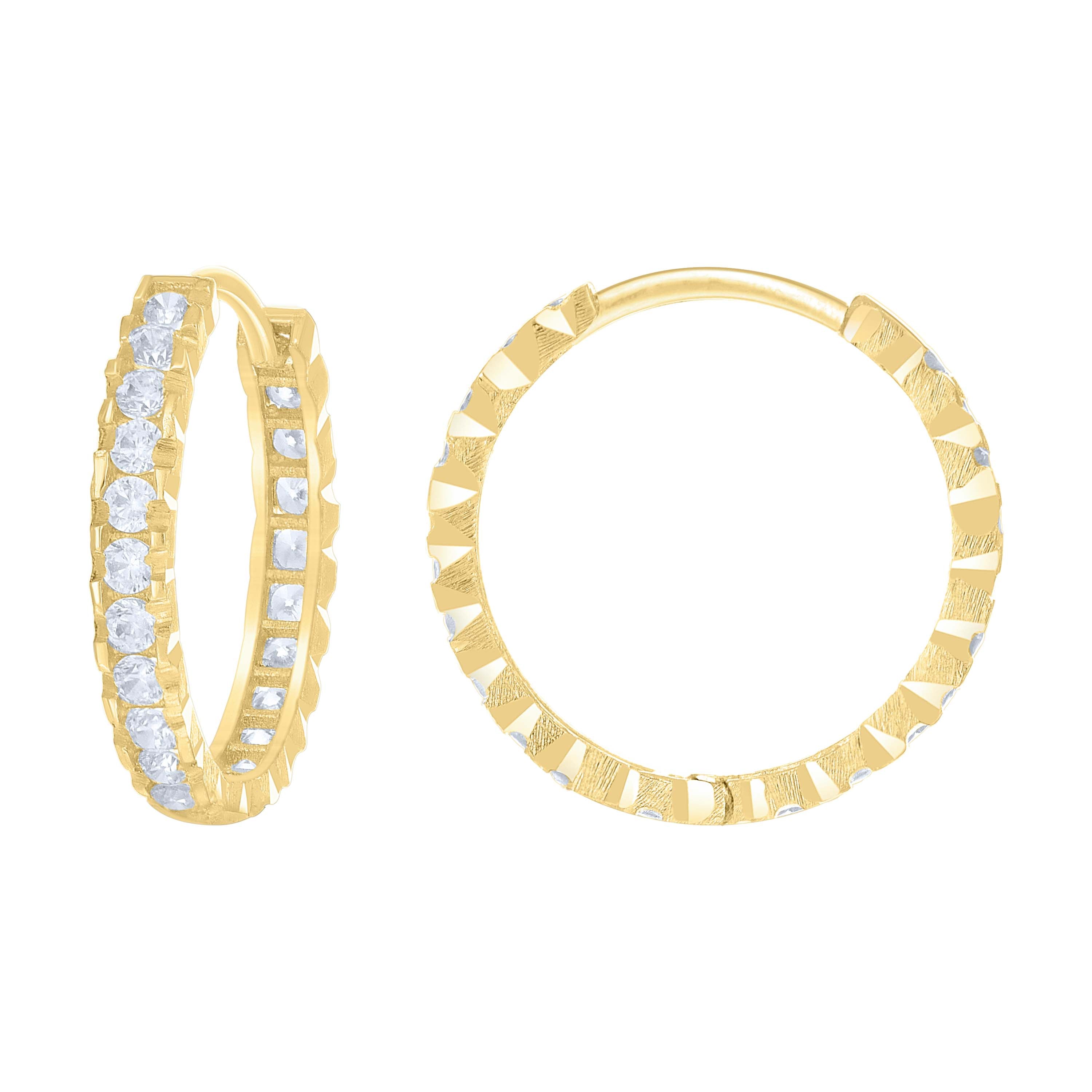 Elevate your style with these exquisite 14kt Yellow Gold Women's Cubic-Zirconia Fashion Hoop Earrings. Featuring a stunning diamond-cut finish, these lightweight 1-gram hoops shimmer with elegance. The channel-set round white cubic zirconia adds a touch of sparkle, perfect for any occasion. With an endless closure, they offer a seamless and secure fit. Measuring 15.1MM in height and 15.4MM in width, these hoops are a chic and sophisticated addition to your jewelry collection.