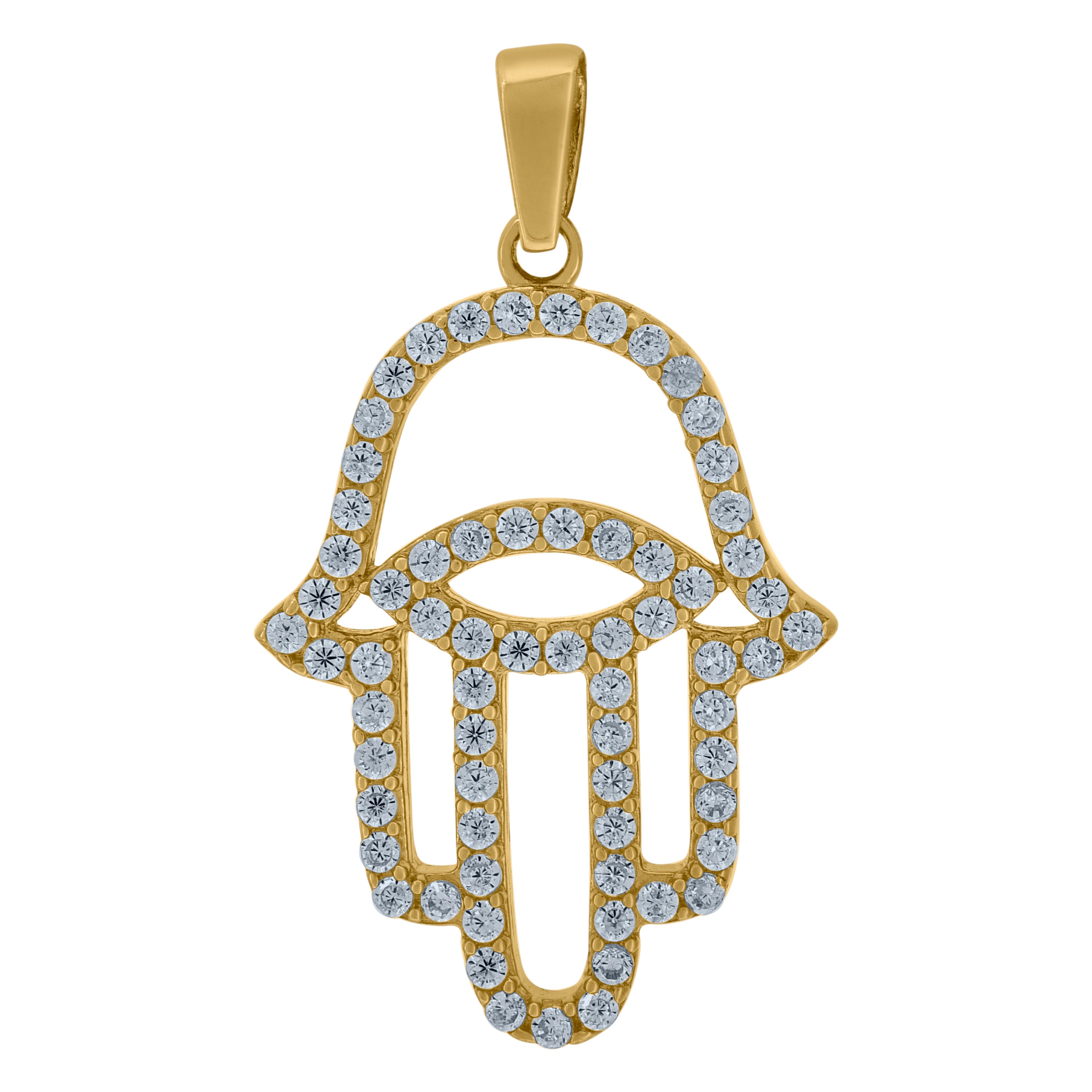 Elevate your style with this exquisite 14Kt Yellow Gold Hand of Humsa Charm Pendant. Weighing a delicate 1.4 grams, this polished piece features a stunning white round cubic zirconia set in a secure prong setting. Measuring 26mm in height and 15mm in width, it boasts a single bail closure for easy wear. Perfect for adding a touch of elegance and spiritual symbolism to any ensemble.