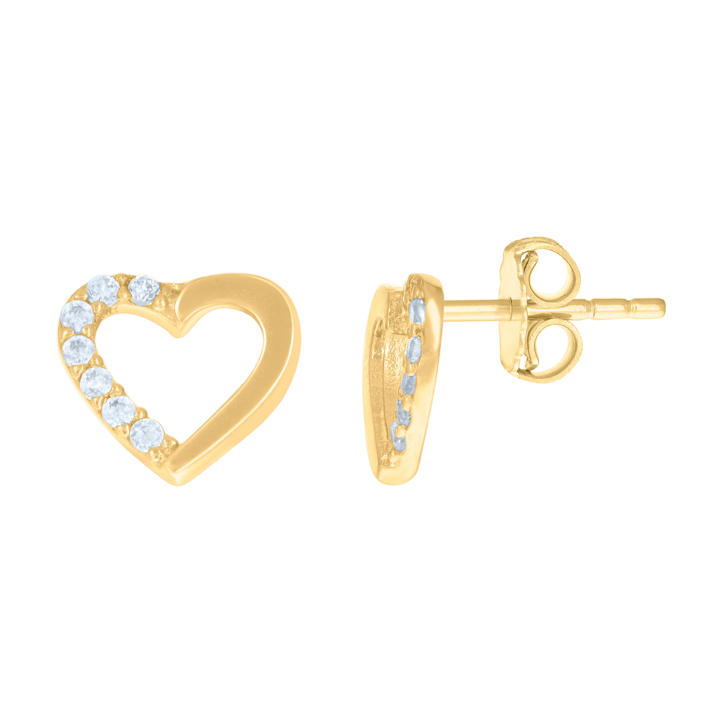 Dazzling and elegant, these 14kt Yellow Gold Women's Cubic-Zirconia Heart Stud Earrings are a must-have for any jewelry collection. Weighing just 1.1 grams, each earring features a brilliant round white cubic-zirconia stone, expertly set in a secure prong setting for maximum sparkle. The polished finish enhances the luxurious look, while the push-back closure ensures a comfortable and secure fit. Measuring 7.6mm in height and 8mm in width, these charming heart-shaped studs add a touch of romance and sophistication to any ensemble.