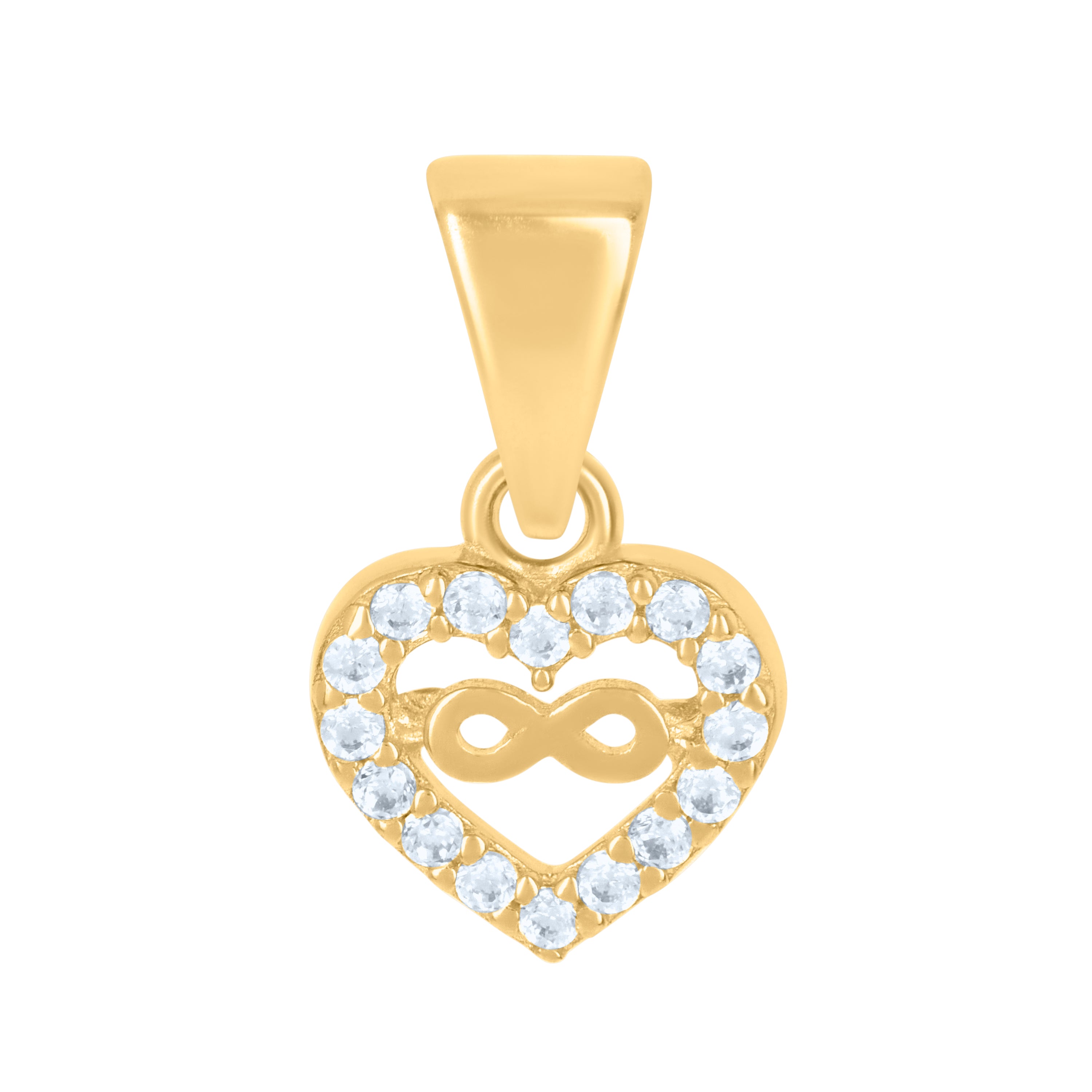 Embrace timeless elegance with this 14Kt Yellow Gold Women's Infinity Heart Charm Pendant. Weighing just 0.6 grams, its polished finish radiates sophistication. The 13.9MM height and 7.9MM width create a delicate yet striking piece, ensuring it sits beautifully around your neck. Adorned with a radiant white round cubic-zirconia, securely set in prong, this pendant captures light brilliantly. The single bail closure offers easy wear, making it a perfect accessory for any occasion, embodying love and infinity in a stunning design.