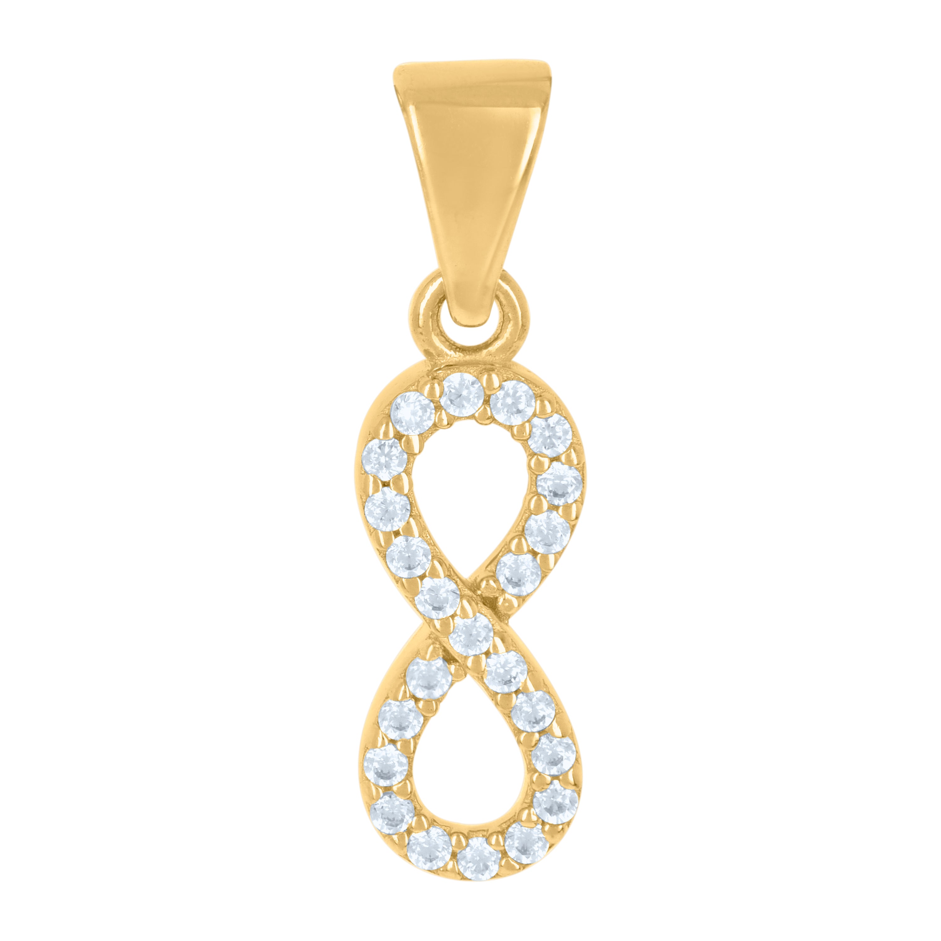 Embrace timeless elegance with this 14Kt Yellow Gold Infinity Love Symbol Charm Pendant. Weighing a delicate 0.8 grams, its polished finish gleams with sophistication. The pendant features a single bail for effortless wear, measuring 20.4MM in height and 5.7MM in width. Adorned with a round, prong-set white Cubic Zirconia, this piece captures light beautifully, adding a touch of sparkle to any ensemble. Perfect for expressing eternal love, this pendant is a must-have for any jewelry collection.