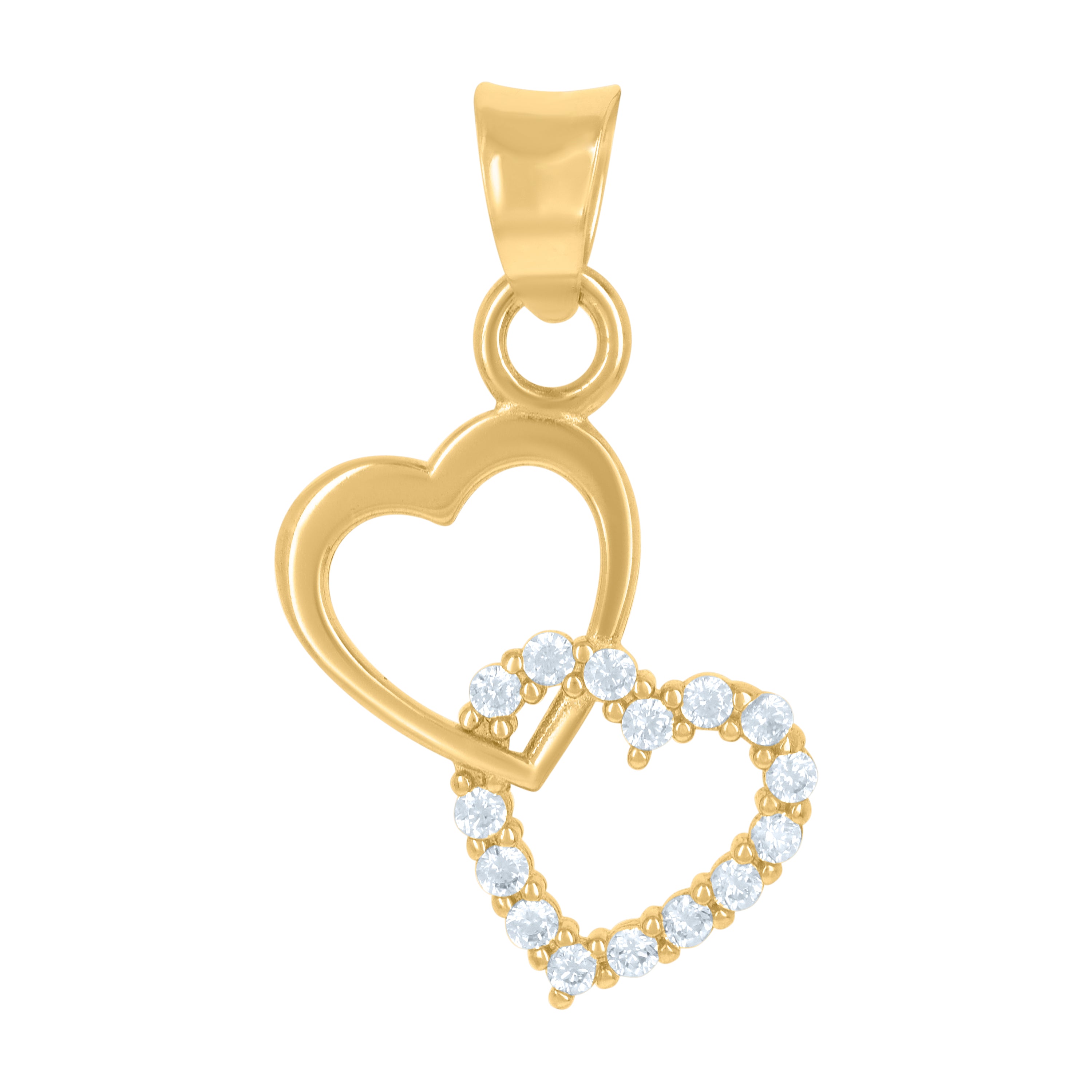 Add a touch of elegance to your ensemble with our 14Kt Yellow Gold Women's Cubic-Zirconia Intertwined Hearts Charm Pendant. Weighing a delicate 0.9 grams, this polished treasure features intertwined hearts adorned with dazzling white round cubic zirconia in prong settings. Measuring 24.4mm in height and 14.2mm in width, this charming pendant is secured by a single bail, making it the perfect symbol of love and sophistication for any occasion.