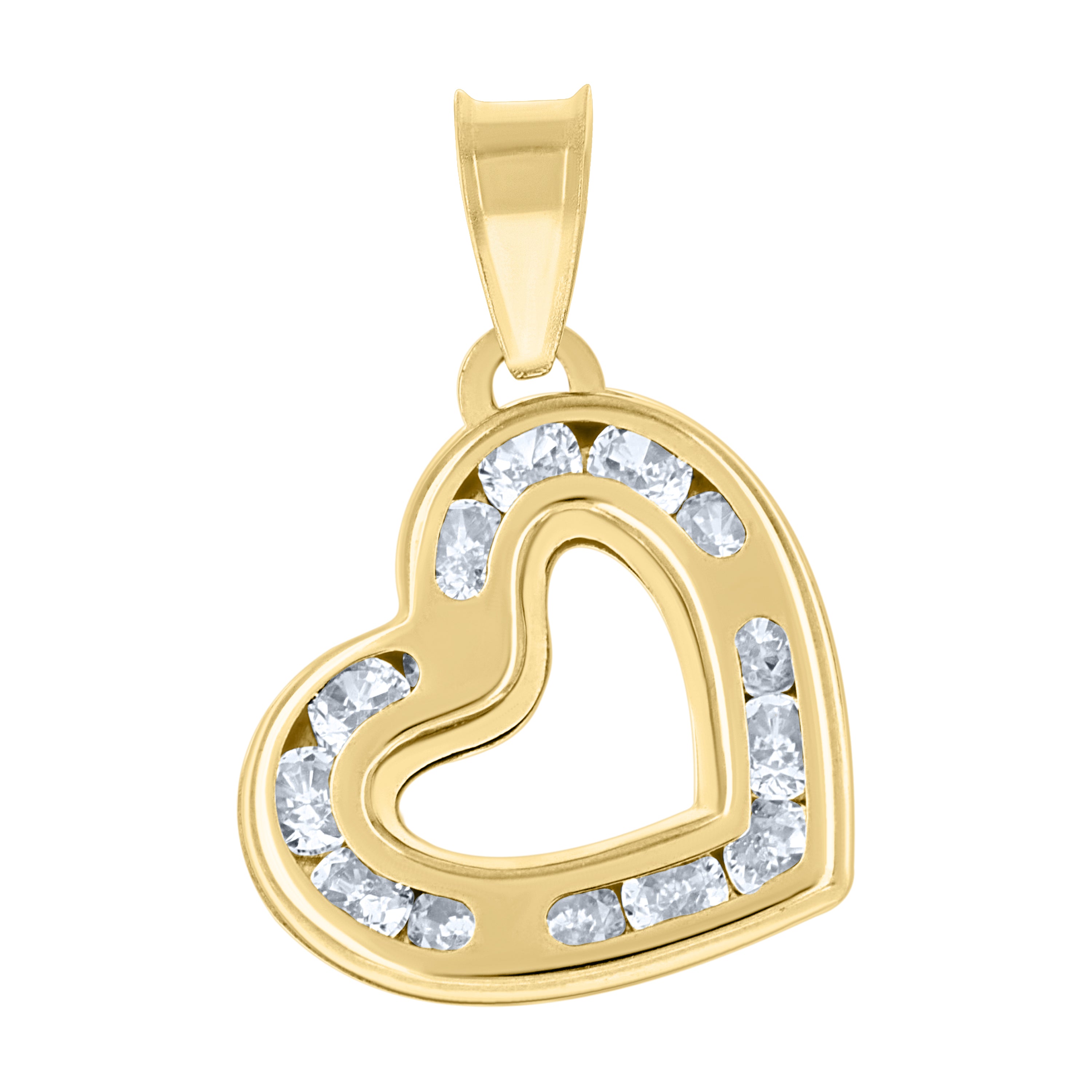 Embrace elegance with this exquisite 14Kt Yellow Gold Love Heart Charm Pendant. Weighing a delicate 0.57 grams, this polished beauty features a dazzling white round cubic zirconia set in a sleek channel setting. Measuring 17.7MM in height and 12.5MM in width, it hangs gracefully from a single bail, making it a perfect symbol of love and sophistication. Ideal for adding a touch of sparkle to any ensemble.