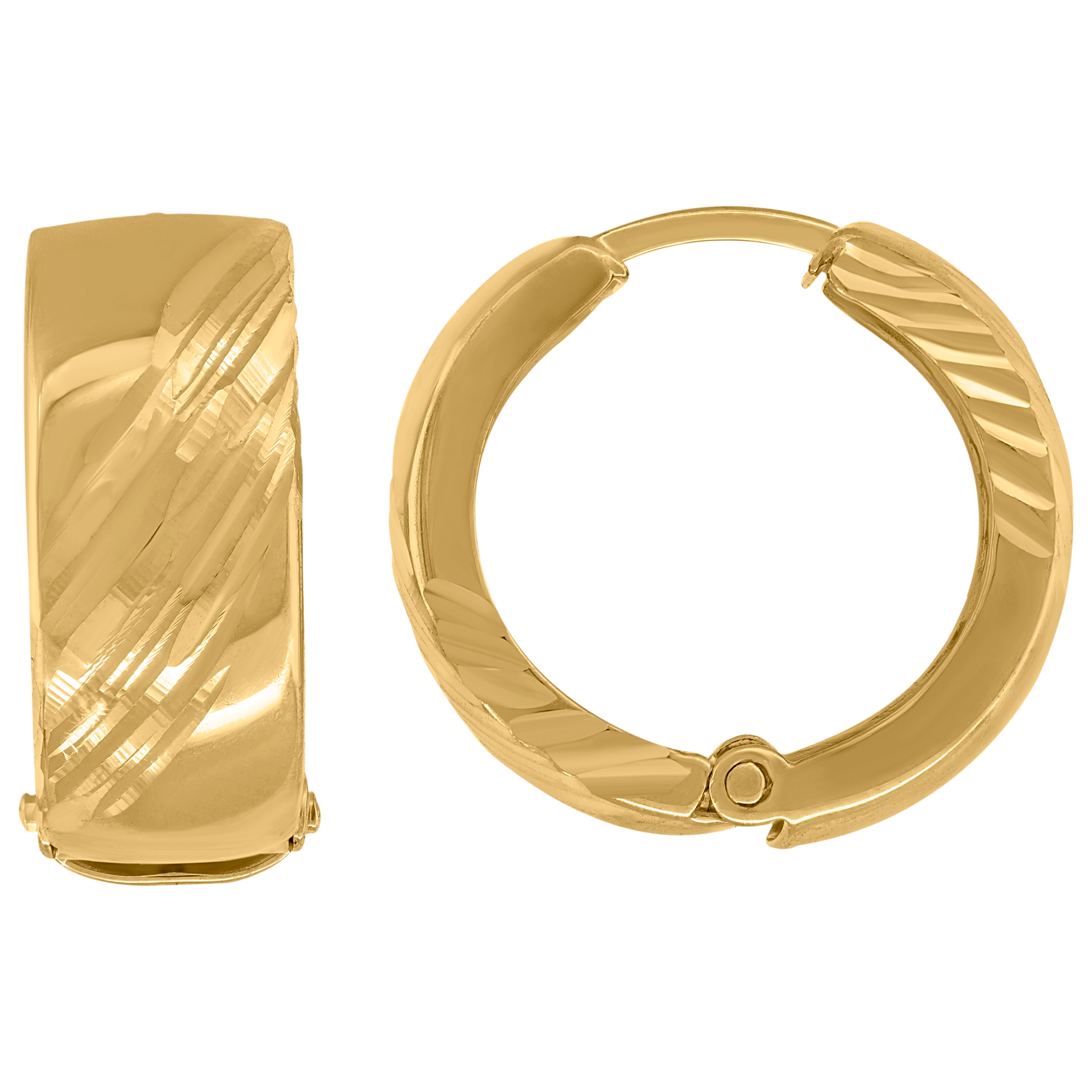 Elevate your elegance with these 14Kt Yellow Gold Diamond-Cut Huggie Hoop Earrings. Crafted with precision, their intricate diamond-cut finish sparkles with every movement. Measuring 17MM in height and width, these hoops offer a timeless design that enhances any ensemble. The endless closure ensures a secure and comfortable fit, making them perfect for any occasion. Weighing a delicate 3.1 grams, they provide a luxurious feel without the weight. Embrace the simplicity and sophistication of these exquisite earrings, a must-have addition to your jewelry collection.