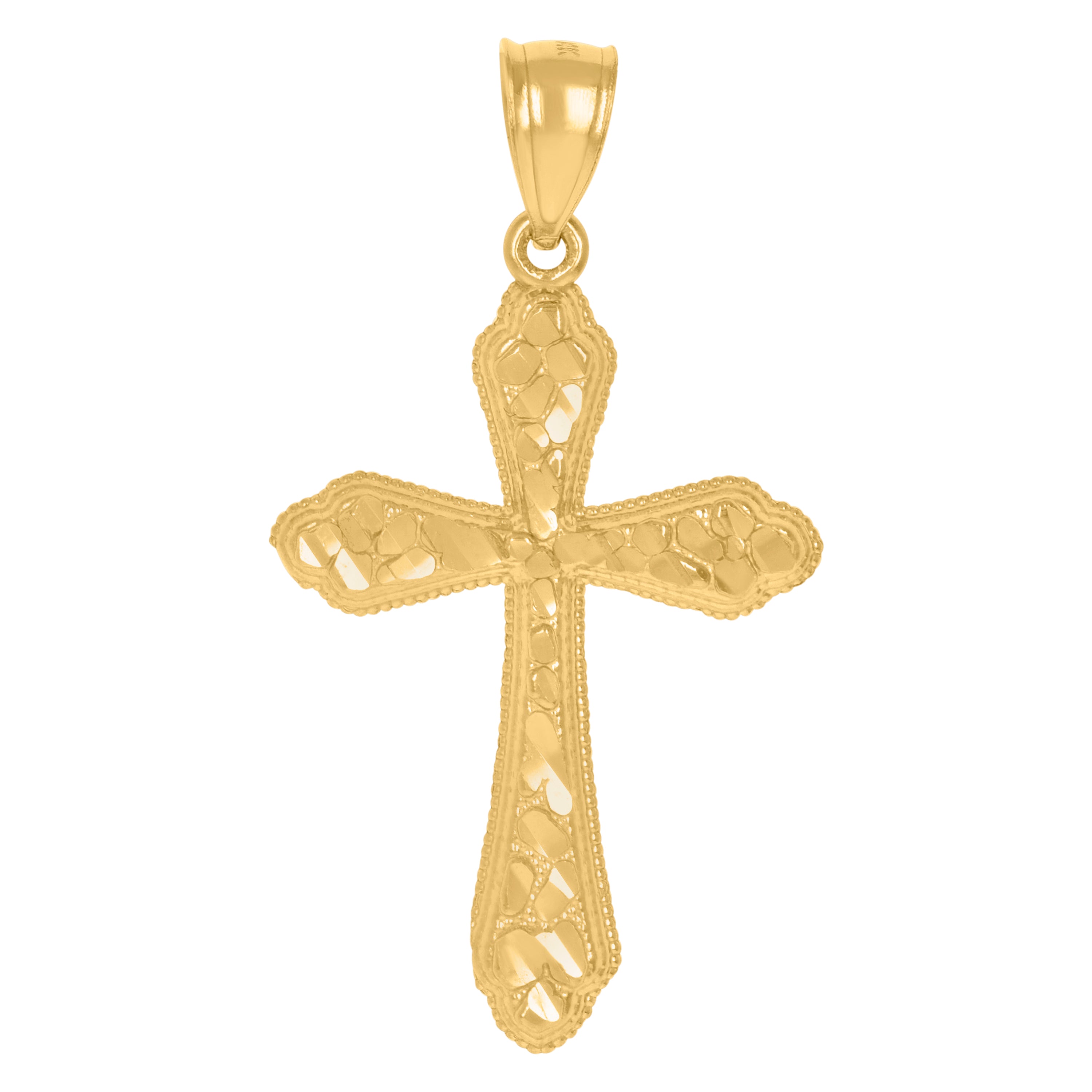 Embrace elegance with our 14Kt Yellow Gold Women's Diamond-Cut Nugget Budded Cross Pendant. This exquisite religious charm, weighing a delicate 1.9 grams, features a stunning nugget finish that exudes sophistication. Its 40.1mm height and 21.2mm width make it a standout piece, perfect for daily wear or special occasions. The single bail closure ensures a secure fit, allowing you to showcase your faith with style and grace.