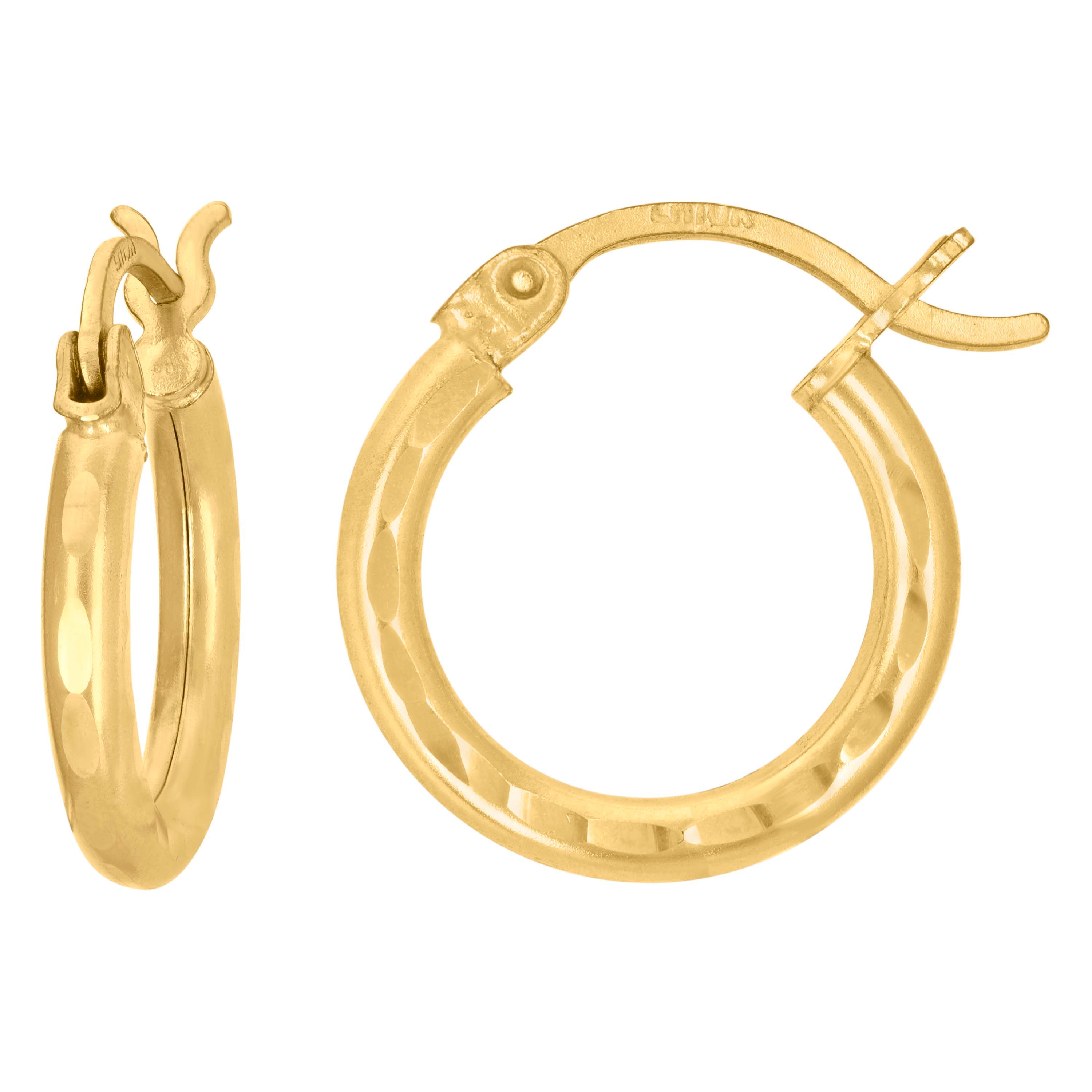 Elevate your everyday style with these 14Kt yellow gold hoop earrings, crafted in a sleek round tube design with a dazzling diamond-cut finish for extra sparkle. Lightweight at approximately 1.5 grams, they measure 15 mm in diameter and 2 mm in width—perfect for effortless, all-day wear. The secure hinged back closure ensures easy on and off, while the clean, CZ-free design highlights the beauty of genuine gold. A timeless essential for any jewelry collection.