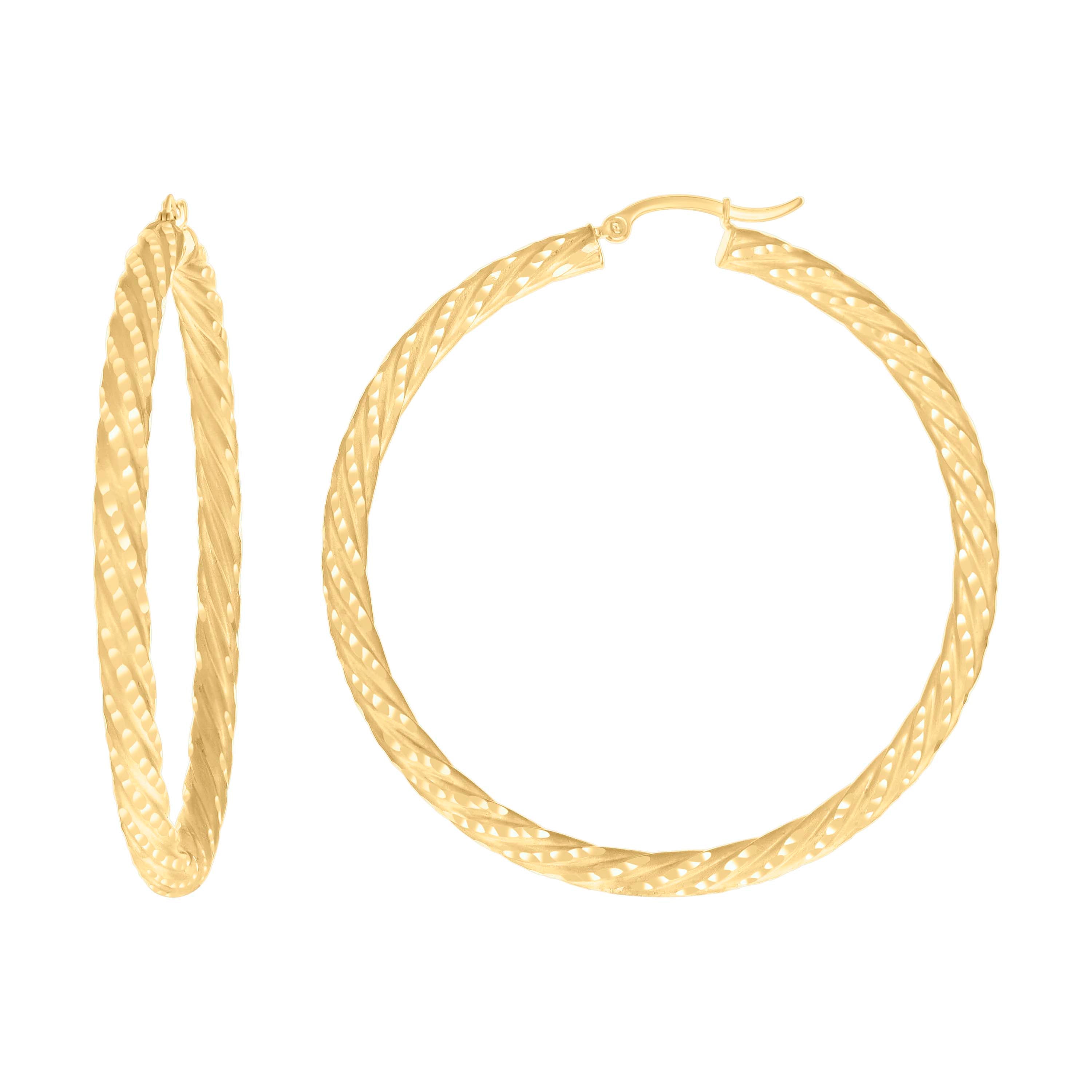 Elevate your everyday shine with these 14kt yellow gold women’s hoop earrings, crafted in a lightweight-yet-substantial 7.2 grams. A sophisticated twisted silhouette is enhanced by a diamond-cut, spotted patterned finish that catches the light from every angle. Measuring 57 mm in height and 4 mm in width, they offer a bold, polished presence without overwhelming. The secure hinged back clasp ensures easy, comfortable wear all day. Chic, modern, and timeless—these fancy hoops deliver luxe sparkle without CZ, letting the brilliance of genuine gold take center stage.