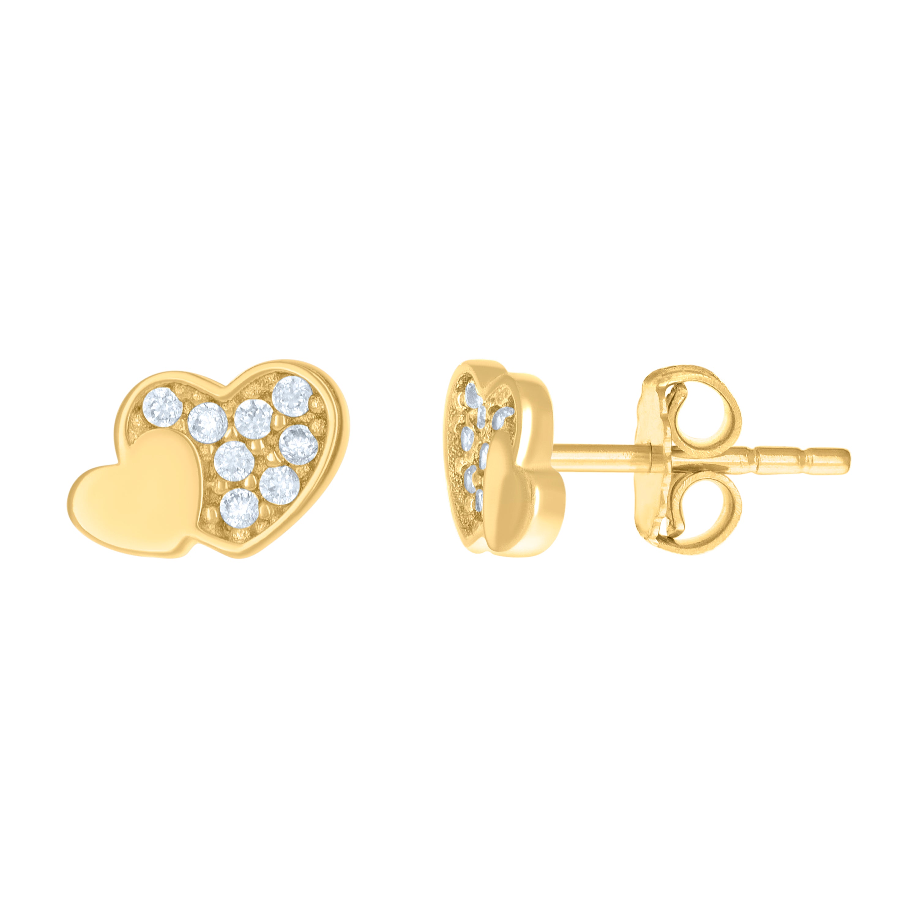 Dazzle with elegance in these 14kt Yellow Gold Women's Double Hearts Stud Earrings. Weighing just 0.9 grams, these polished beauties feature a stunning prong-set round white Cubic Zirconia, offering a sparkling touch to any ensemble. The 5.4MM height and 8MM width provide a delicate yet impactful look, secured with convenient push-back closures. Perfect for adding a romantic flair to your style.