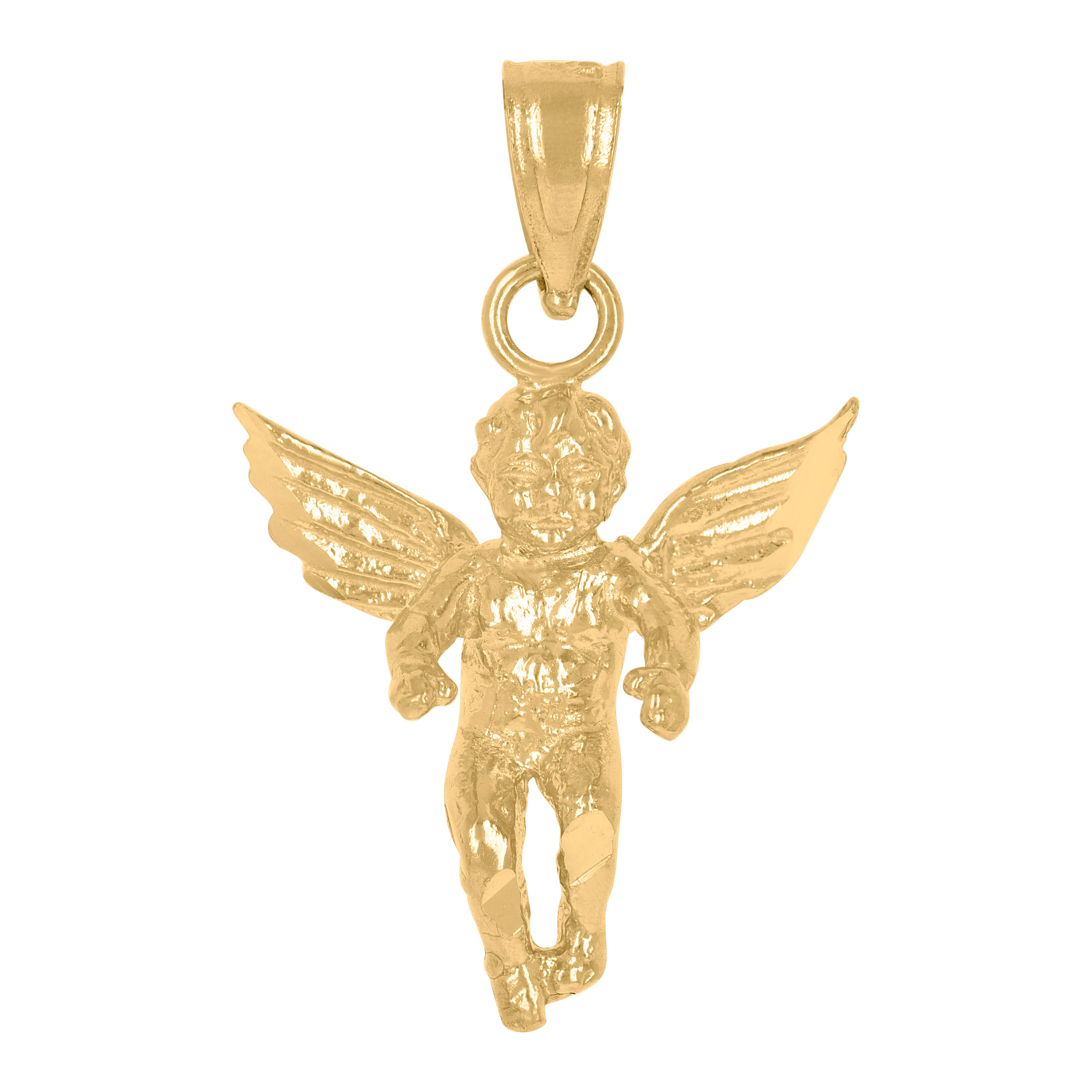 Embrace the divine with this exquisite 14Kt Yellow Gold Women's Flying Angel Pendant. Crafted with meticulous attention to detail, this textured charm embodies grace and spirituality. Measuring 22.1MM in height and 14.1MM in width, its elegant design is perfect for any occasion. The single bail ensures a secure fit, allowing this heavenly piece to dangle beautifully from your favorite chain. A symbol of protection and faith, this angel pendant is a timeless treasure for your jewelry collection.